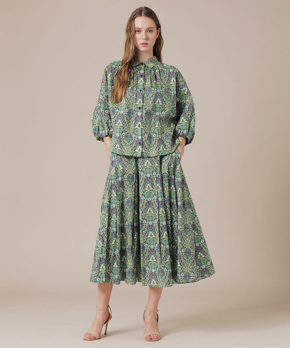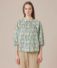 袖口にゴムでギャザーを入れた袖コンシャスのブラウスです。衿ぐりのタックから裾に向けて広がるシルエットでリラックス感があります。同素材のスカート(品番:G5S14753)とセットアップでワンピースの様に着用していただけます。