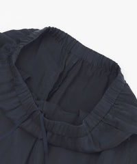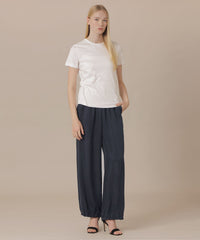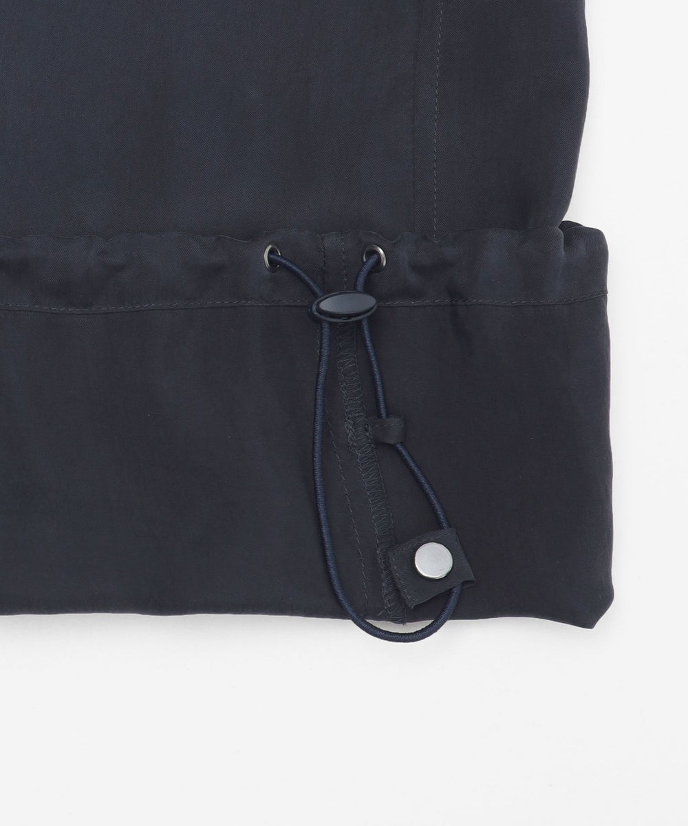 裾のドローストリングの絞り加減により、スタイリングに合わせてシルエットをさまざまにアレンジしてお楽しみいただけるパンツです。カジュアルスタイルにはもちろん、ブラウスなどのきれい目なアイテムと合わせてテイストをミックスしたスタイリングもおすすめです。裏地なしです。