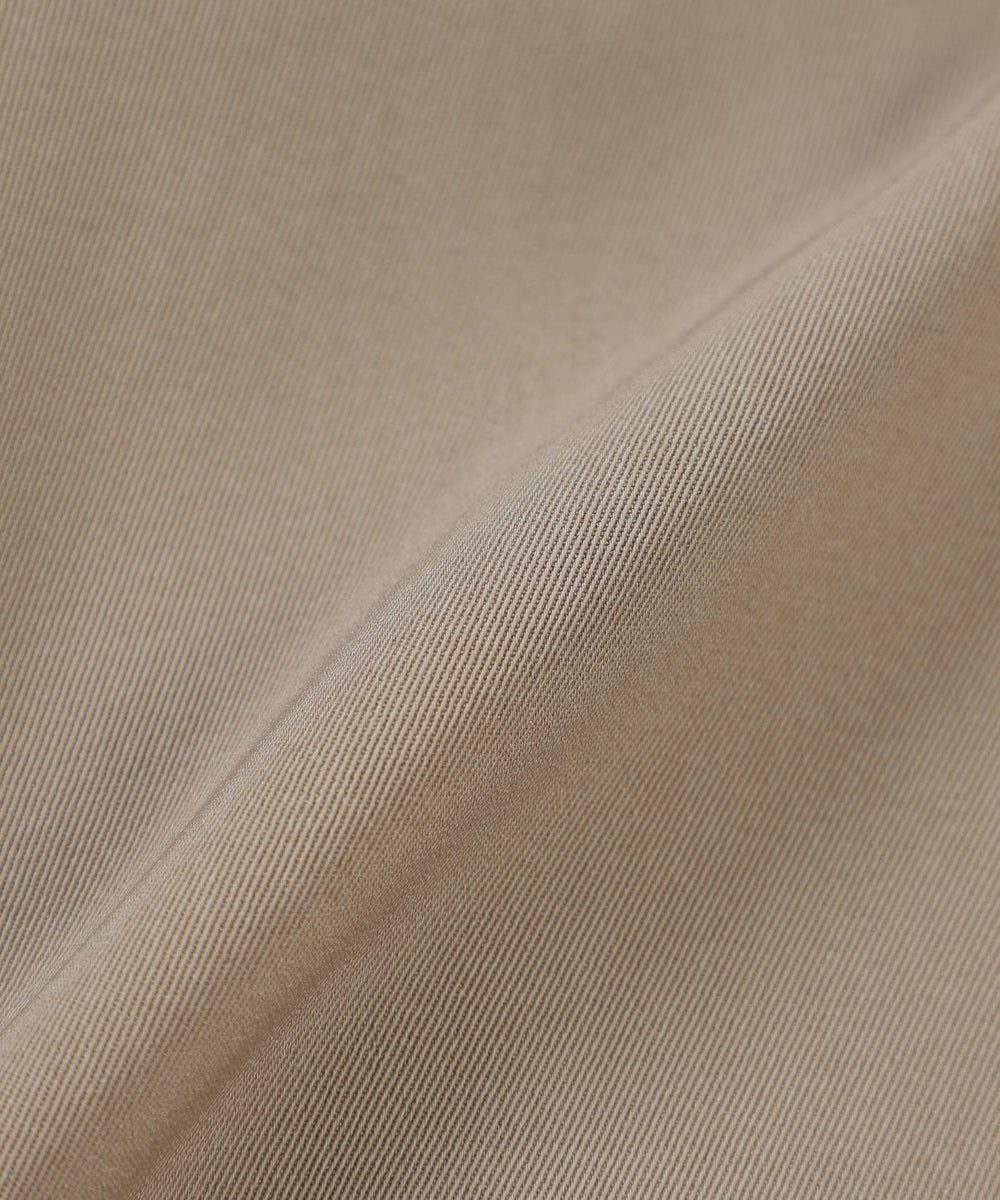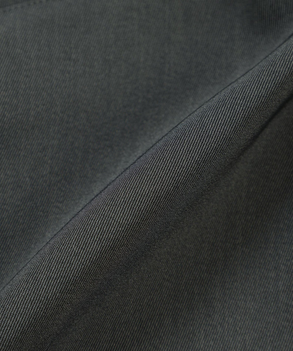 強撚糸を使用した軽量でストレッチ性のある合繊ツイル素材です。上品な光沢とシャリ感に、肌離れの良いドライな風合いが特徴です。