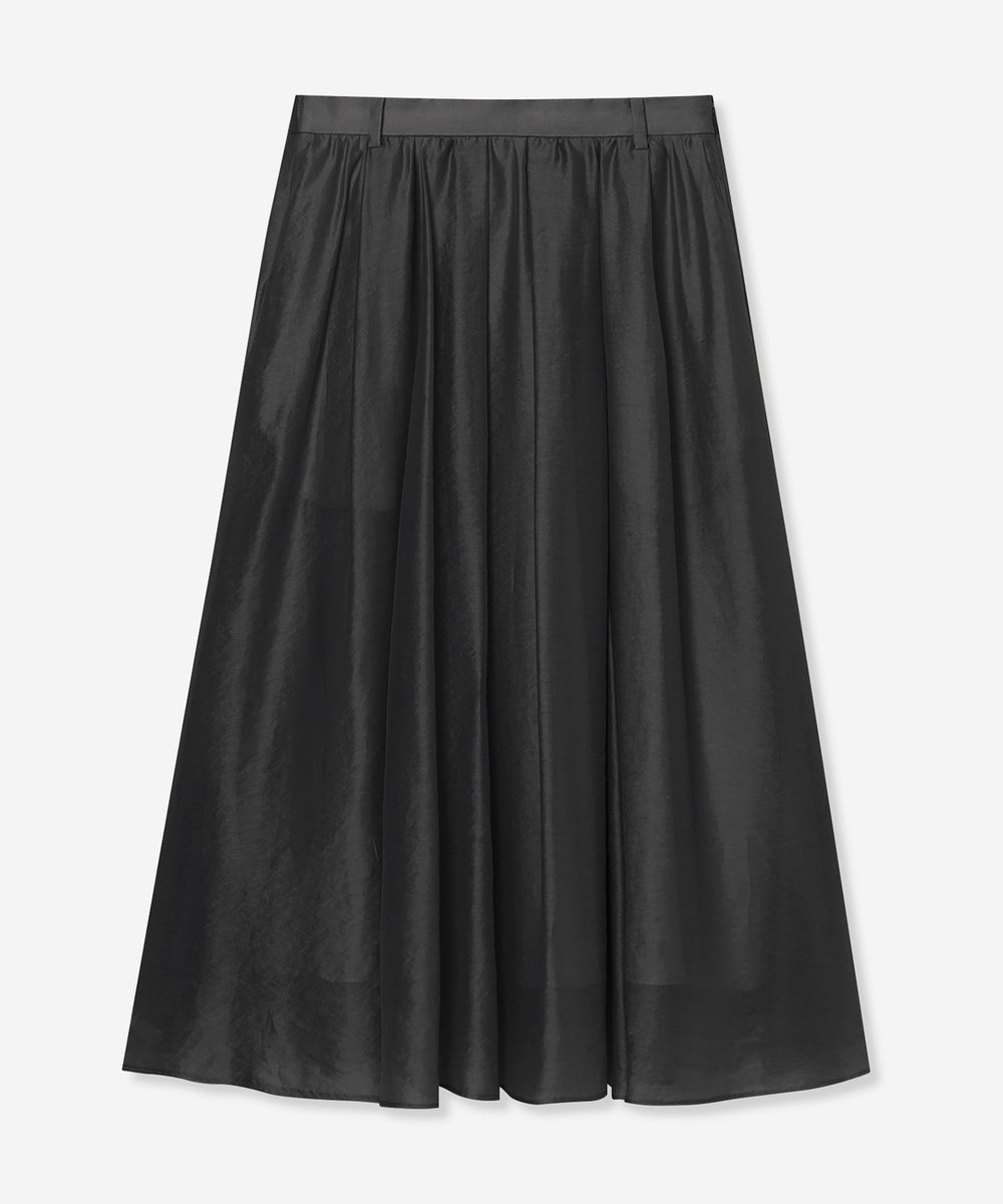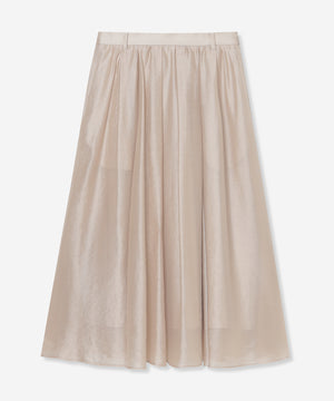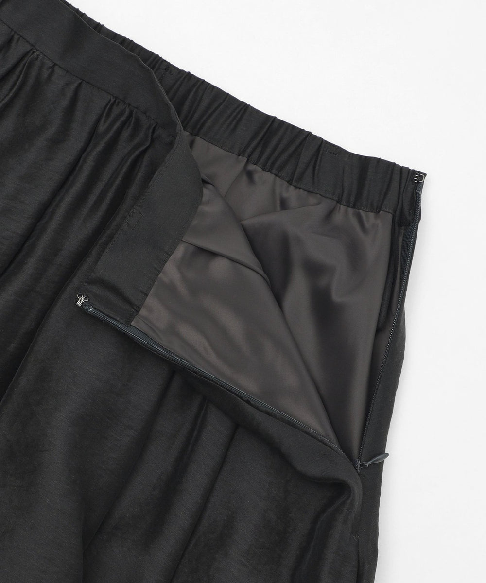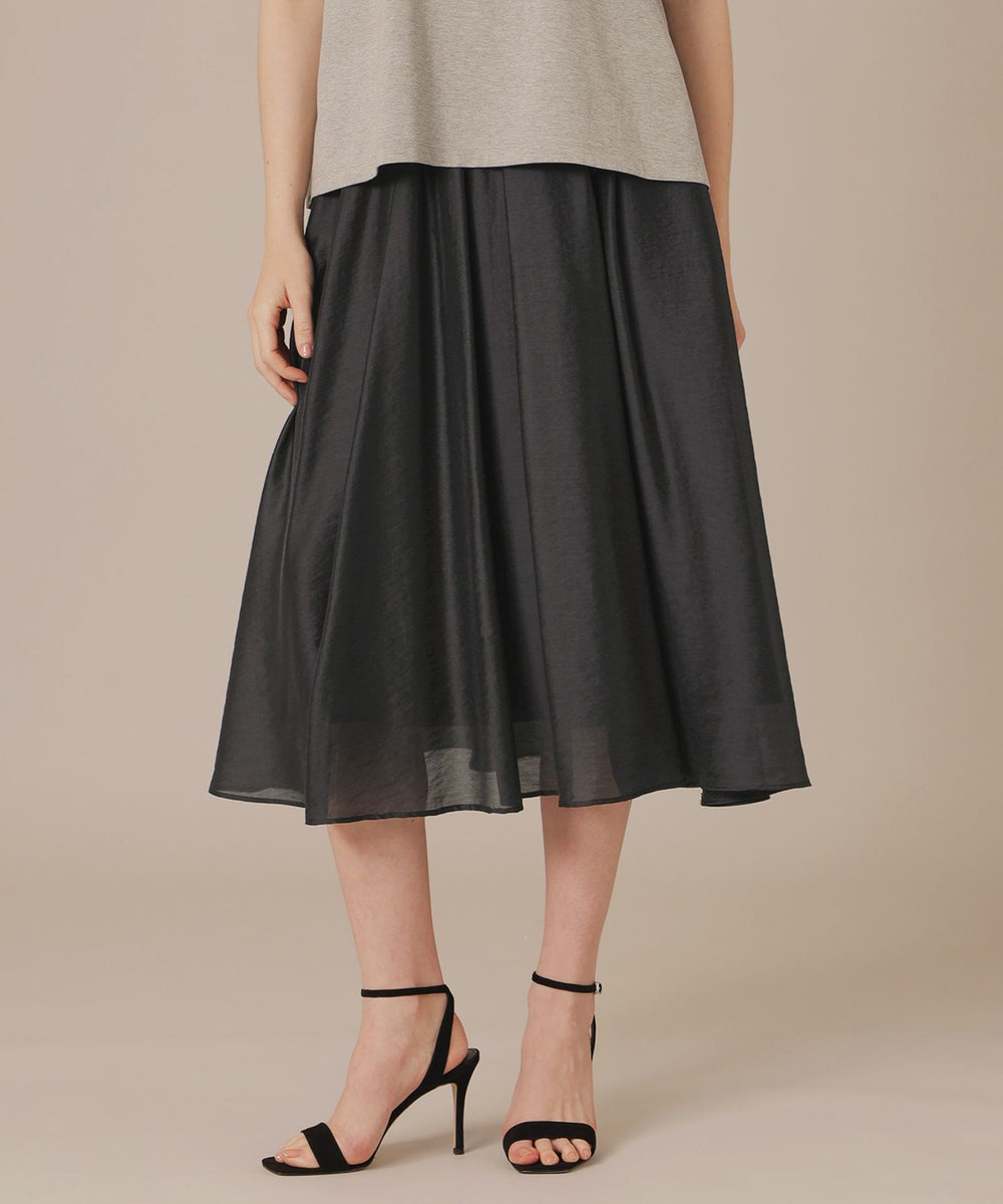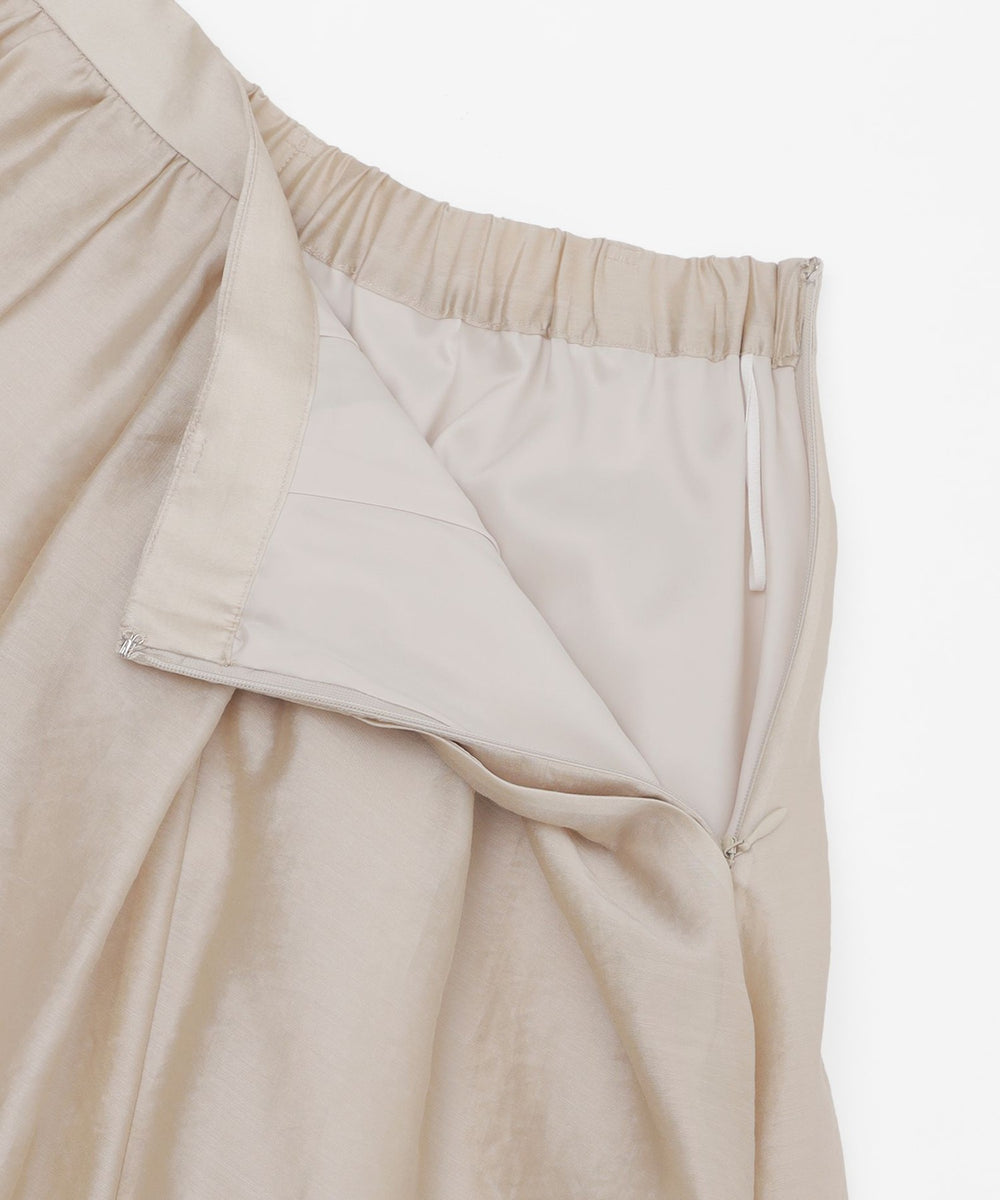 生地の柔らかさを活かしたタックギャザーが、ふんわりと広がるシルエットのスカートです。薄く軽いスカートで暑い夏のワードローブに活躍するアイテムです。シンプルなデザインでさまざまなトップスと合わせていただけます。