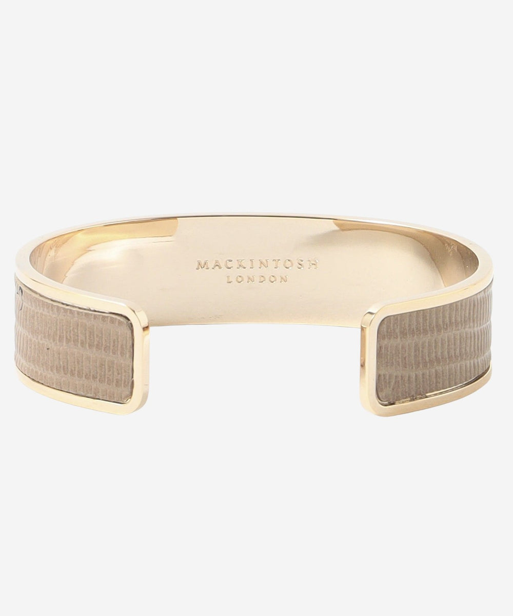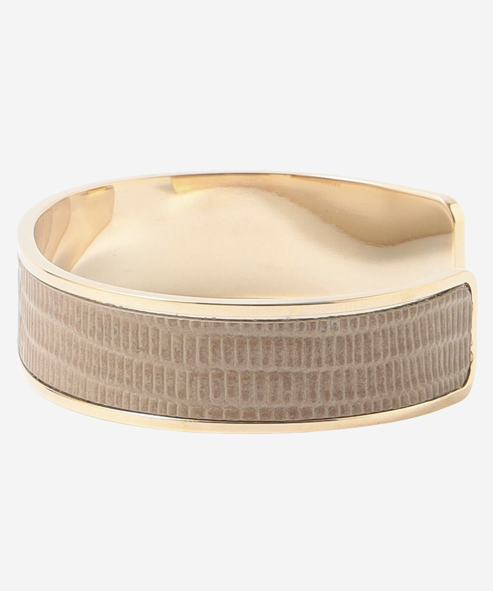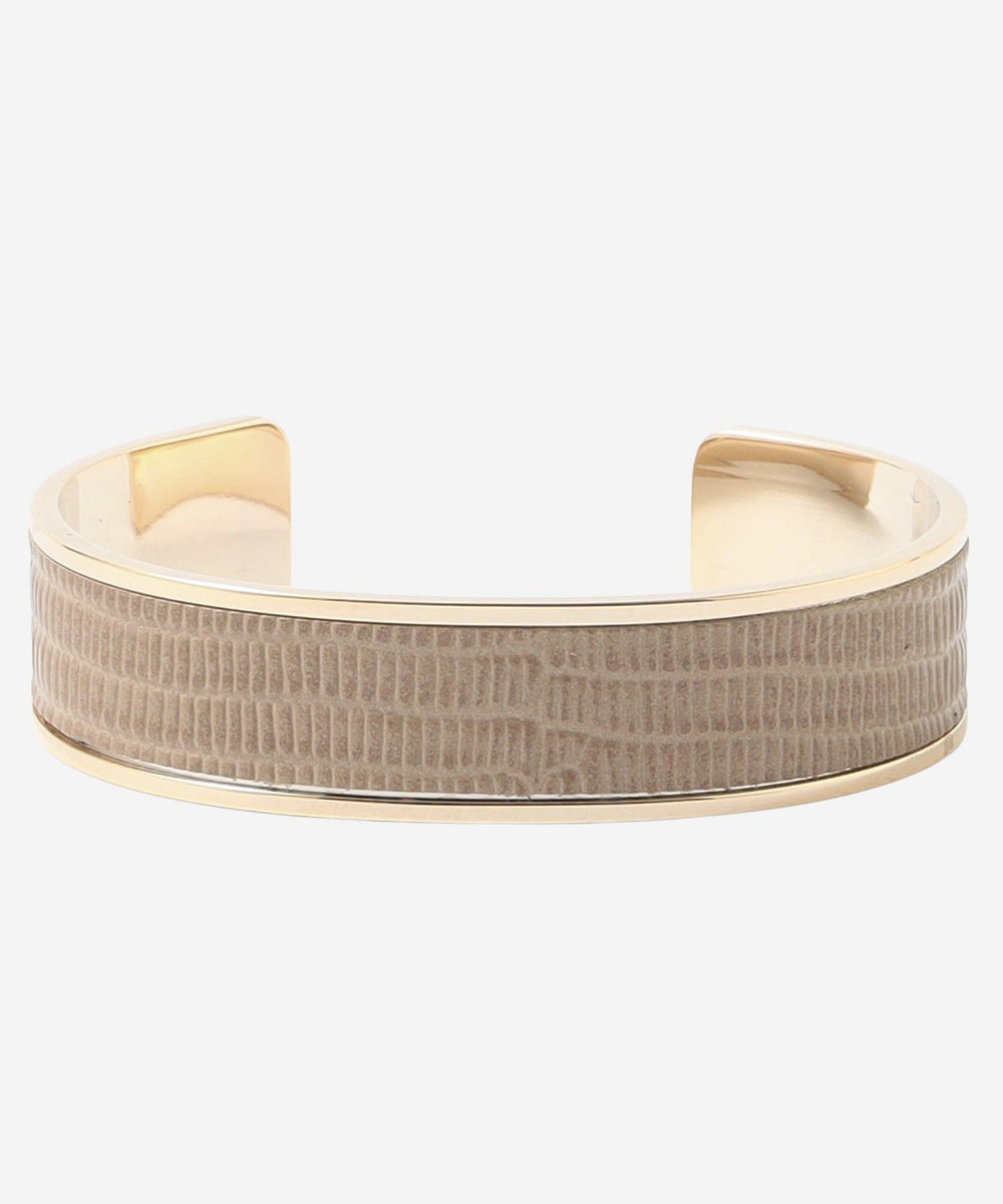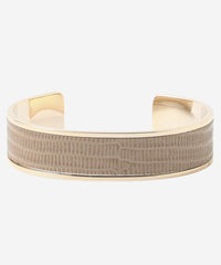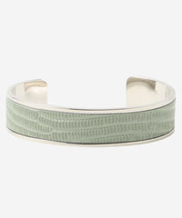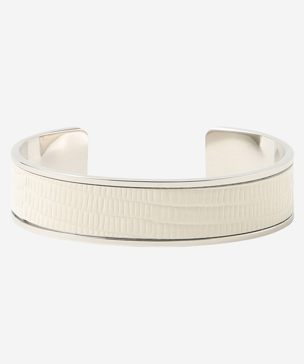 艶の美しいリザード型押レザーのバングルです。上品で軽やかなオフホワイト、ベージュ、セラドンの3色展開です。手首が見えるコーディネートのワンポイントになります。ニッケルフリーのメッキを施しています。お揃いの革のバッグ(G5107721)、ベルト(G5302702 03オフホワイト、40ベージュ、70グリーン)も展開しております。