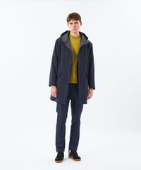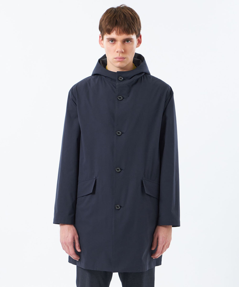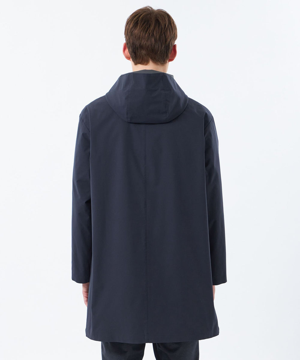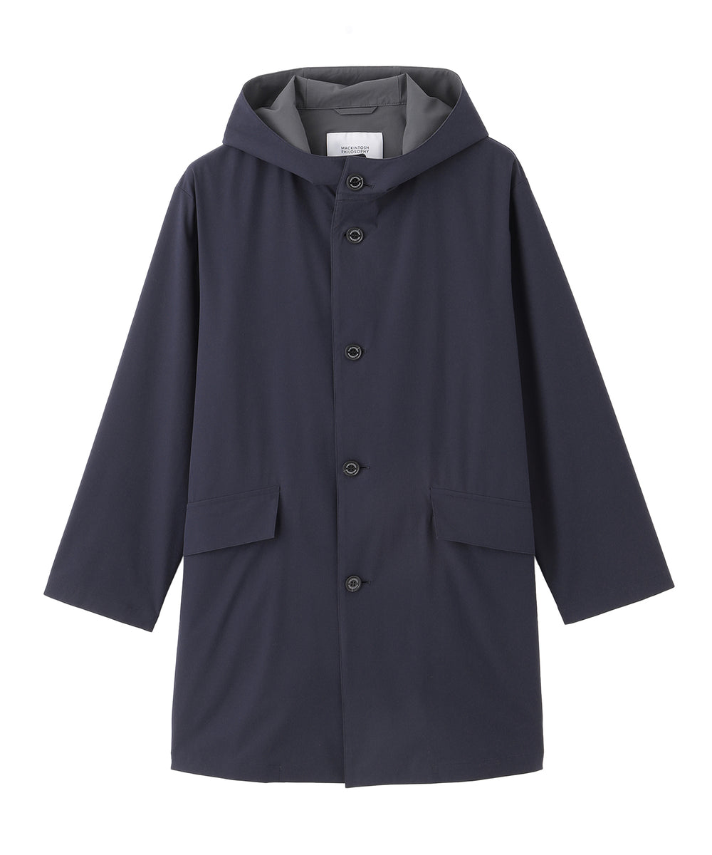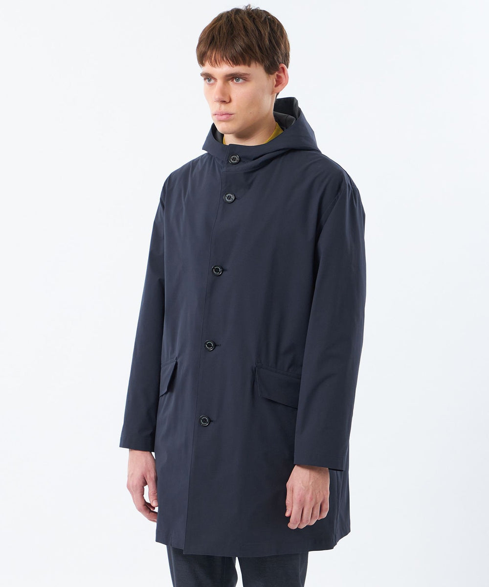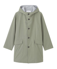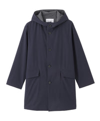 バイカラーの配色がアクセントとなるAラインシルエットのフーデッドコート