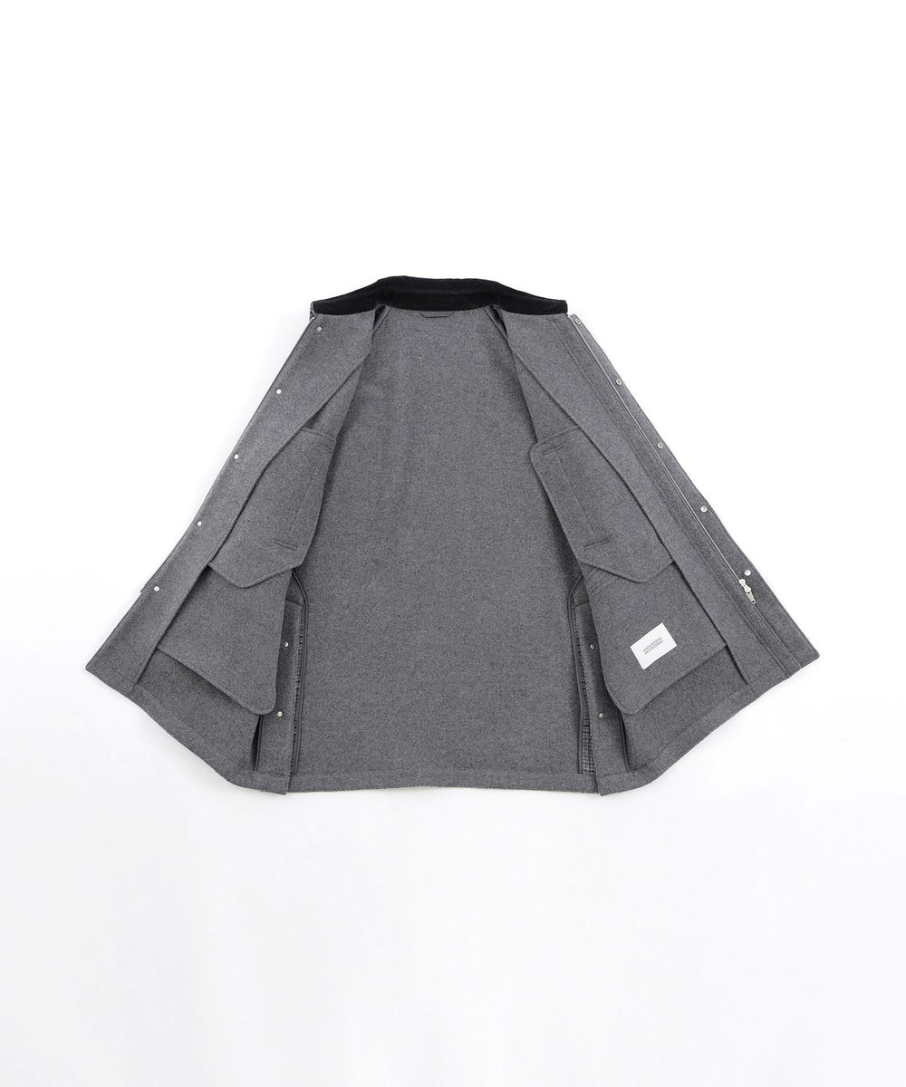 二重織ダブルフェイスモッサー生地を使用した、リラックス感のあるシルエットが魅力のハンティングアウター