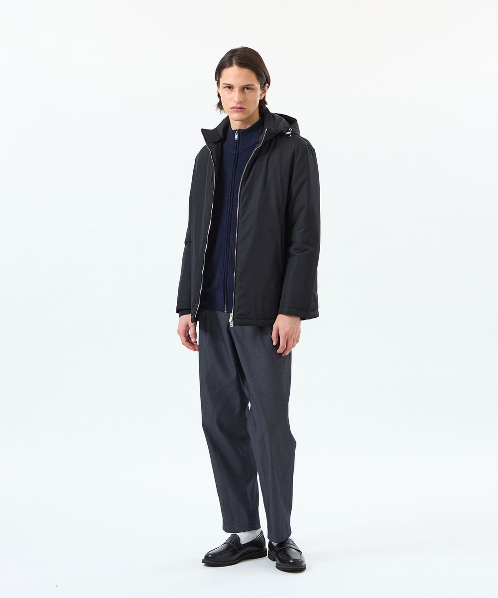 スタンドカラーとフーデッドの2WAY仕様で着こなせるコート、BELFAST(ベルファスト)のフロントジップタイプのショート丈アウター。フロントはオリジナルメタルファスナーで上質感を演出。軽量中綿(Heavenly Light Cloud)を使用し、しっかりと防寒性と保温性に優れていながらも、非常に軽量なコートに仕上がっています。