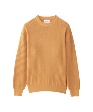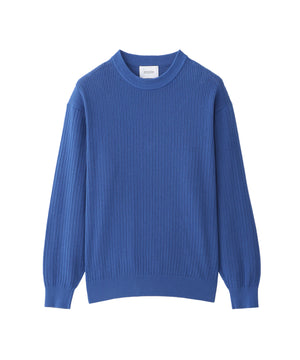 ゆったりとしたシルエットのクルーネックニットです。衿口の矢振り柄編地がデザインアクセントです。
