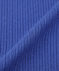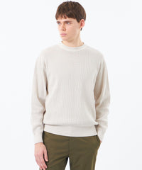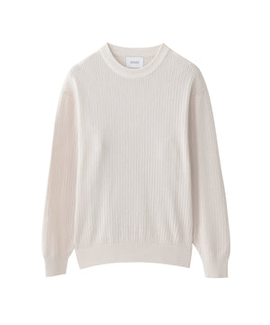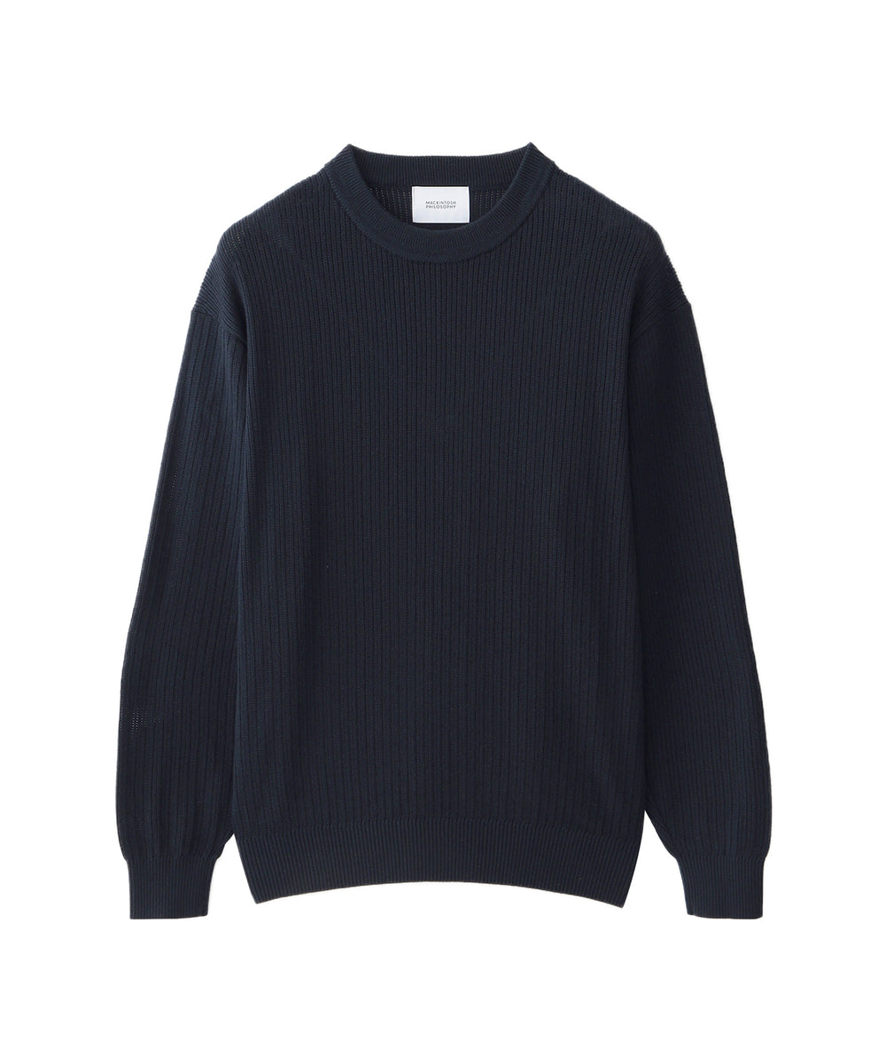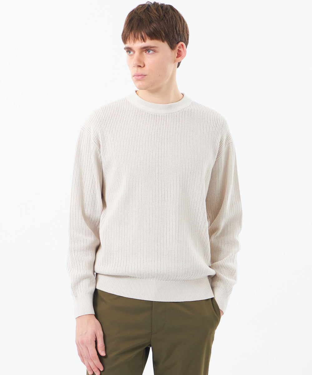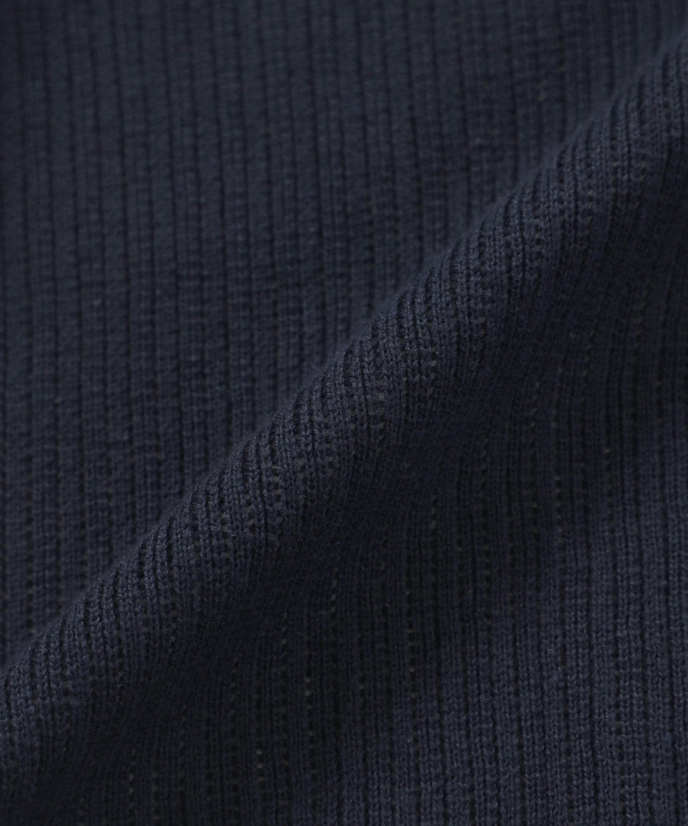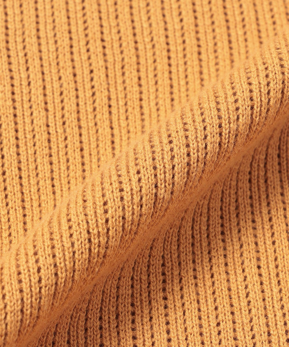 チクチク感のない綿100%の素材は、素肌の上からでも心地よく、着るほどに肌に馴染む柔らかさです。縦の畝(リブ)と規則的に入った細かな透かし目によって、風通しが良く熱がこもりにくいのが特徴です。きれい目な表情でカジュアルになりすぎない、大人の春ニットとして活躍します。