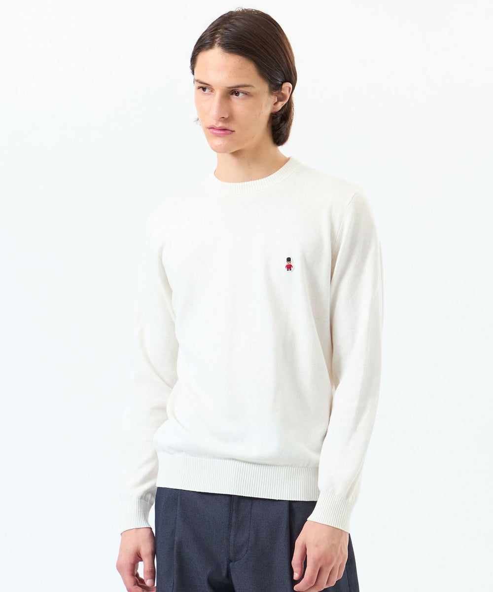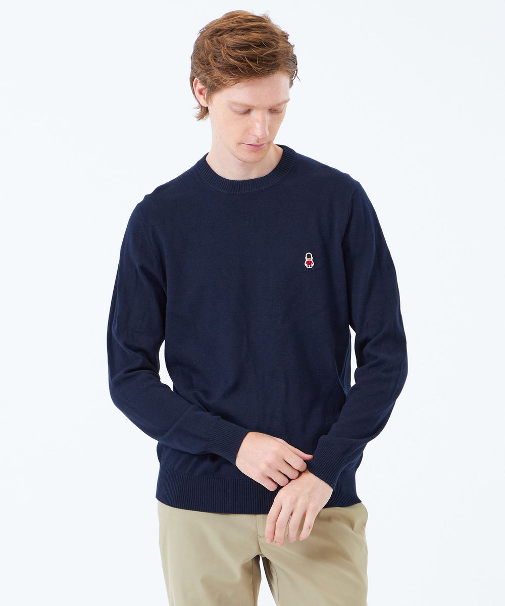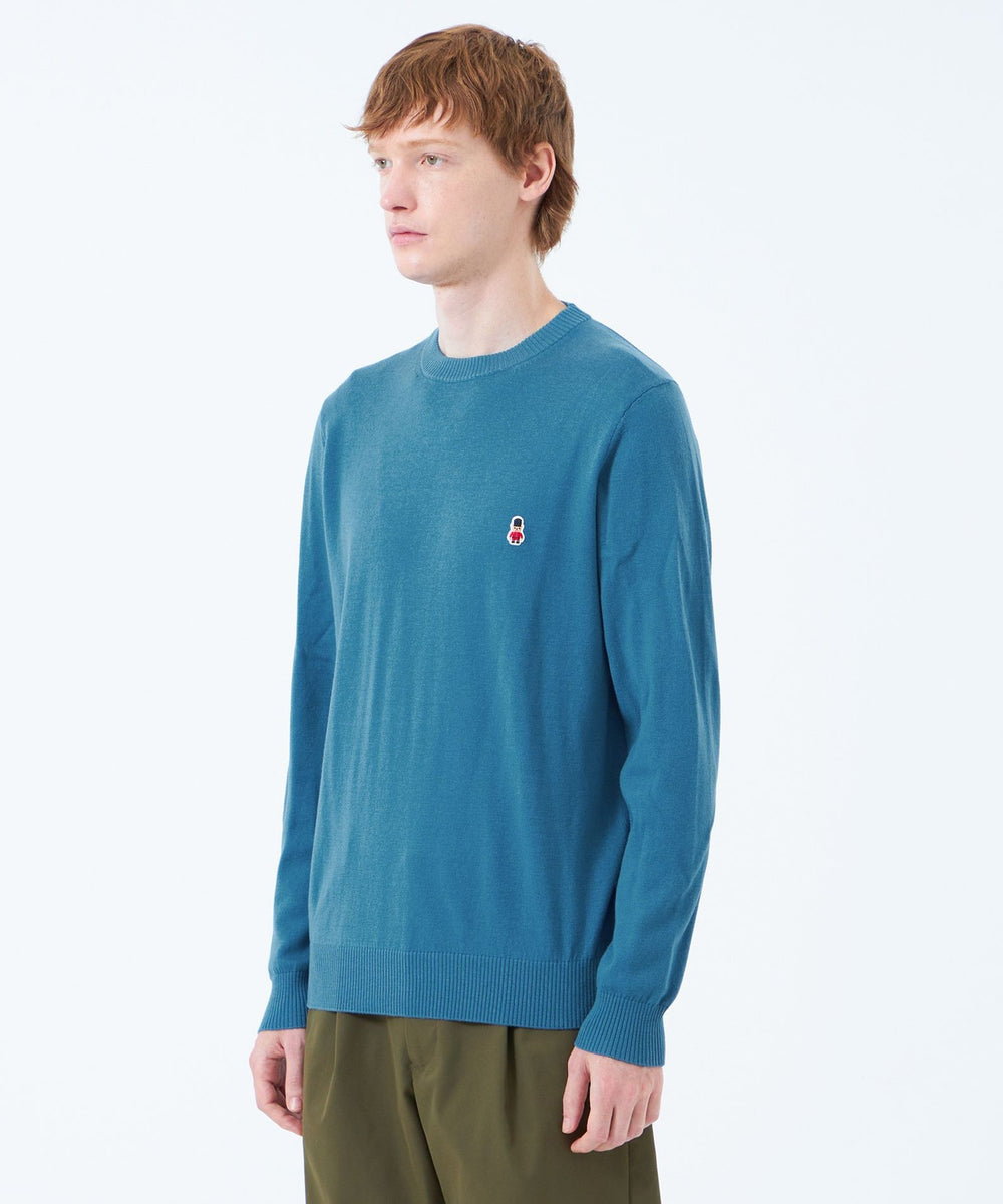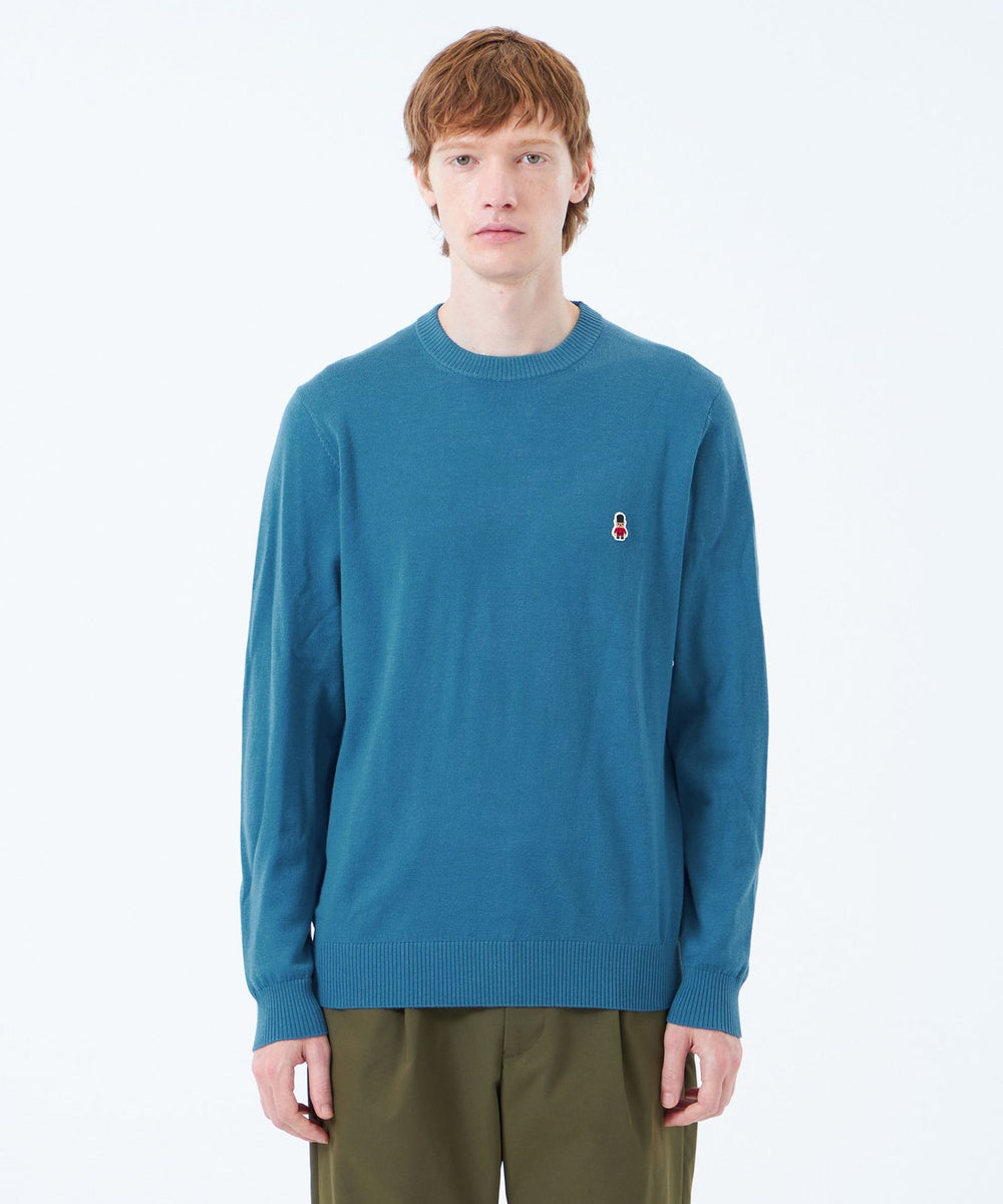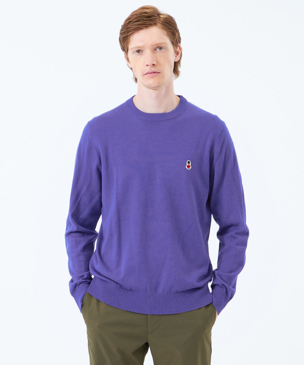 プレーンなクルーネックプルオーバーデザインのニットです。胸のBEARワッペンがワンポイントアクセント。共糸で展開しているカーディガンとのアンサンブルコーデもおすすめです。