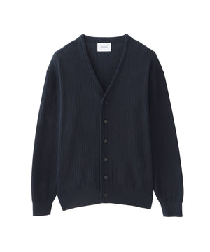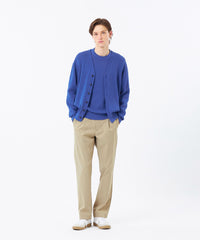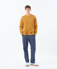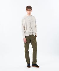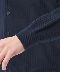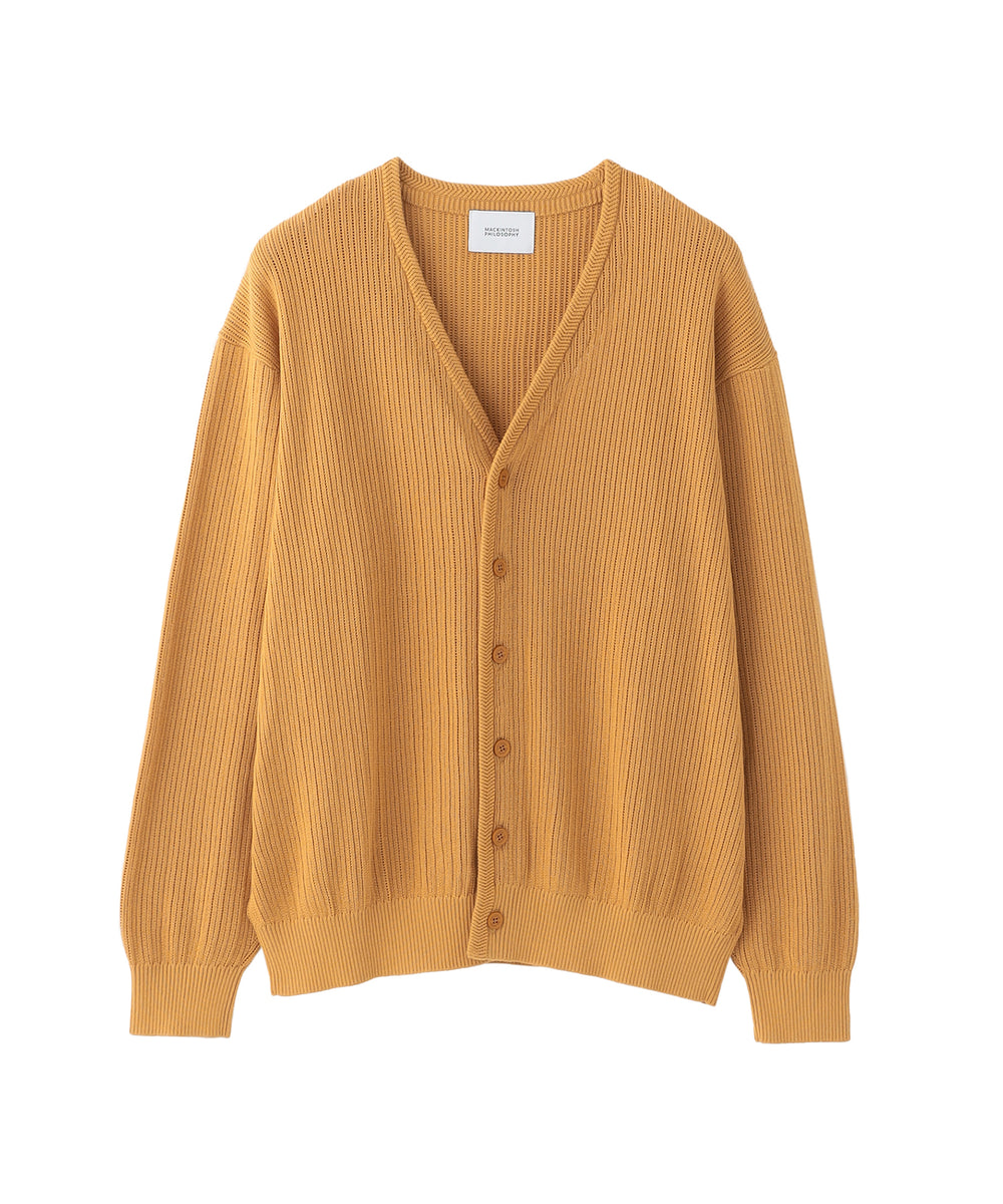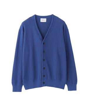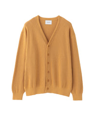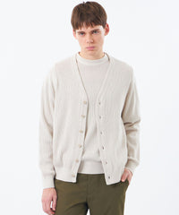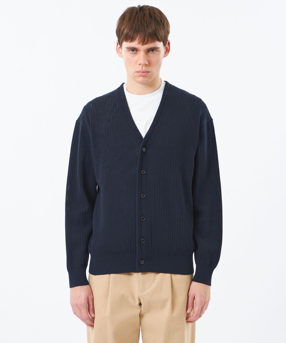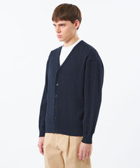 ゆったりとしたシルエットのVネックニットカーディガンです。前立ての矢振りの編み柄がプレーンなカーディガンデザインのアクセントになっています。フロントボタンの数をやや多めにしてクラシックな雰囲気です。