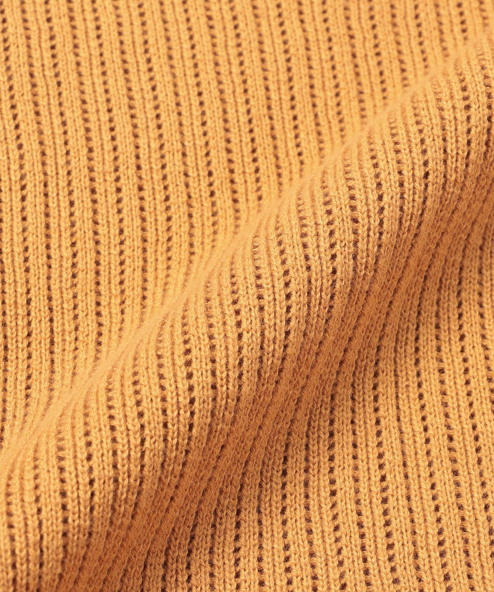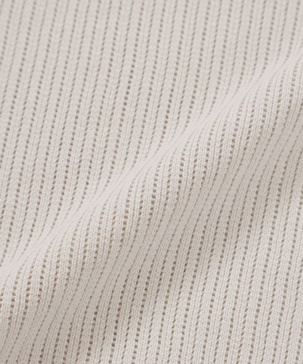 チクチク感のない綿100%の素材は、素肌の上からでも心地よく、着るほどに肌に馴染む柔らかさです。縦の畝(リブ)と規則的に入った細かな透かし目によって、風通しが良く熱がこもりにくいのが特徴です。きれい目な表情でカジュアルになりすぎない、大人の春ニットとして活躍します。