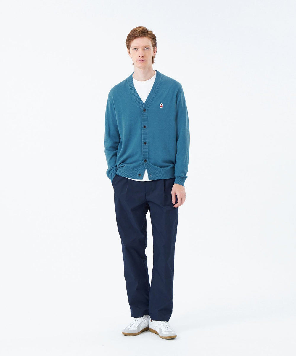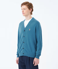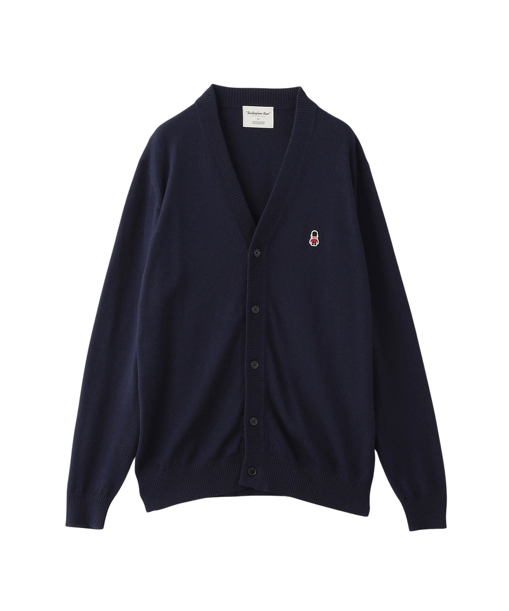 ボタンフロントのVネックカーディガンです。前立て、裾口/袖口はリブにしてややカジュアルに仕上げています。左胸のBEARワッペンがワンポイントアクセントになっています。共糸で展開しているクルーネックプルオーバーとのアンサンブルコーデもおすすめです。