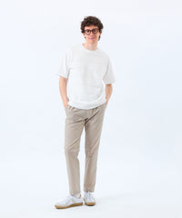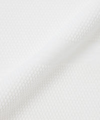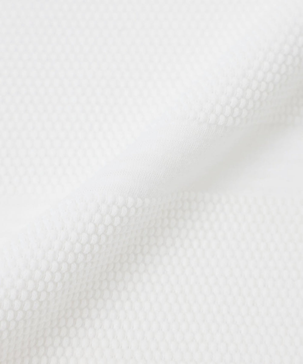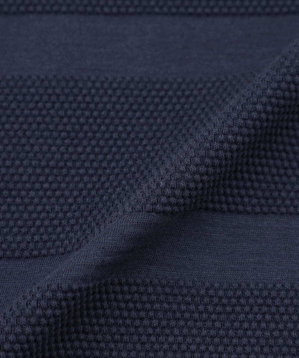 綿40/2の糸を使用し、フラットな天竺編みと凹凸感の有るポップコーン編みでボーダーを組んだジャカード編み地を使用しています。編み地に凹凸があるため肌離れがよく、さらりとした着心地です。また適度なストレッチ感もあり、着やすい素材です。