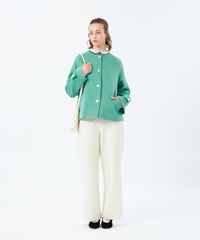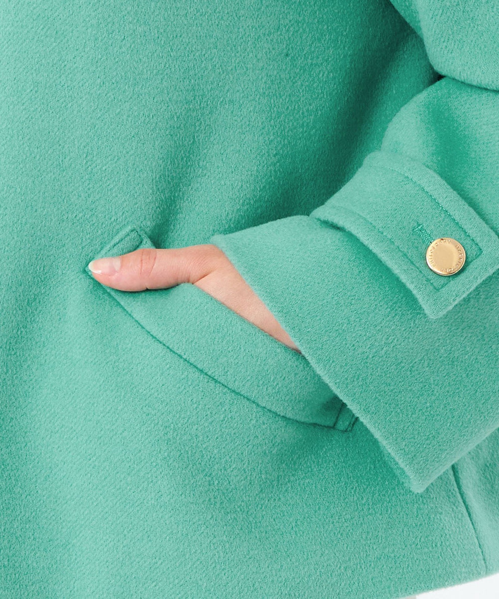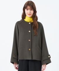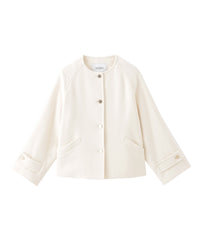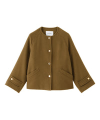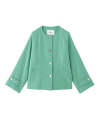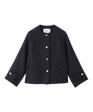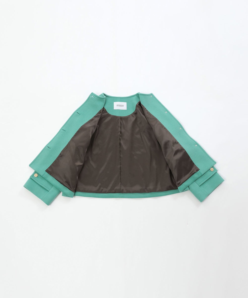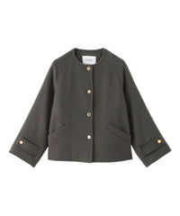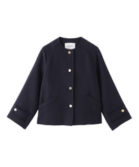 端正なフォルムにあしらわれたゴールドボタンが、ノーブルなムードを演出するノーカラータイプ。上目に配したフロントボタンのバランスで、全体的にコンパクトな印象に仕上げています。