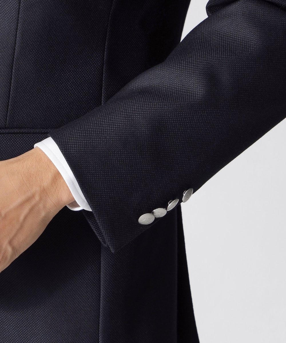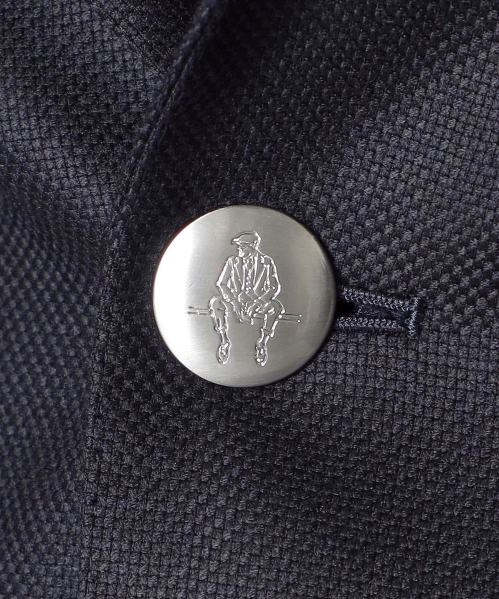 材料の真鍮を一枚のプレートから製作したシャープな印象のあるポールスチュアートオリジナルメタルボタンを使用。一般的な薄い材料を上下被せて作る通称「被せ」と一線を画して贅沢な厚みのある材料を1枚で型形成。ボタンの縁は職人の手で一つ一つ丁寧に磨かれ、裏面にはさわり心地に配慮して職人さんが一個一個目打ちした型を使用しています。