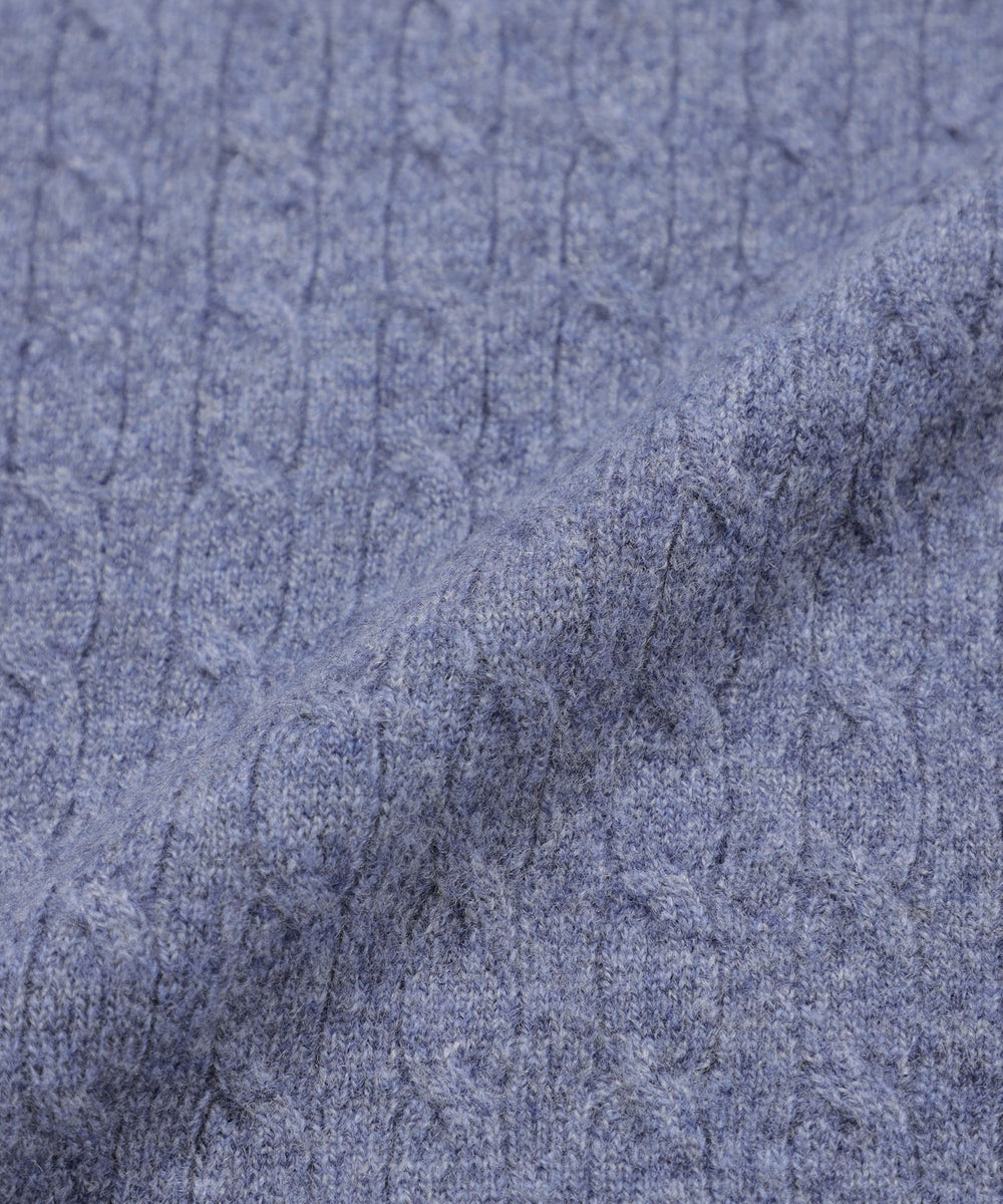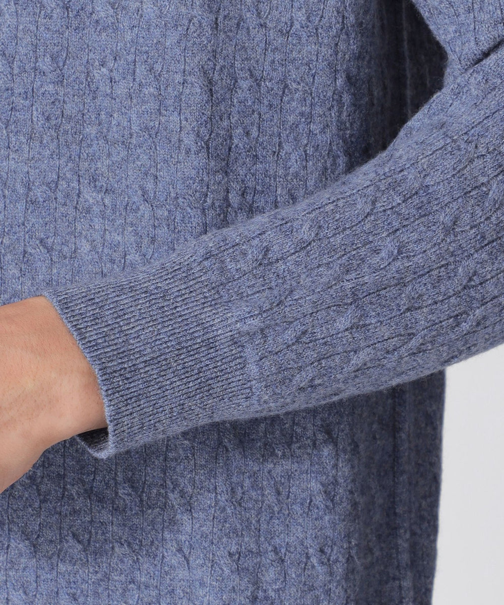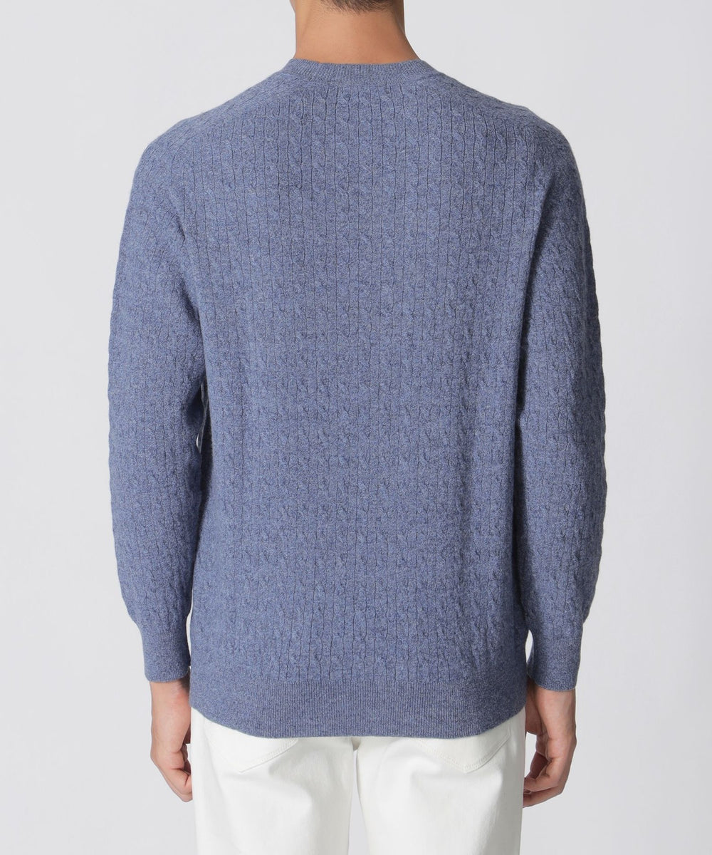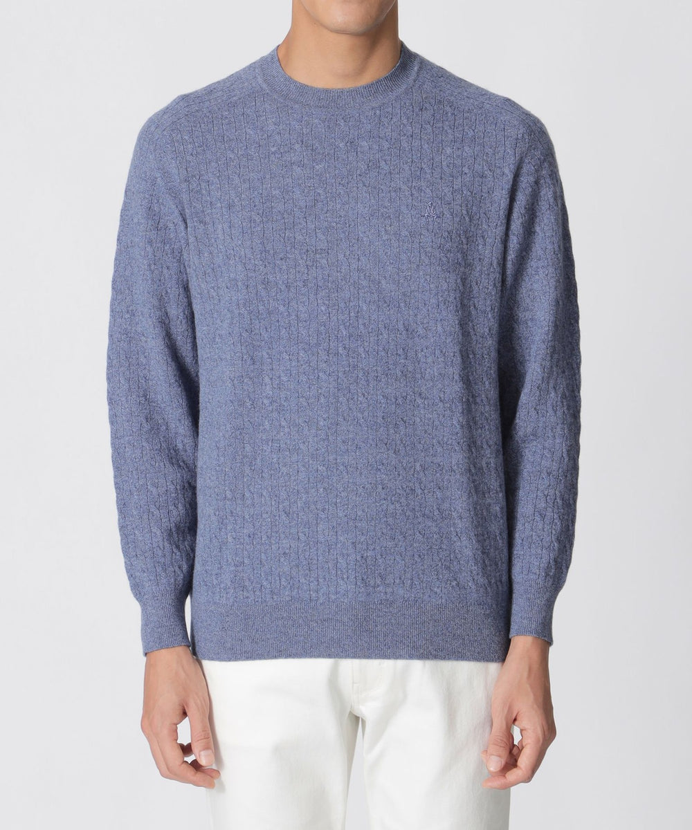 ウールにカシミヤをブレンドしたクルーネックケーブル柄セーターです。