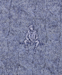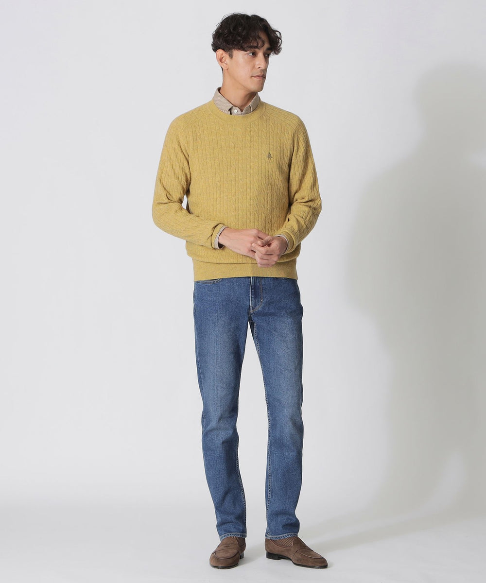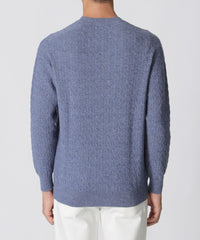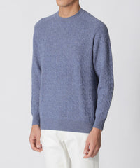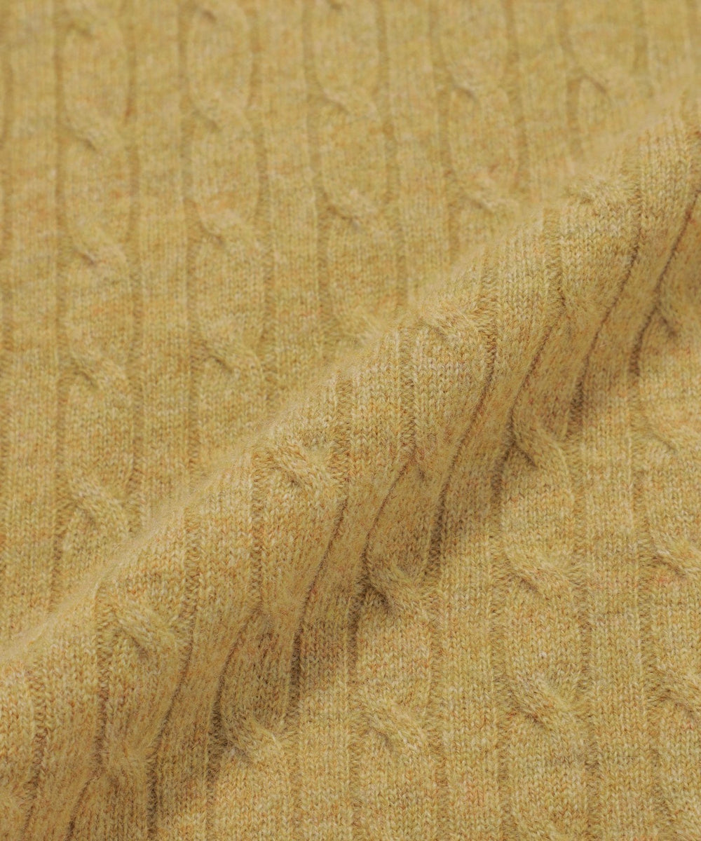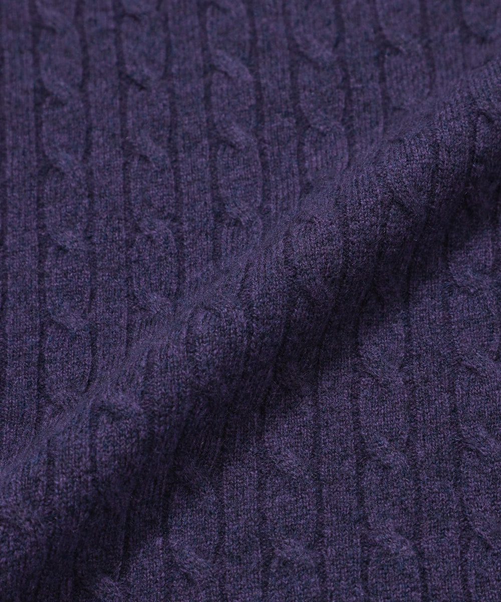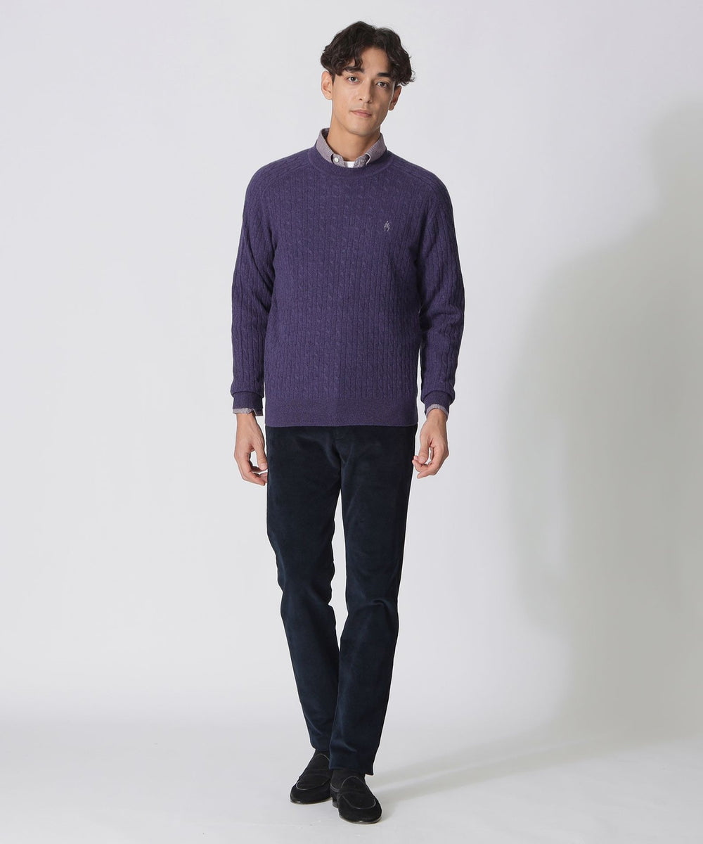 ウールにカシミヤをブレンドしたクルーネックケーブル柄セーターです。