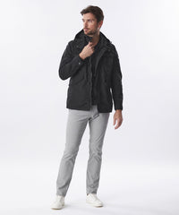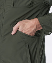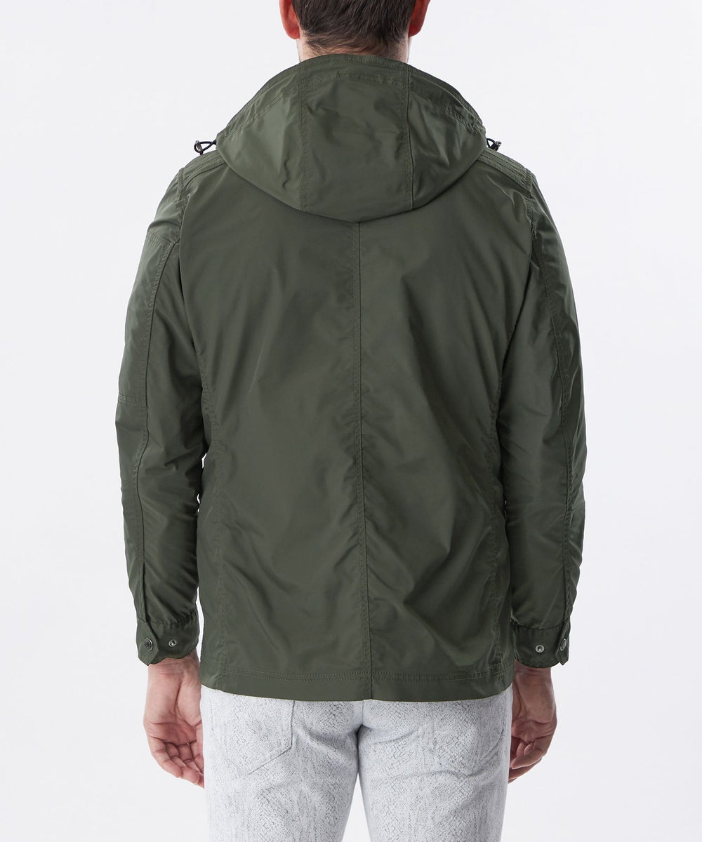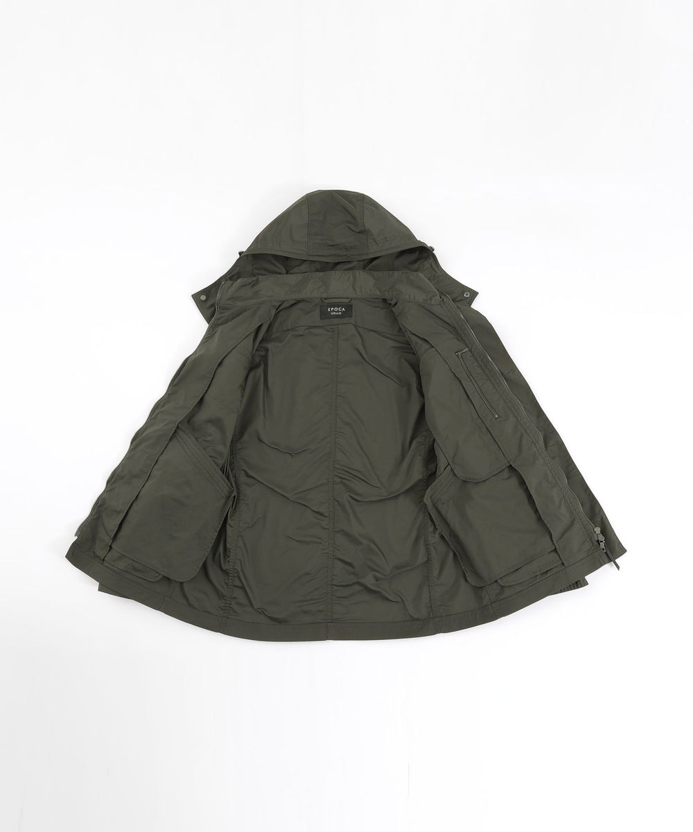 高密度ポリエステルストレッチツイルではっ水機能のある素材です。合繊素材なので軽くてシワになりづらくコンパクトに収納、カバンなどに入れて持ち運びができます。洗濯できるイージーケア性もあり、この時期に重宝するアイテムです。