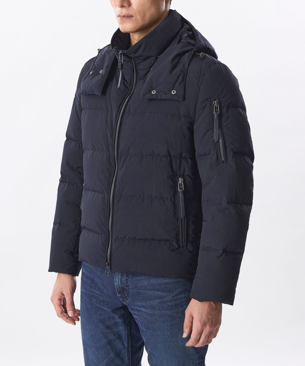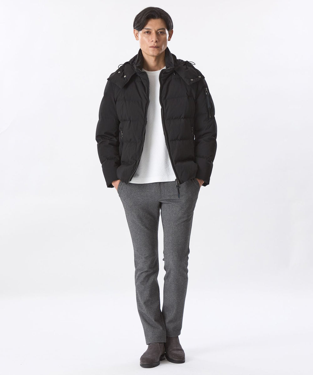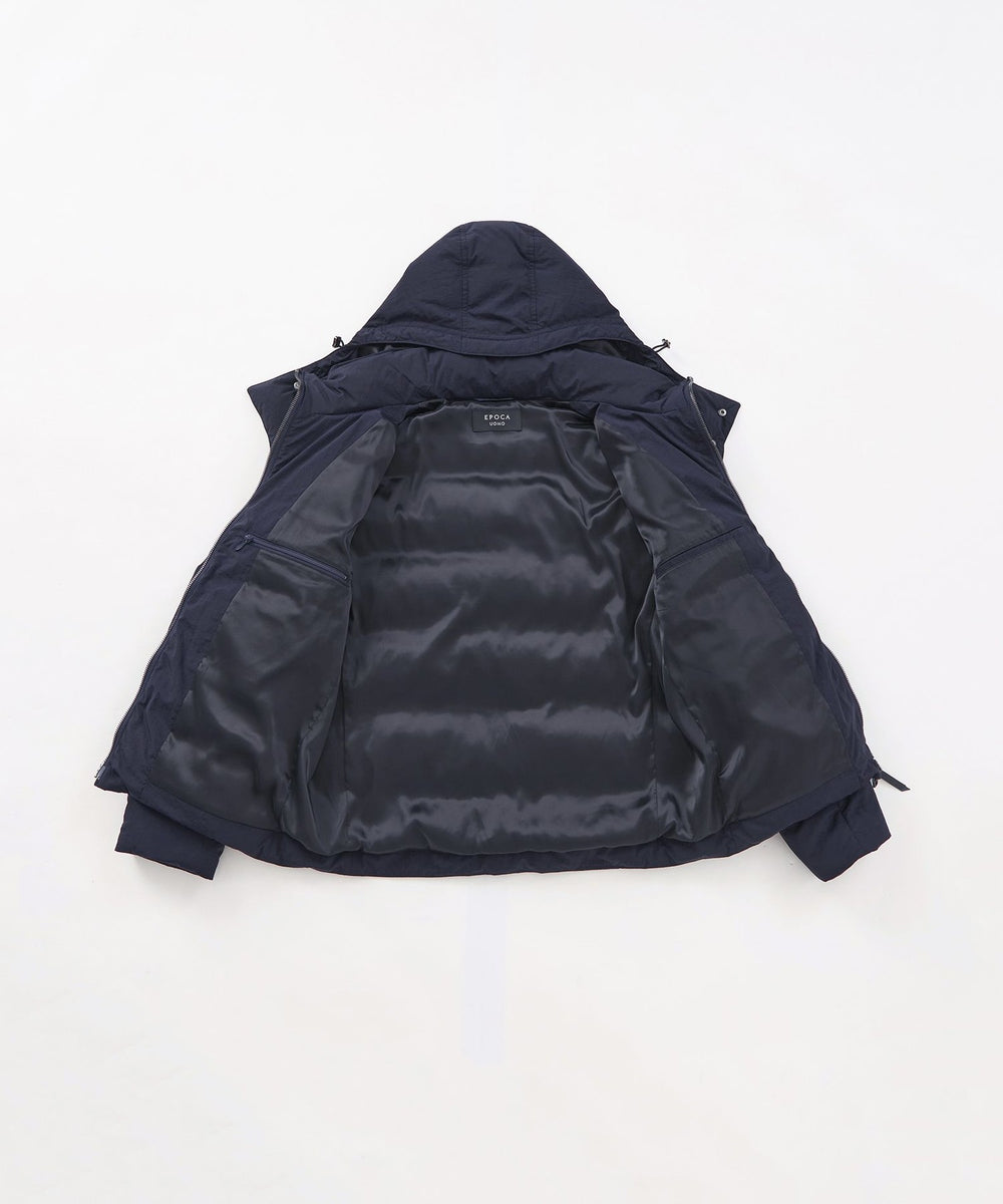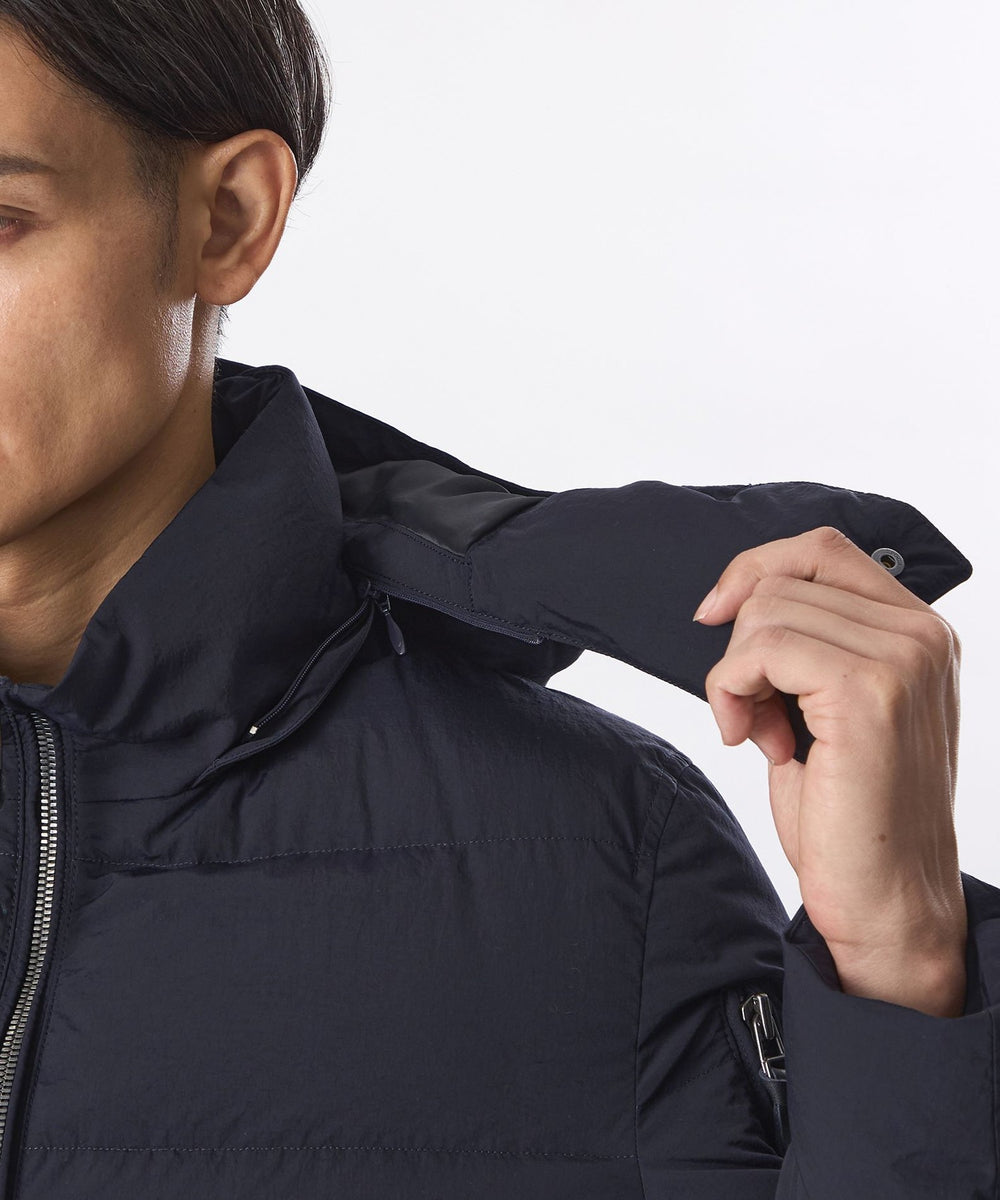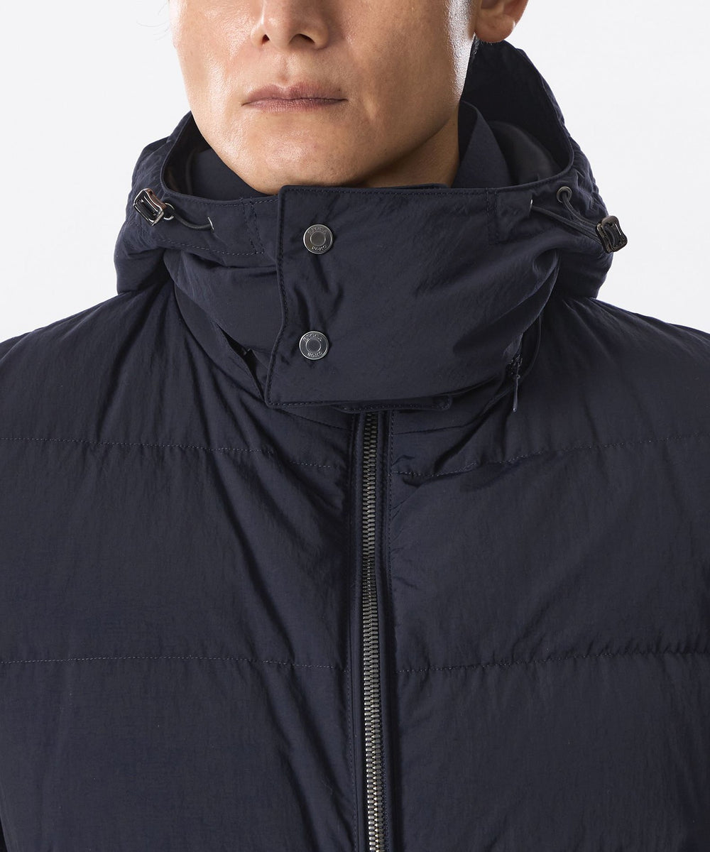 ビジネス、カジュアルどちらでも使える汎用性のあるアイテムで、防寒を意識しダウンを多めに入れ、フードを被った時に視界をさえぎらない限界まで顔が隠れる設計。
