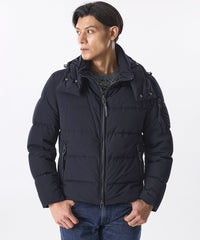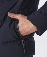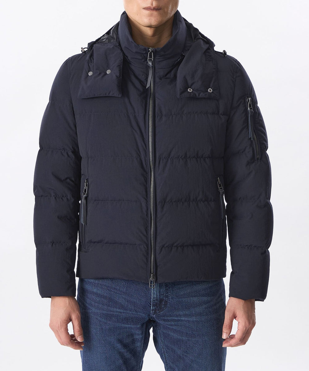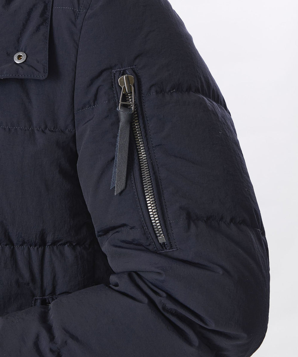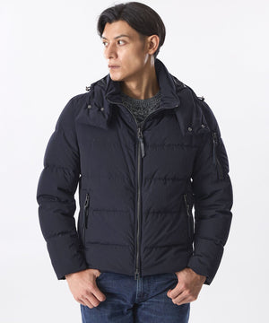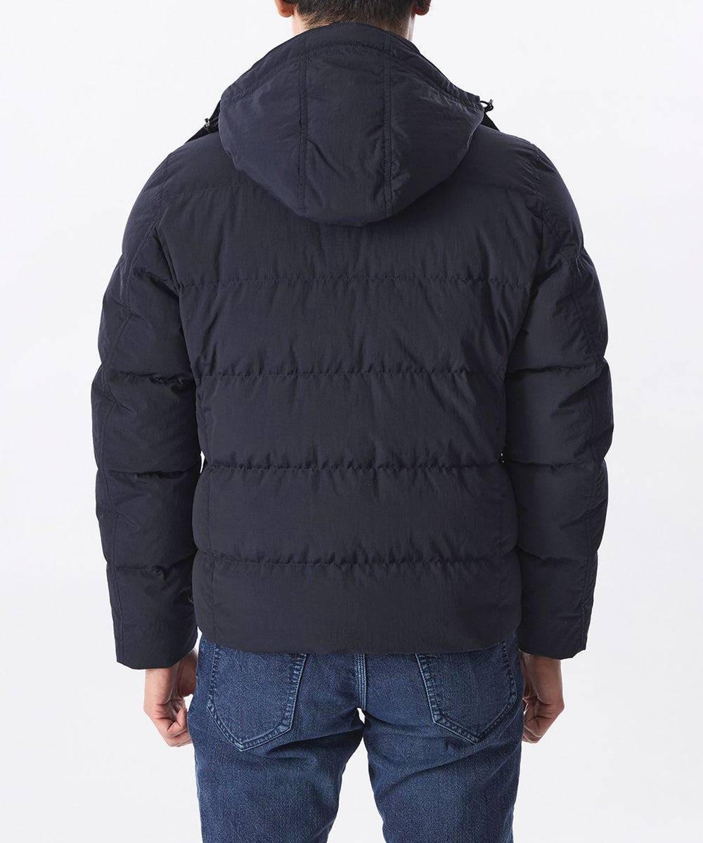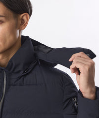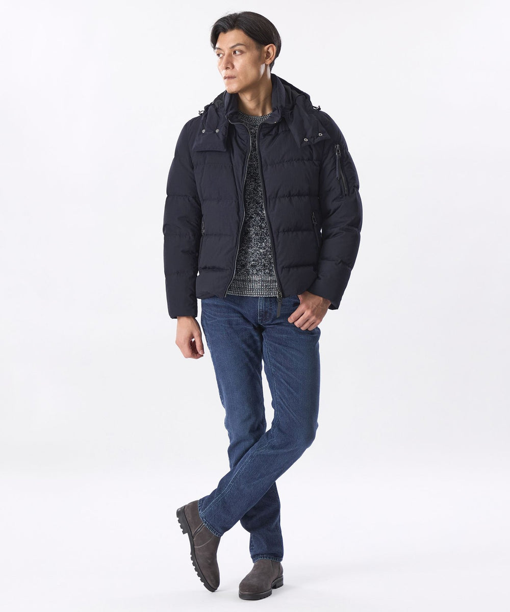 ビジネス、カジュアルどちらでも使える汎用性のあるアイテムで、防寒を意識しダウンを多めに入れ、フードを被った時に視界をさえぎらない限界まで顔が隠れる設計。