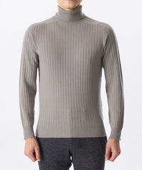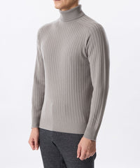 継続素材継続型。無縫製立体編成のホールガーメントによる日本製タートルネック。体に馴染む程よい太さのリブ編みでシャープな印象ながら伸縮性の高い組織により得られるフレックスなサイズ感が特長。