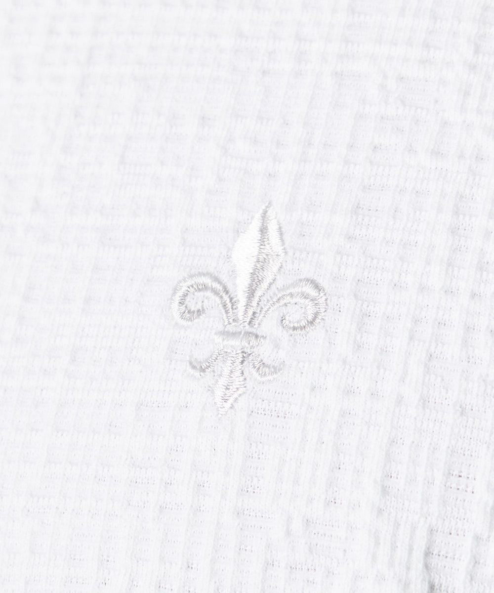 柄衿、アームホール、袖、裾、にデザインステッチをいれてポイントにし、胸にユリ刺繍、アームホールに消臭テープを使用した機能性にも優れた一着。