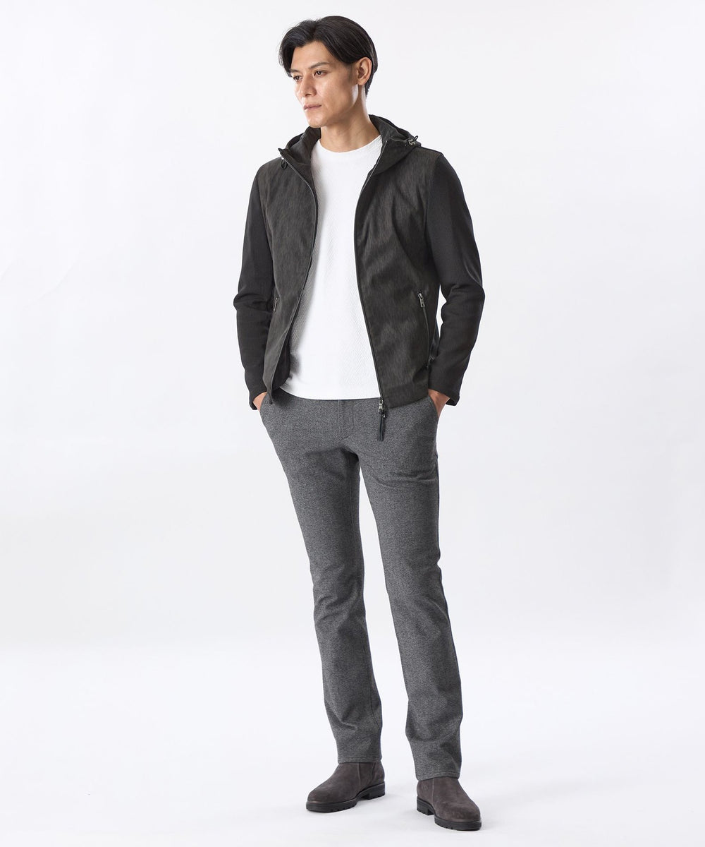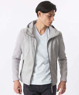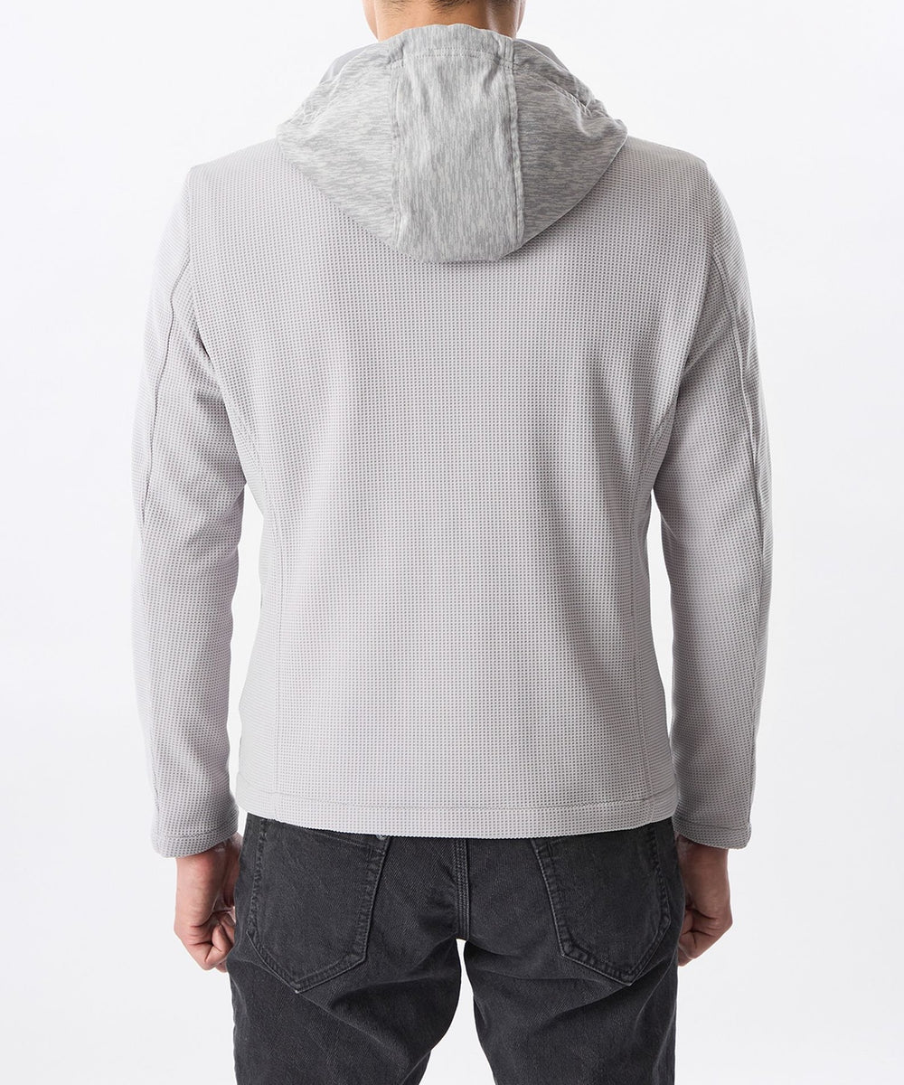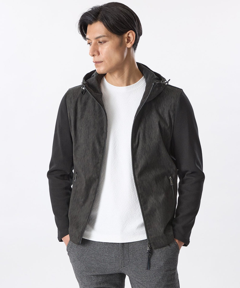 前身頃、フードにジオメツイードプリントしたポリエステルスエード生地を使用し、袖、後身頃には変形ワッフルダブルジャカード生地を使用。