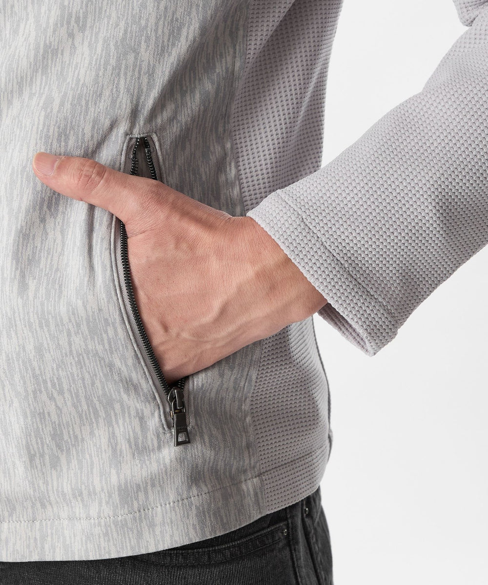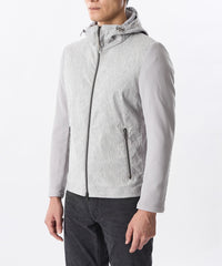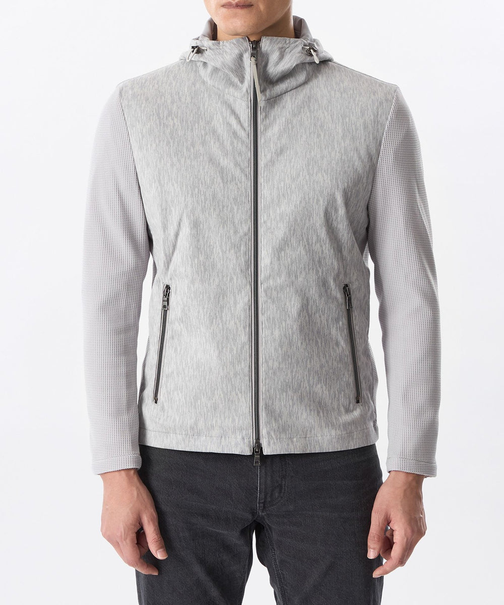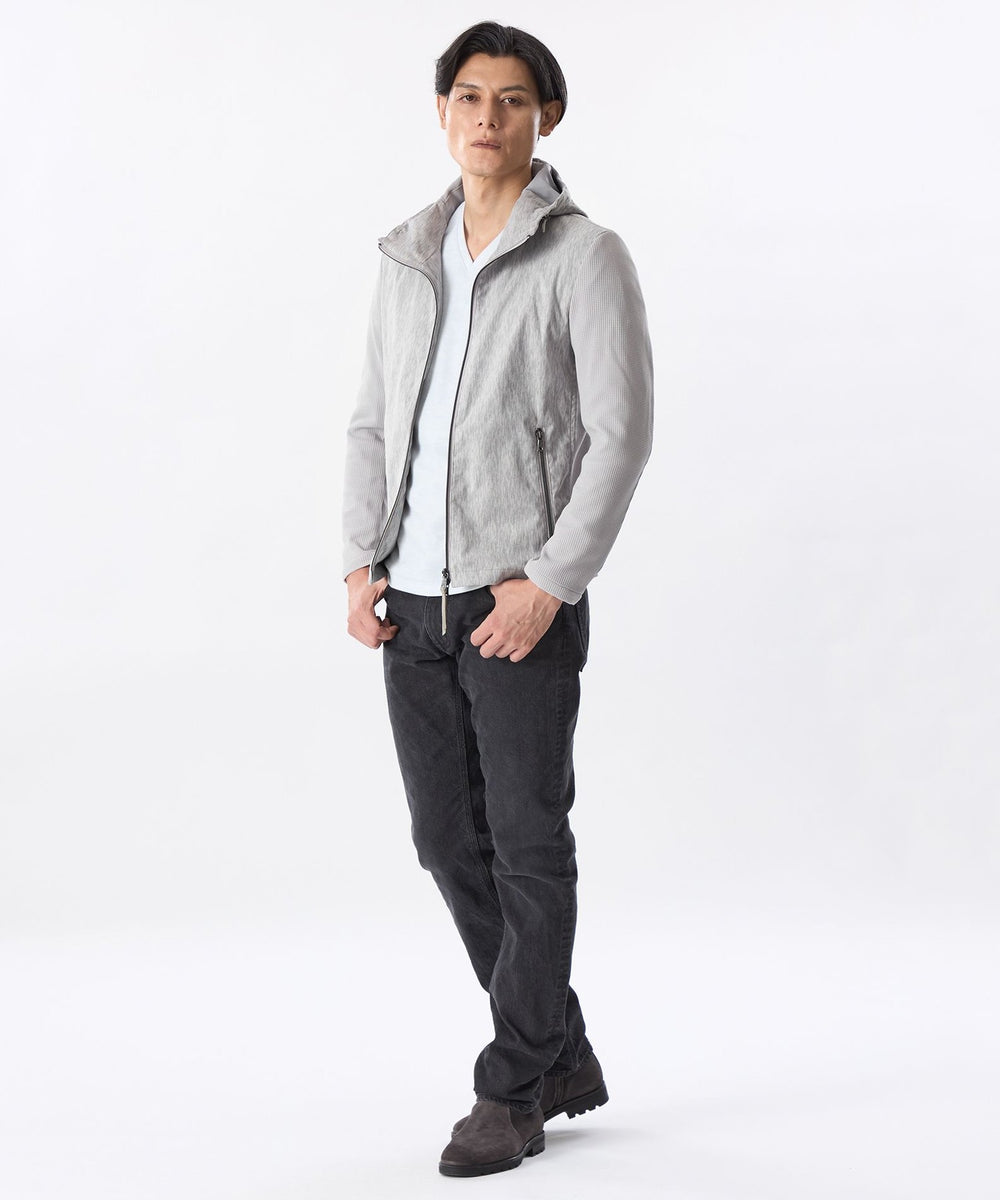 前身頃、フードにジオメツイードプリントしたポリエステルスエード生地を使用し、袖、後身頃には変形ワッフルダブルジャカード生地を使用。