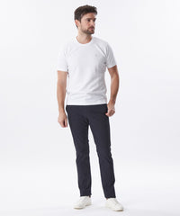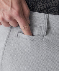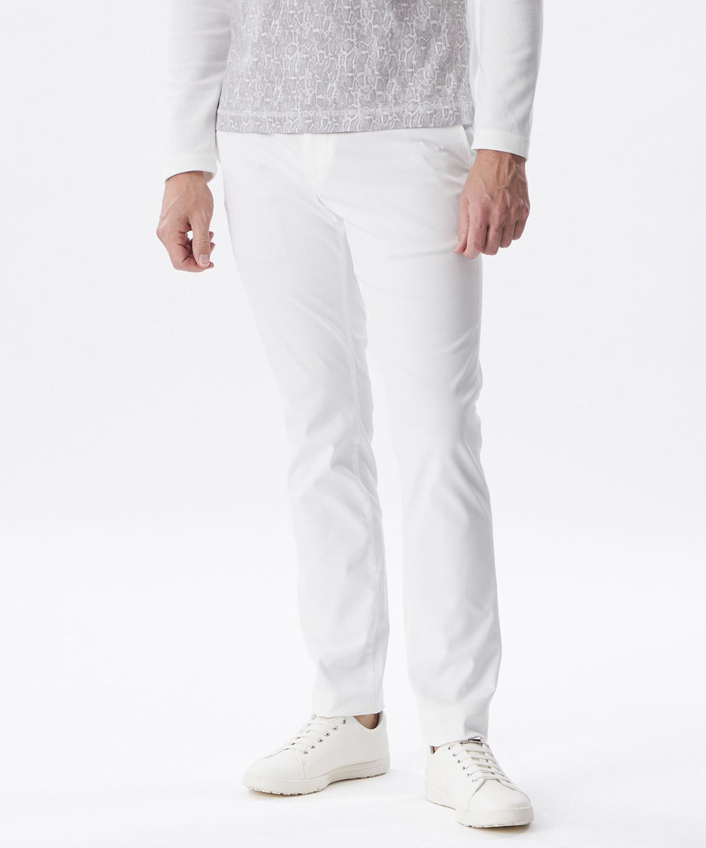 経糸に綿・ポリエステル、緯糸にポリエステルのストレッチ糸を使用することで、ストレッチが効いたコンフォータブルな穿き心地に。