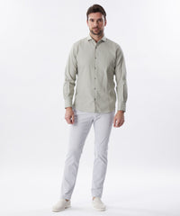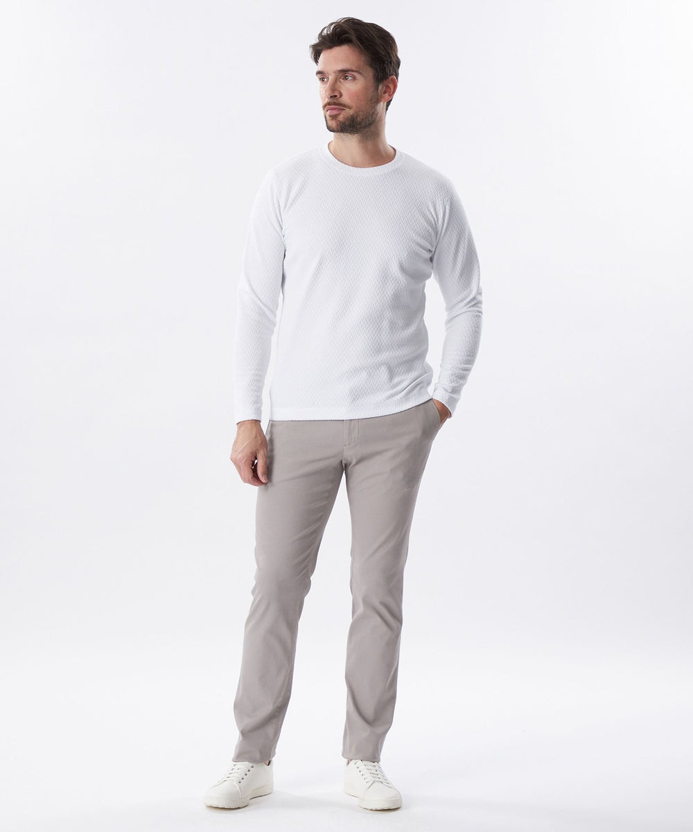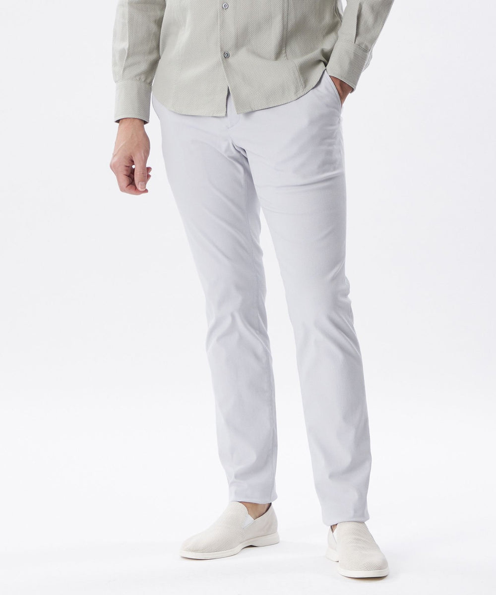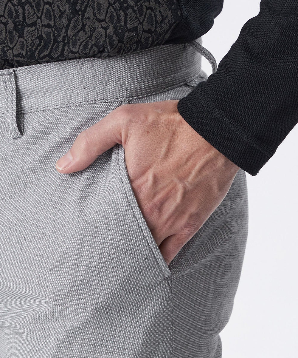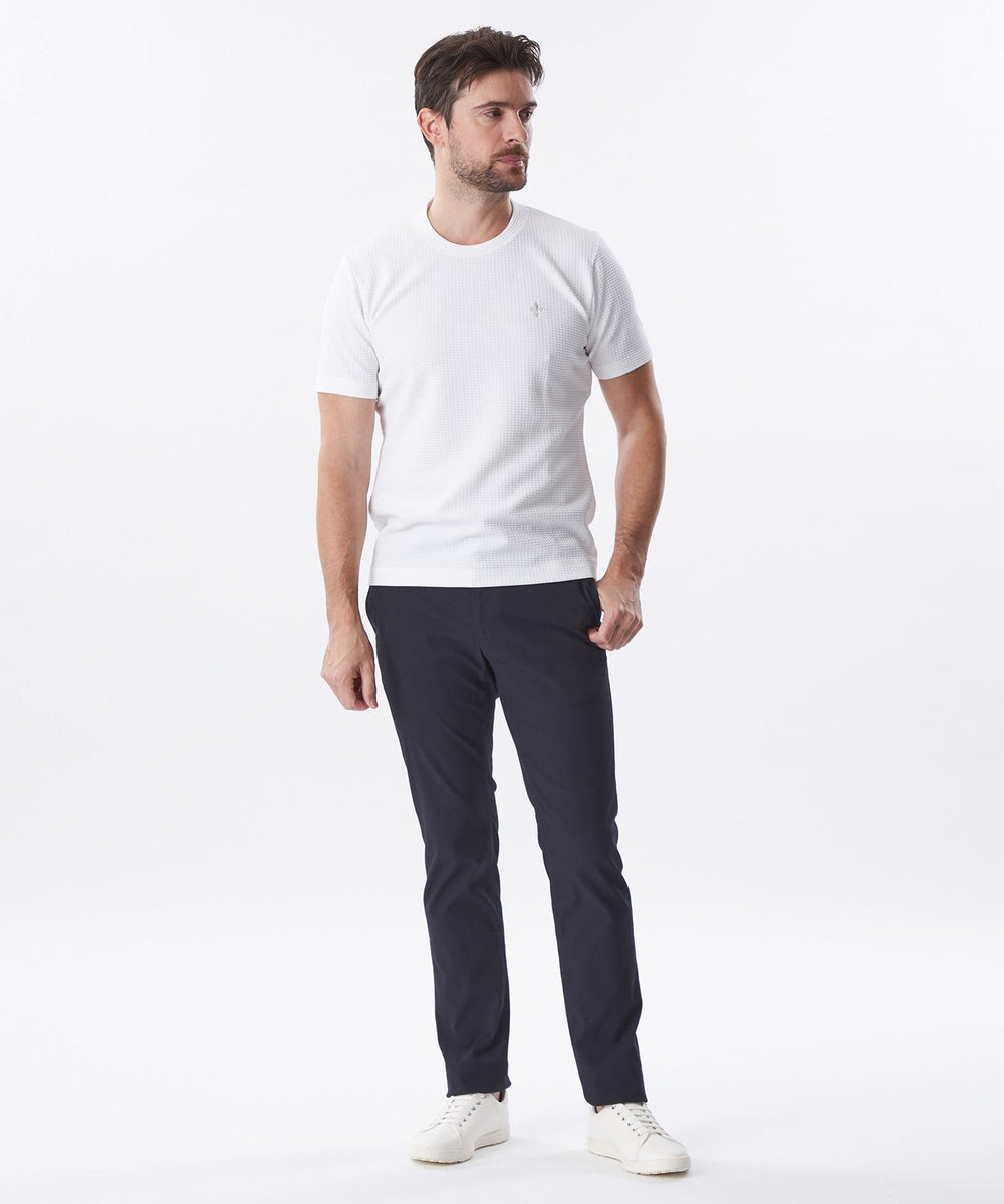 細かい凹凸のあるドビー織で仕上げることで、綿とポリエステルの微妙な色差が深みのある色合いに。カジュアルでストレスフリーな履き心地ながらも品のある大人の男性にふさわしいこだわりの一本。