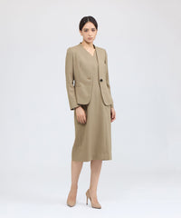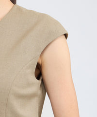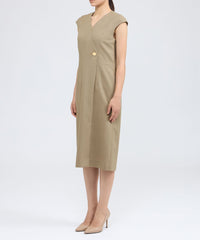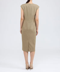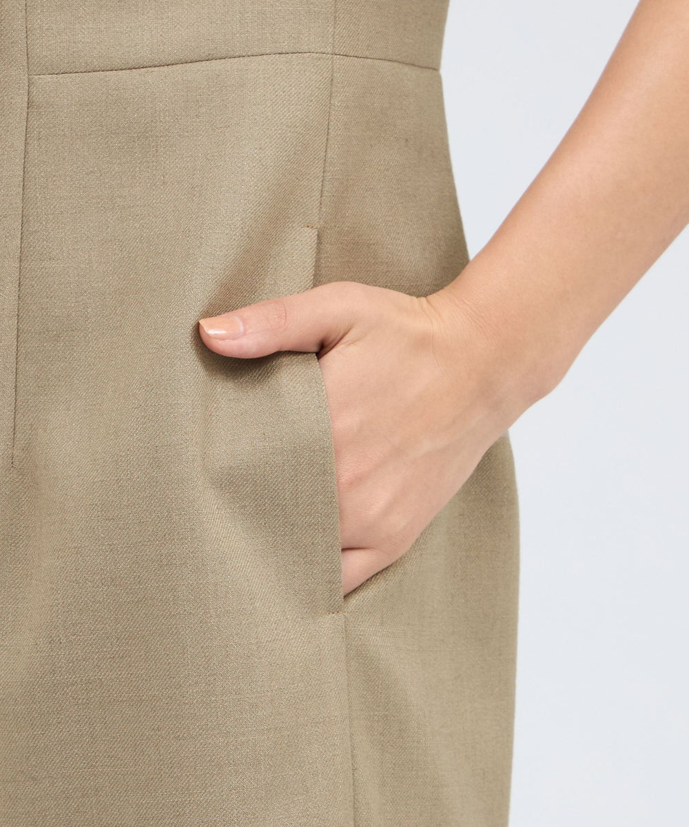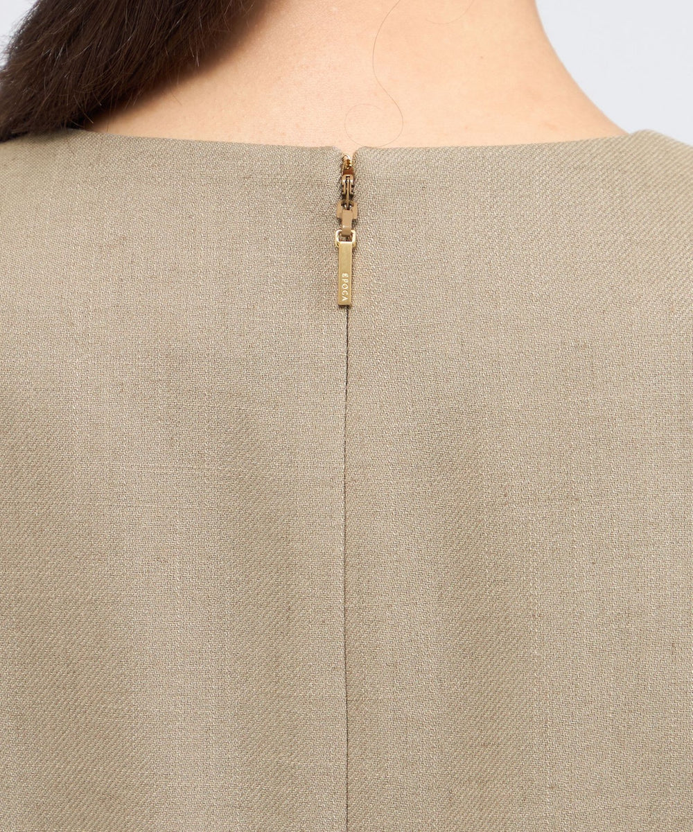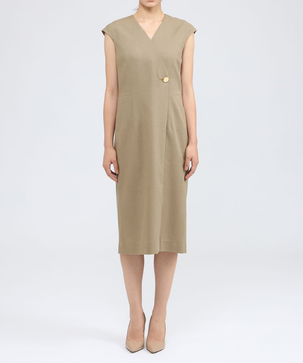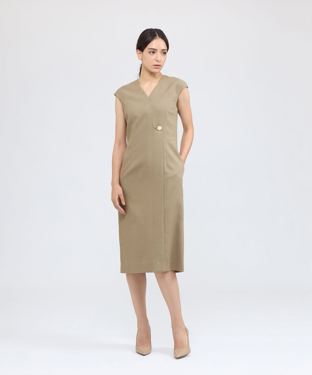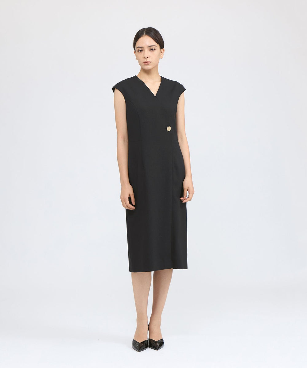 Iラインシルエットが洗練された印象のカシュクール風デザインドレスです。シンプルながら1枚で様になる便利なアイテムに仕上げました。ウエストの金釦がさりげないアクセントに。秋口にはタートルインナーを合わせて、ロングシーズン活躍する1着です。同素材のジャケット(品番:M5E21609)との合わせもおすすめです。
