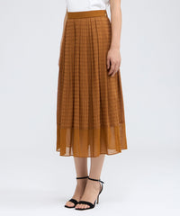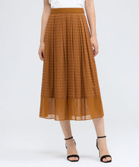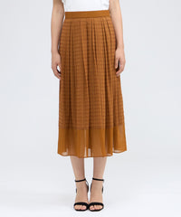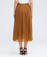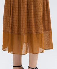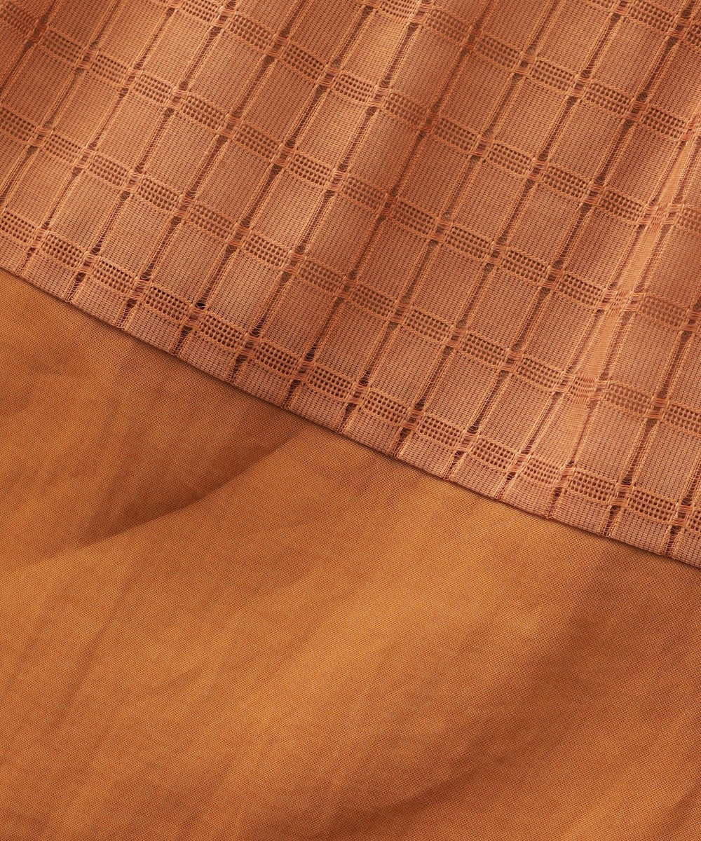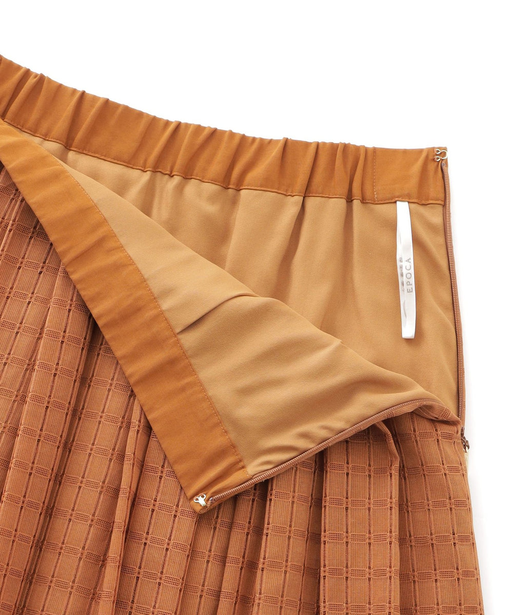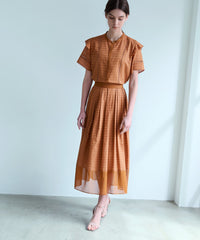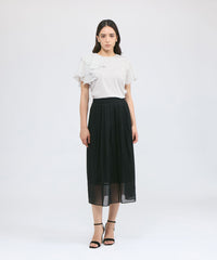 ウエストのランダムなタックがポイントのフレアスカートです。シンプルなシルエットながらもカラミ素材の表情が映えるデザインです。裾は無地シアー素材で切り替え、軽やかに仕上げました。同素材のブラウス(品番:M5M34602)とセットアップで着用いただくのもおすすめです。