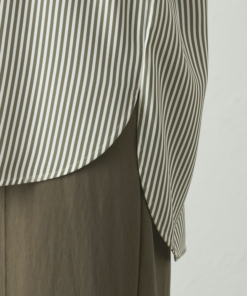ポリエステル素材にストライプ柄をプリントしています。ハリがありながらも適度なしなやかさのある素材で、シワになりにくいのが特徴。ケアのしやすさも嬉しいポイント。