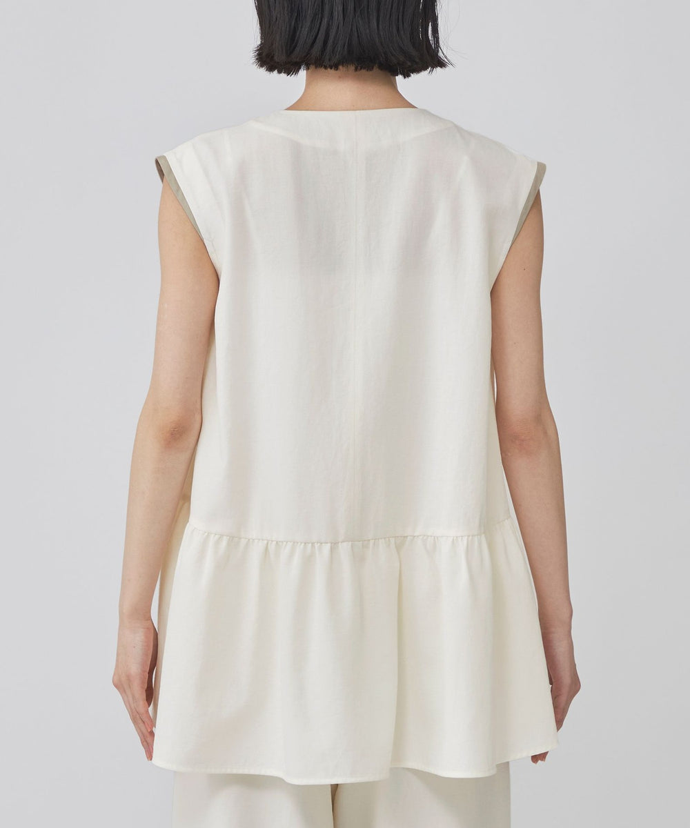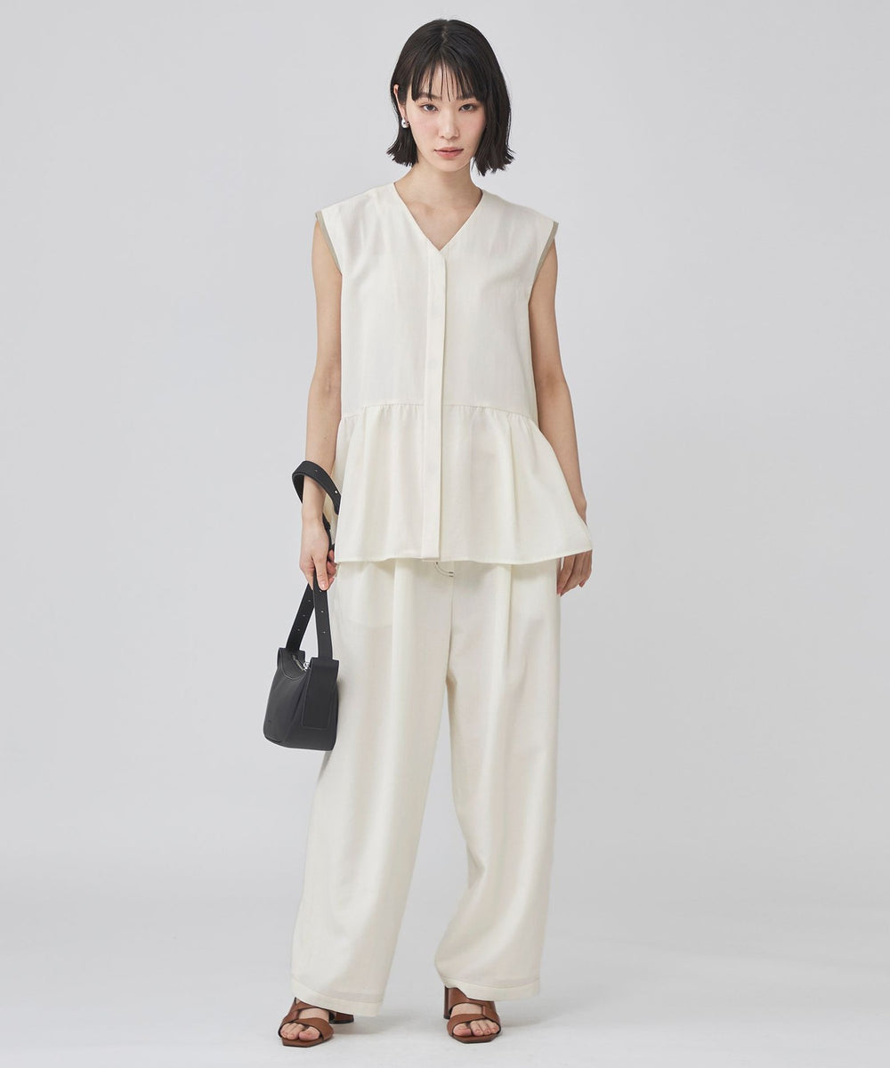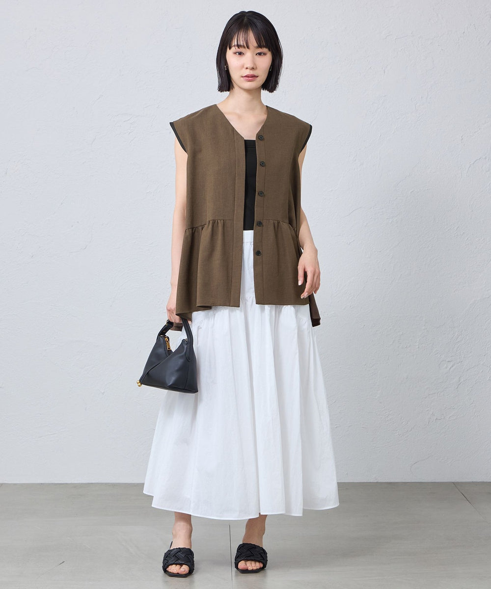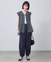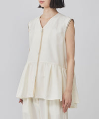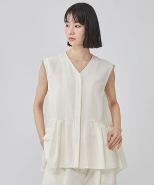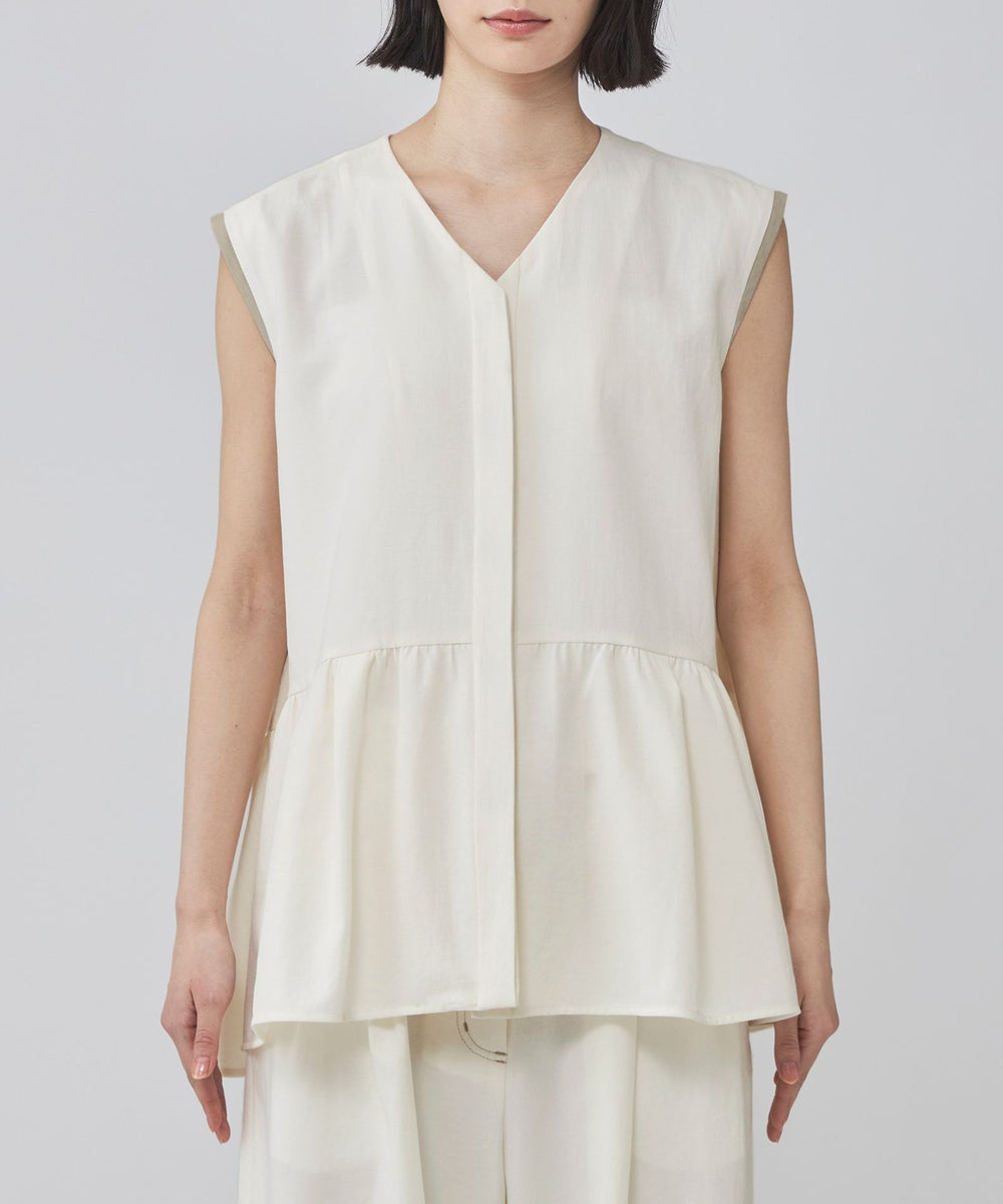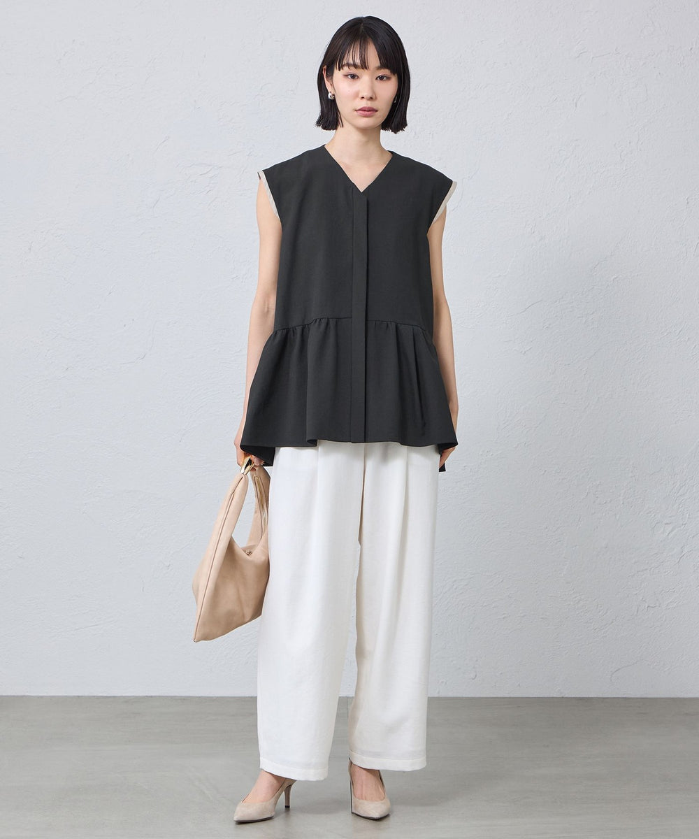 前後差をつけたギャザー切替が動くたびにふわりと揺れ、シンプルなボトムに合わせるだけで上品な印象に。