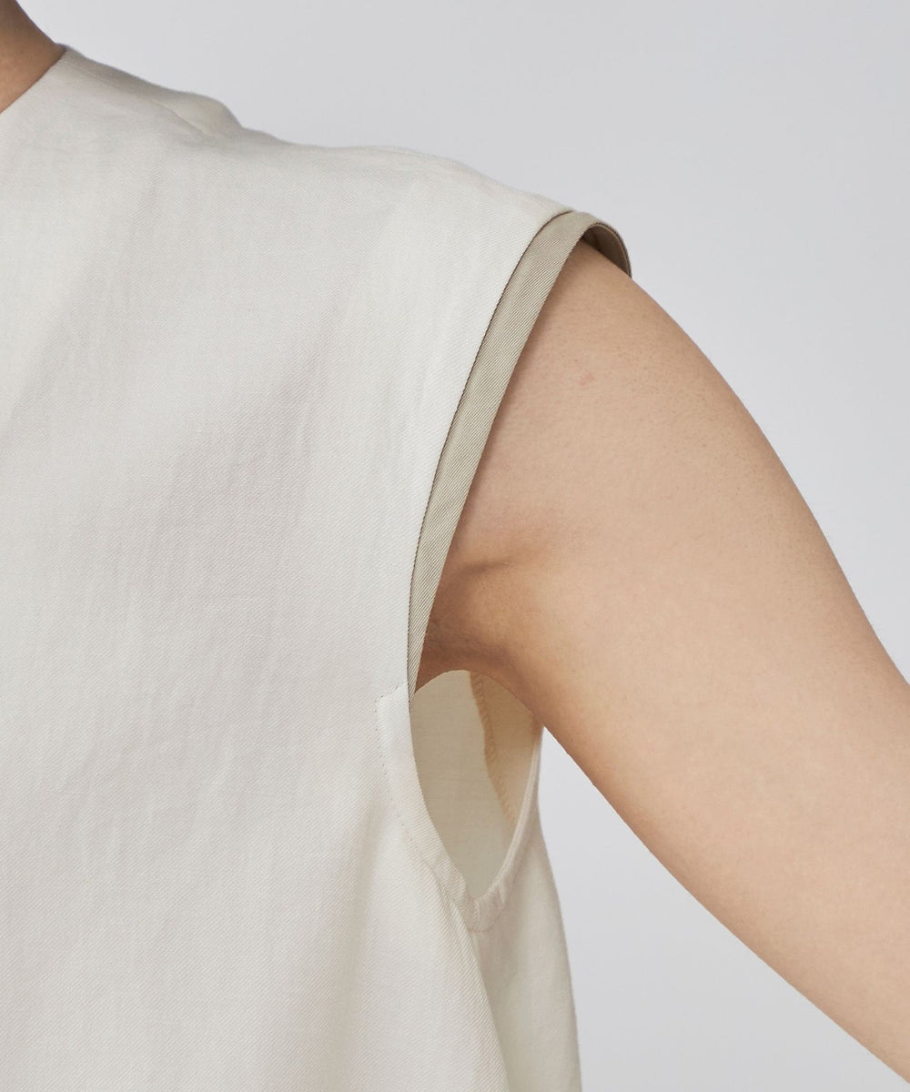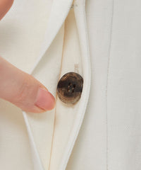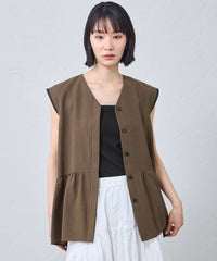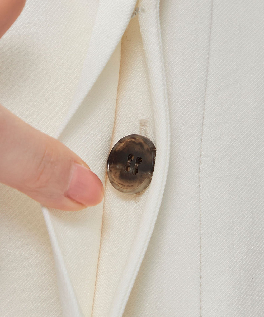 前立ては比翼仕様で、閉じればトップスとしてすっきり、開ければ配色ボタンが映える軽いジレとして活躍。