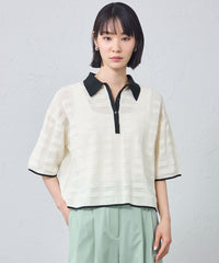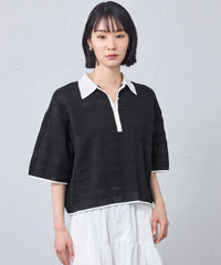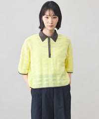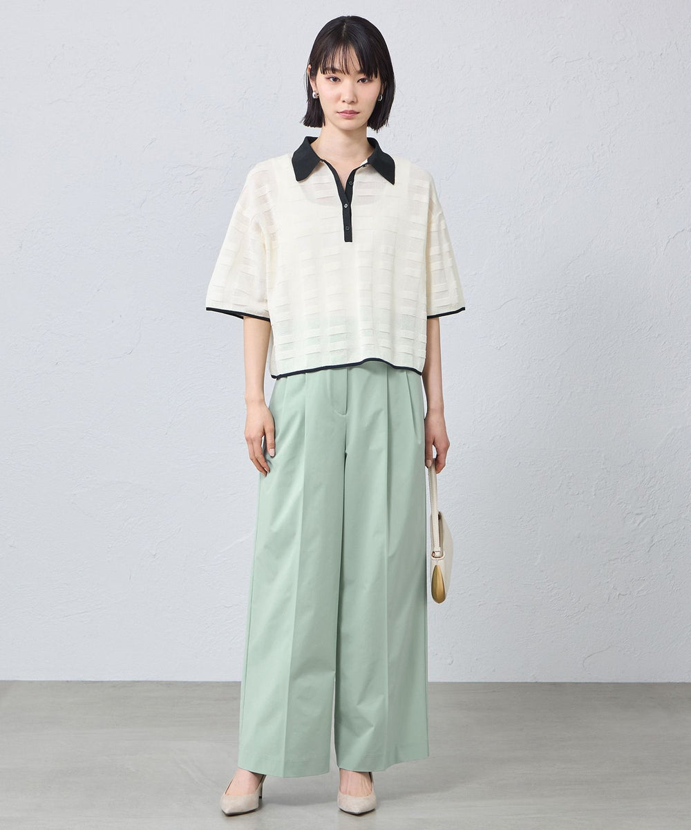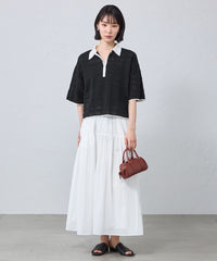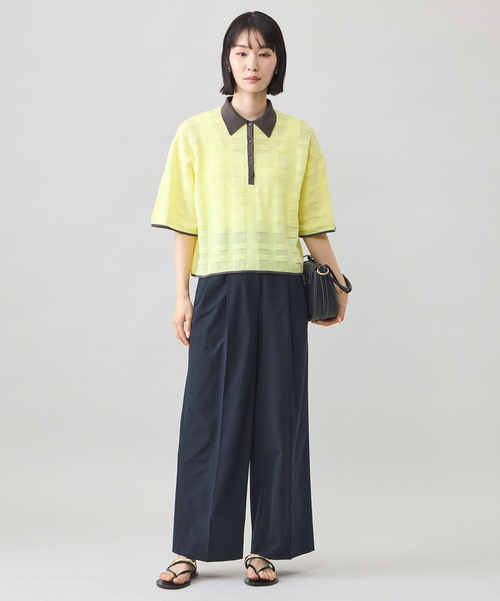 襟と袖口に配色を施し、シンプルな中にさりげないアクセントをプラス。コーディネートを引き締め、1枚で着映えします。