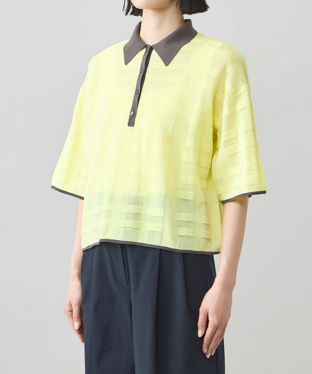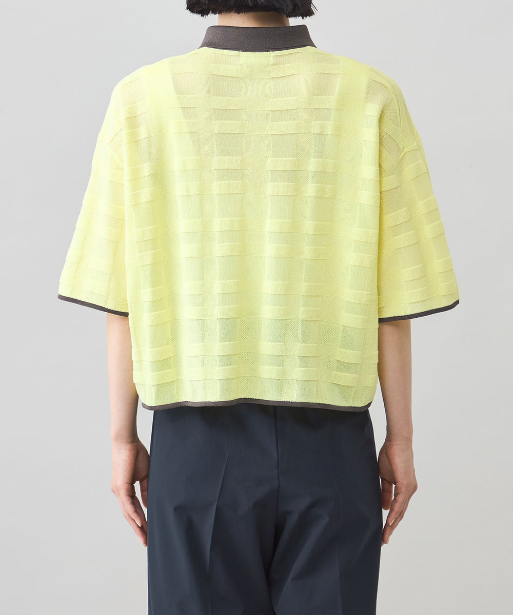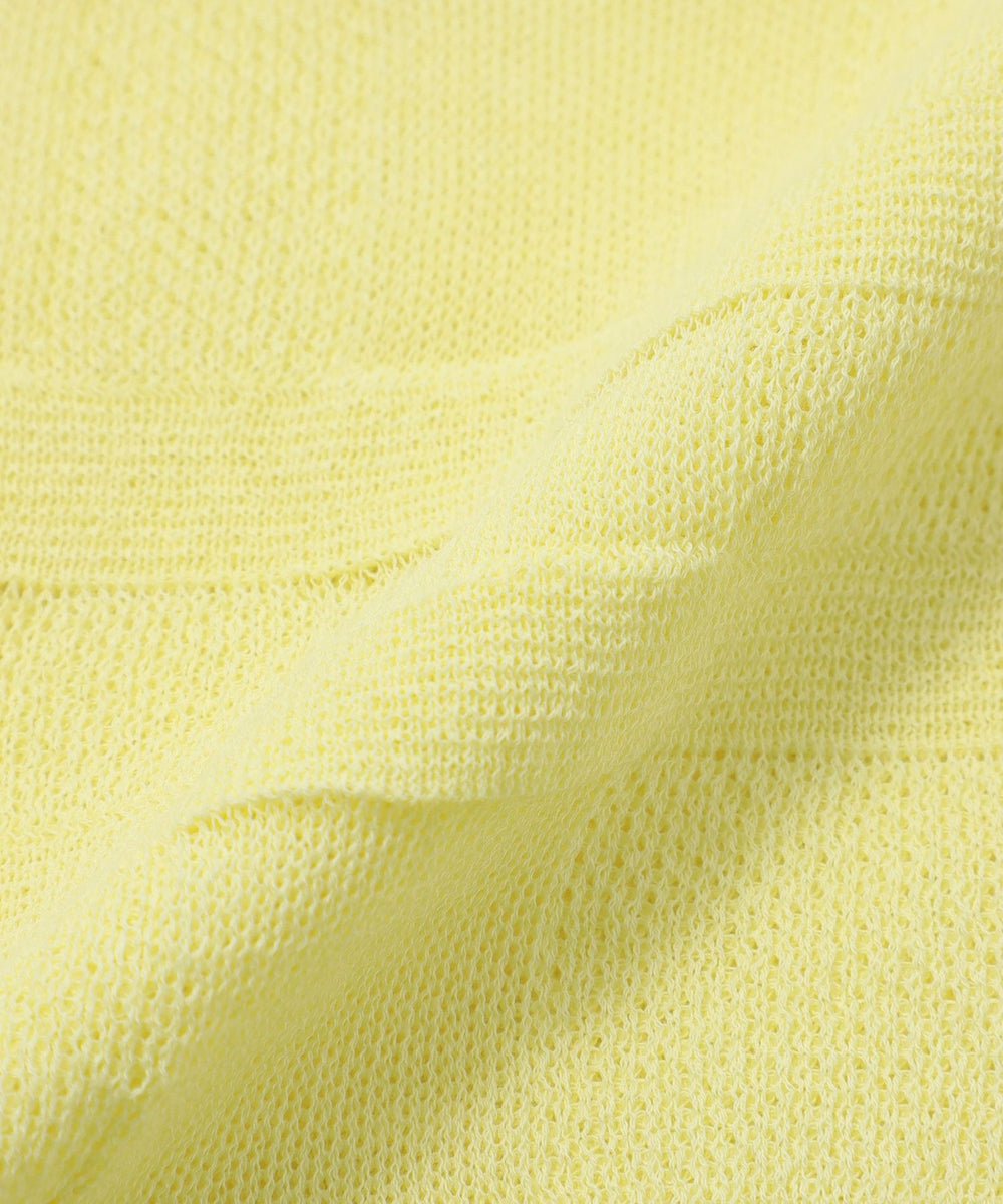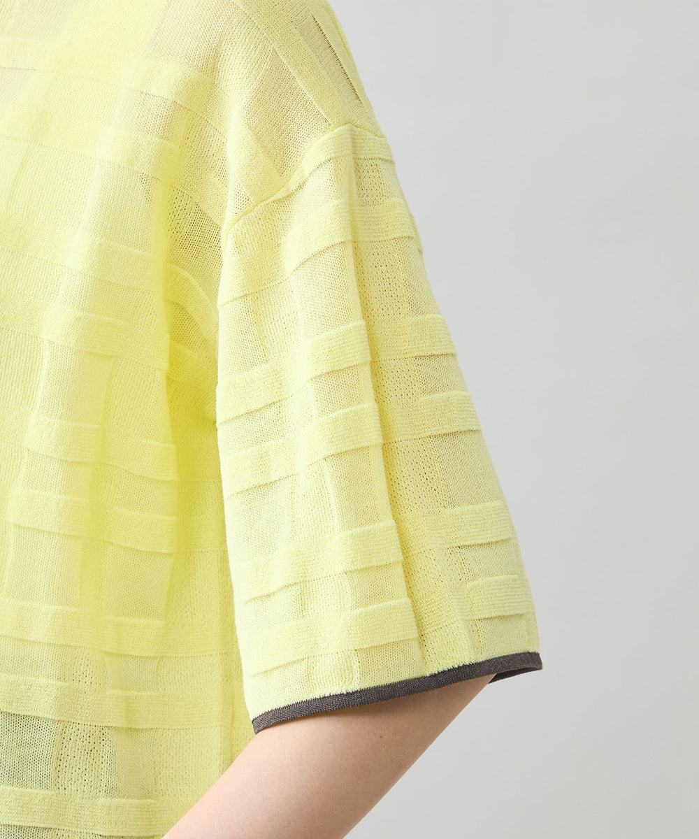 大きめのチェック柄編地を、総針と天竺の組み合わせで表現。無地ながら奥行きのある表情と、涼しげな透け感が魅力です。
