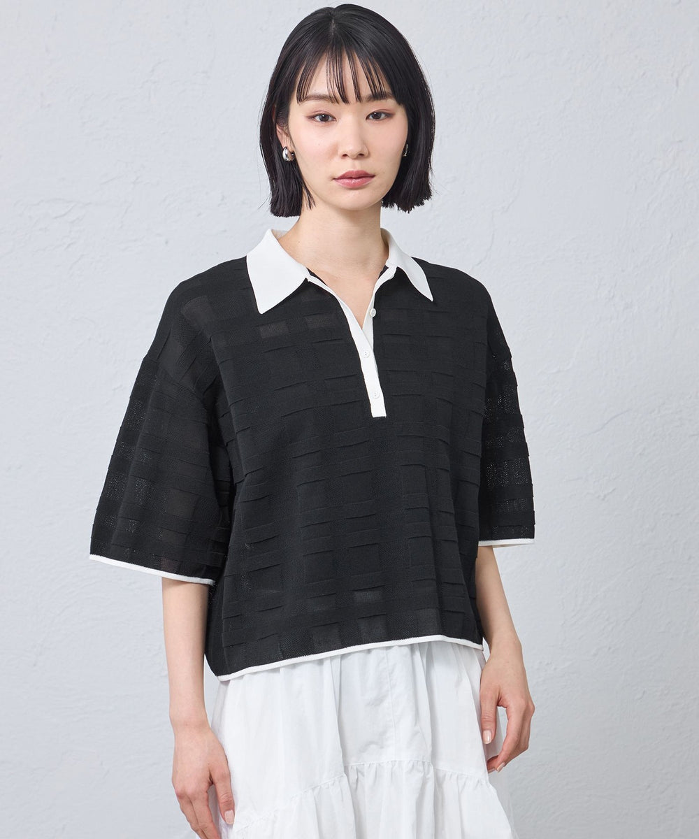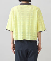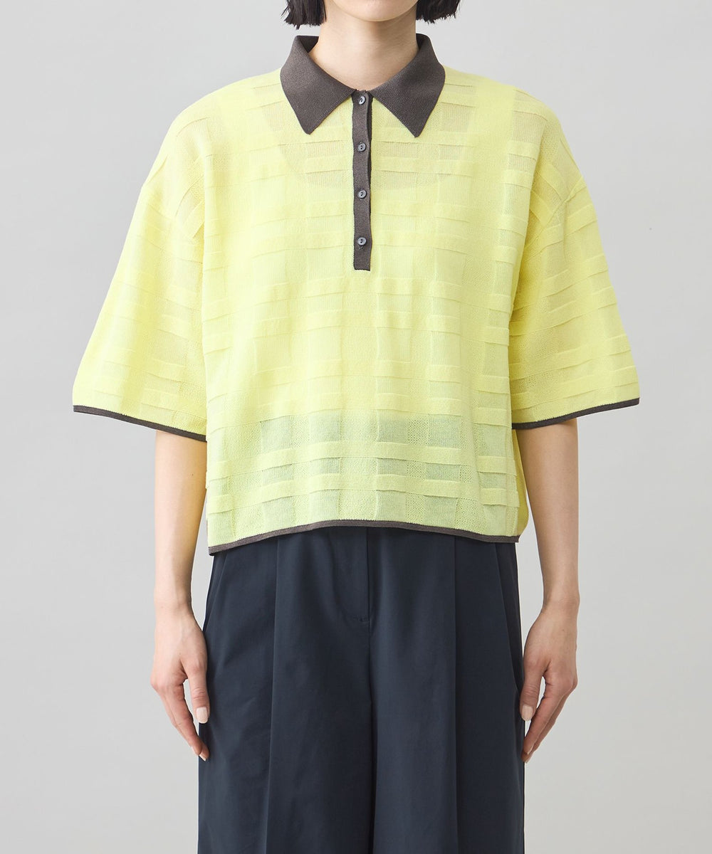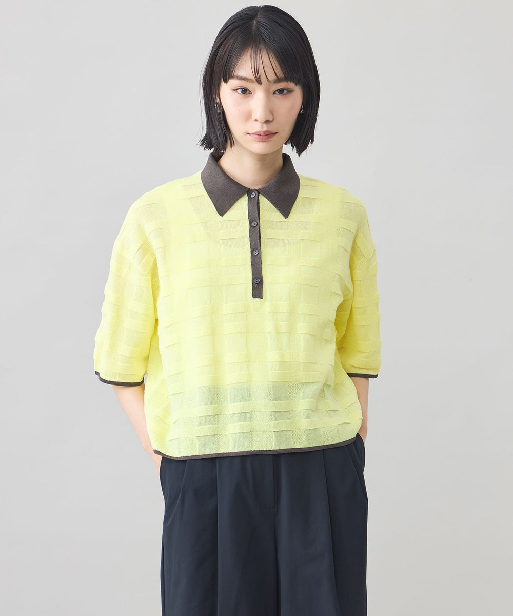大きめのチェック柄編地を、総針と天竺の組み合わせで表現。無地ながら奥行きのある表情と、涼しげな透け感が魅力です。