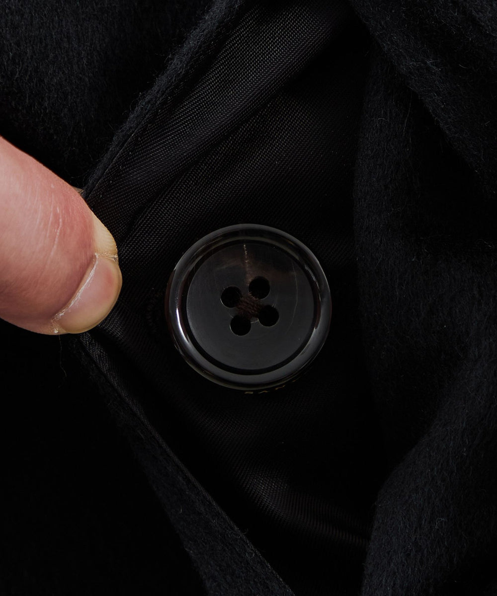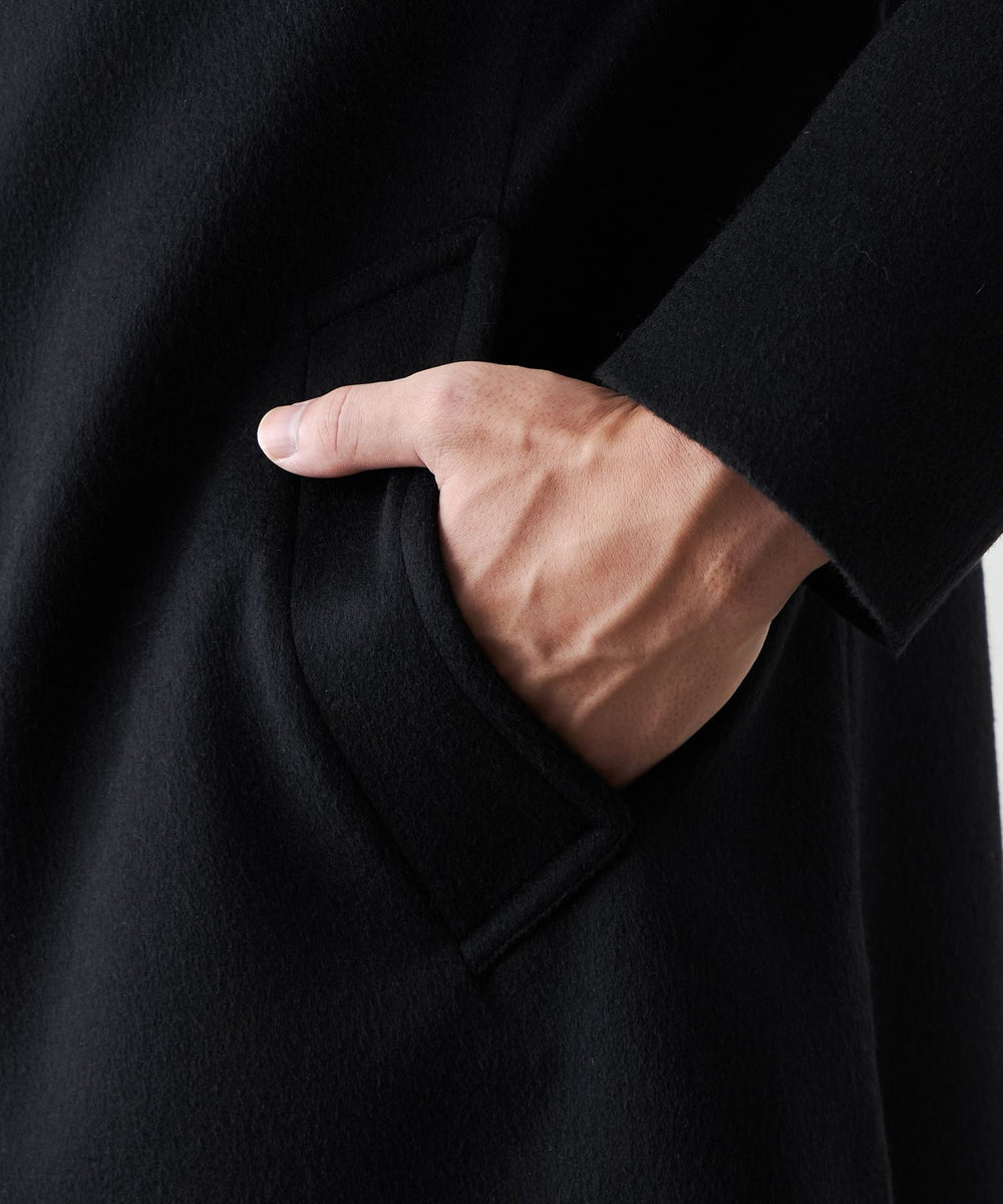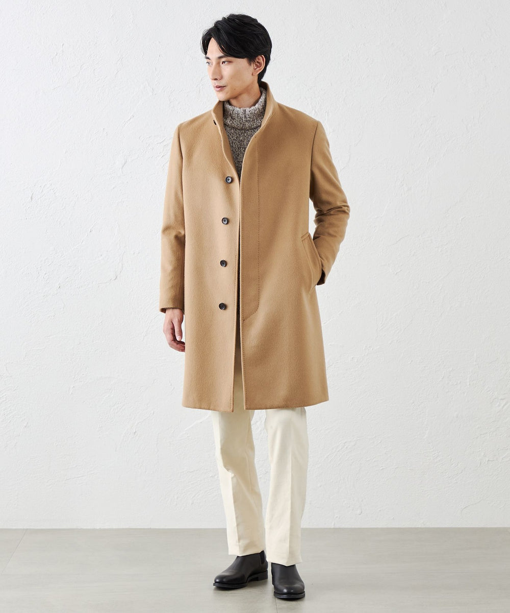 カシミヤ混ウール生地が本来持つ美しくリッチな風合いを損なうことなく、“耐久はっ水”の高機能を兼ね備えた開発素材「Rain Wool (R)」を使用。