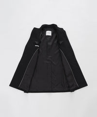 美しい開きにこだわったスタンドカラー。フロントは比翼仕立てで雨風を防ぎます。