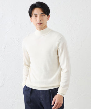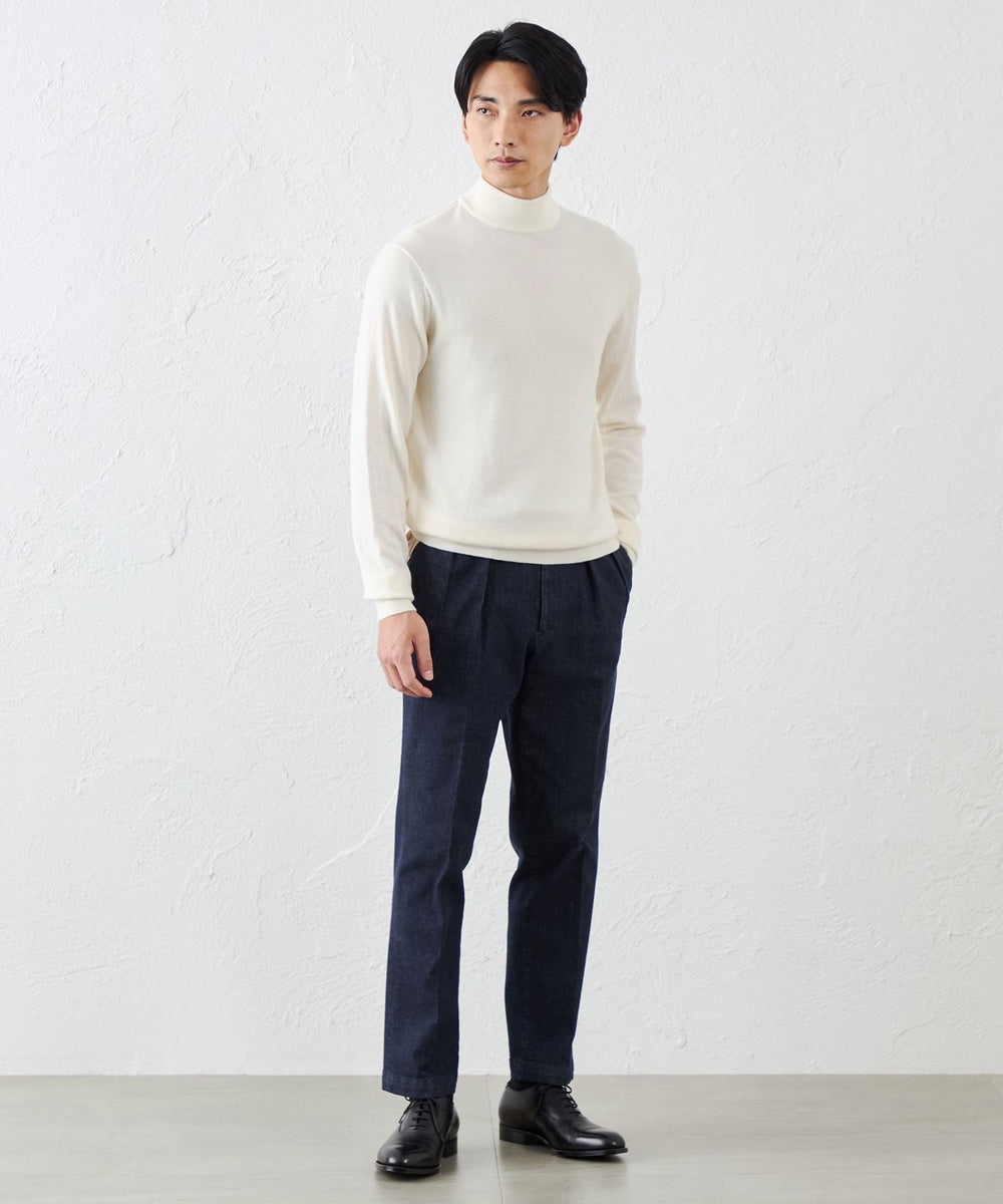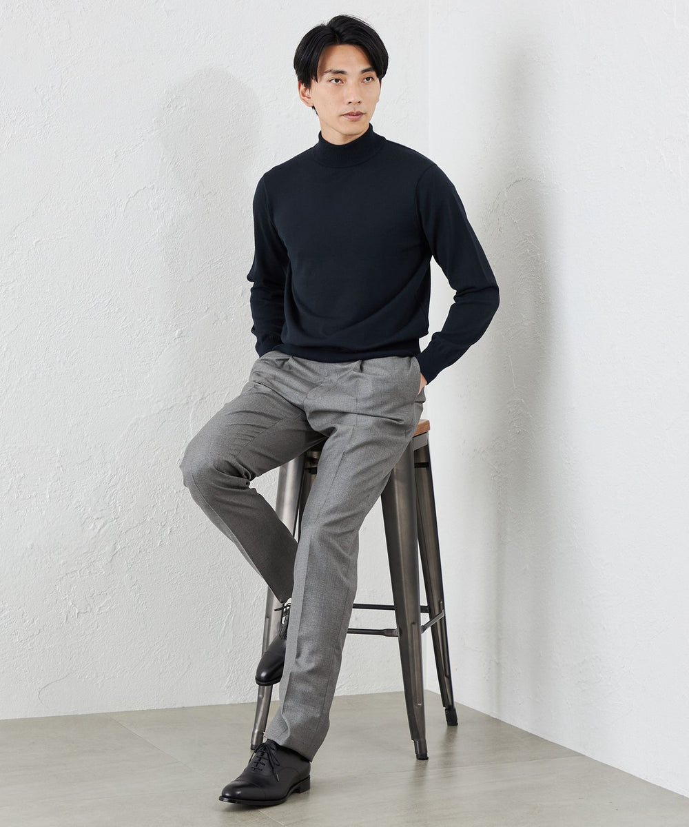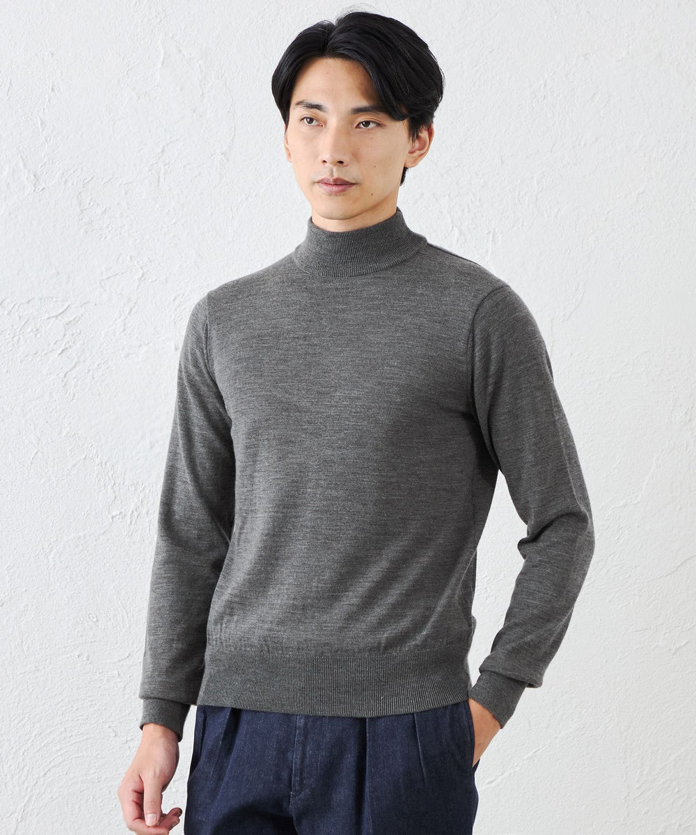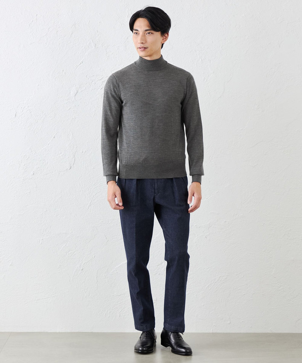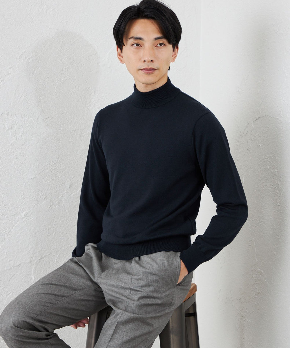 首元からスタイルを上品に見せるモックネックのウールセーターは、幅広いコーディネートに合わせて使える万能アイテム。