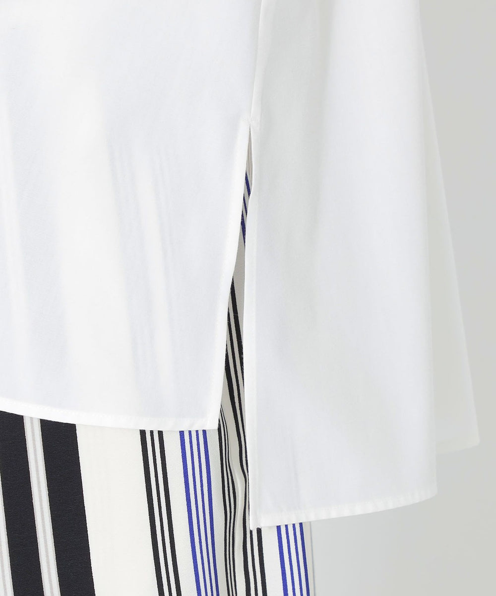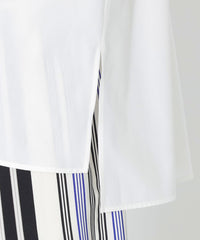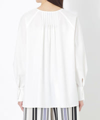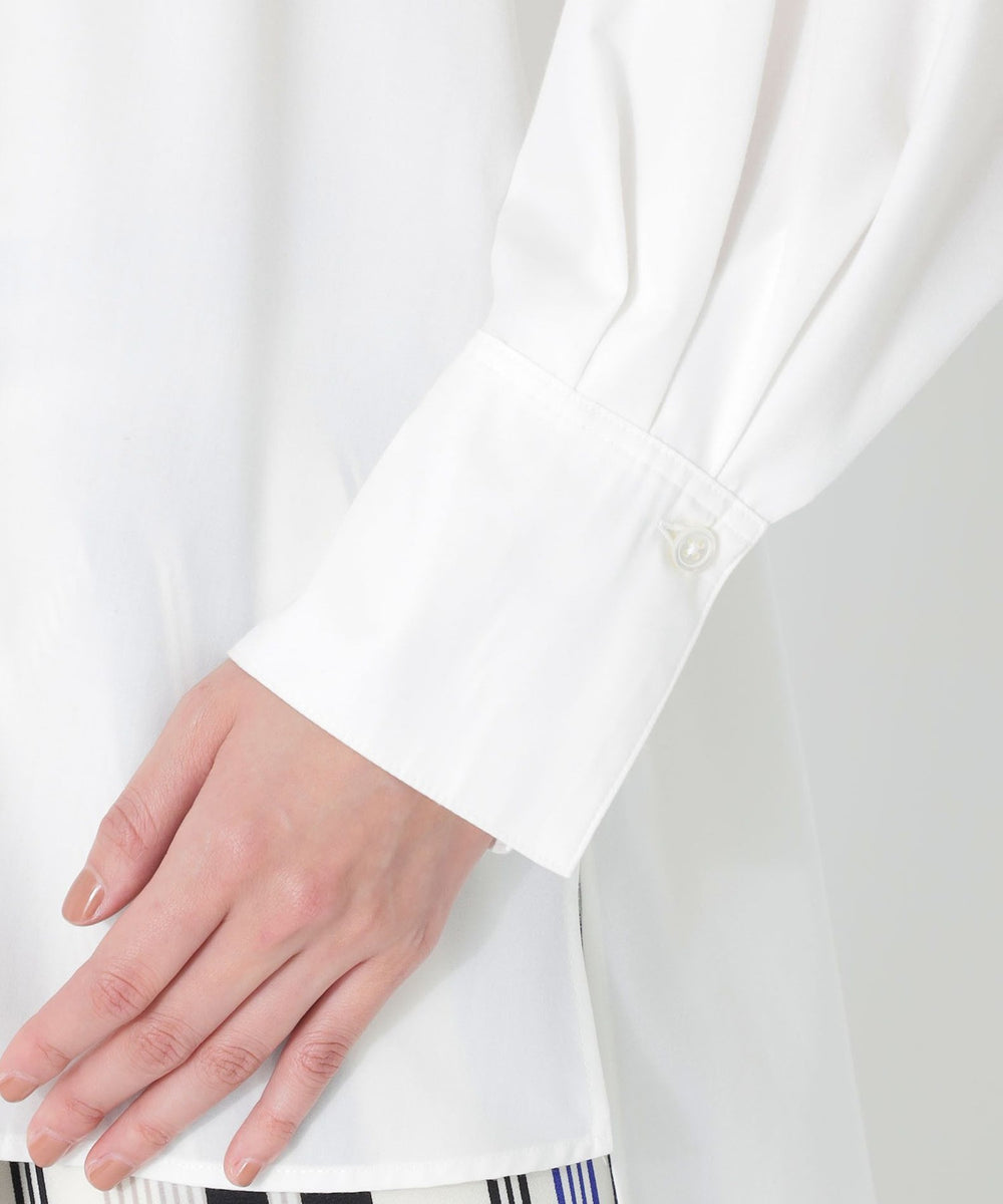 襟元のリボンデザインがポイントのスキッパーブラウス。パンツやスカートに合わせてインでもアウトでもバランスの取りやすい着丈です。リボンは結べばエレガントな雰囲気に、ラフに垂らせばオトナな雰囲気になります。ジレやベストをオンしてレイヤードするスタイルにベストマッチしますが、肌寒い時期はタートルを重ねて着るスタイリングもおすすめです。