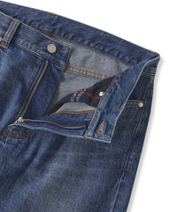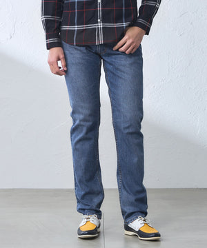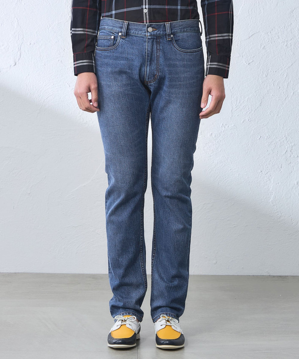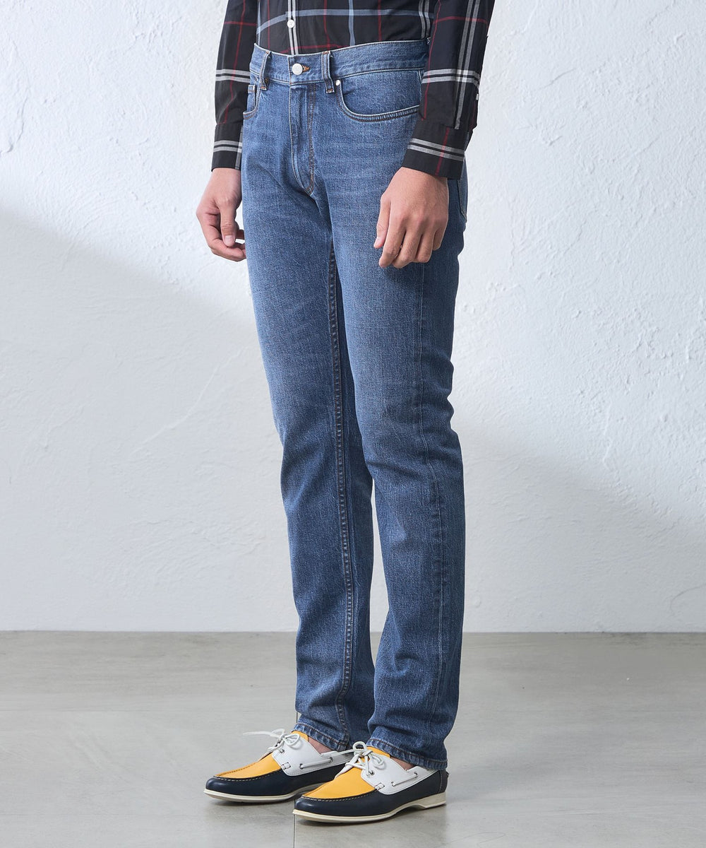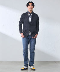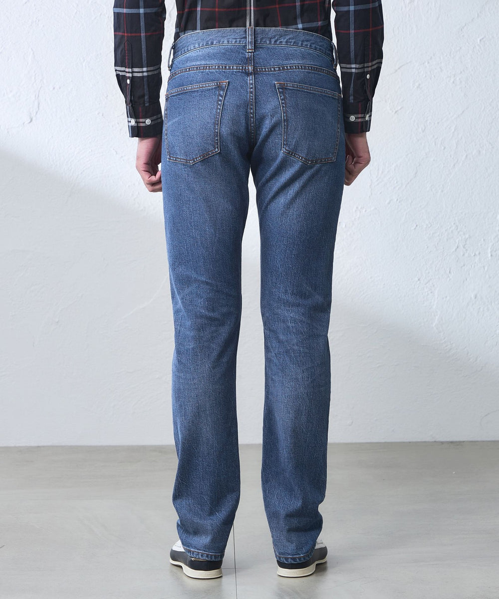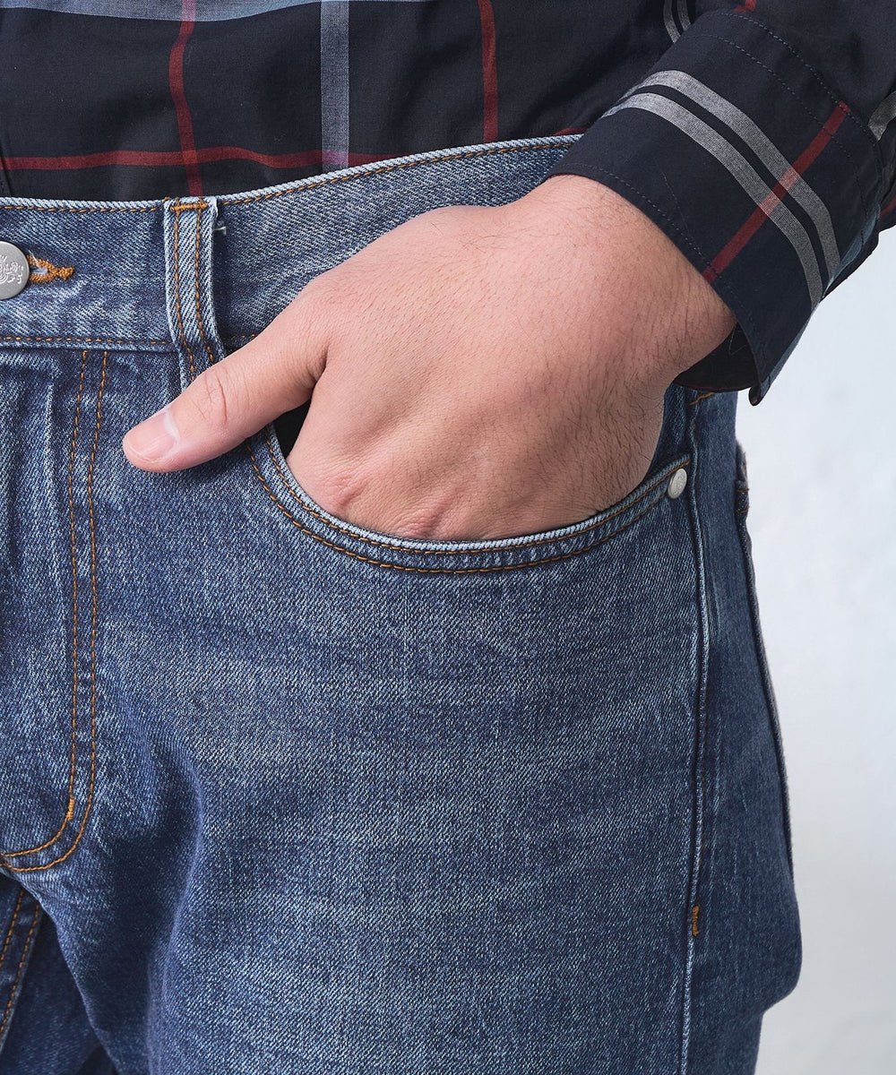 オリジナルメタル釦、適度なヴィンテージ加工などにもこだわりエッジを効かせたディテールの5ポケットデニムにしました。