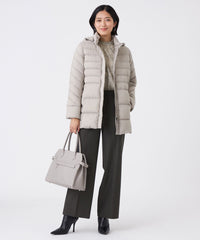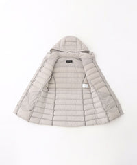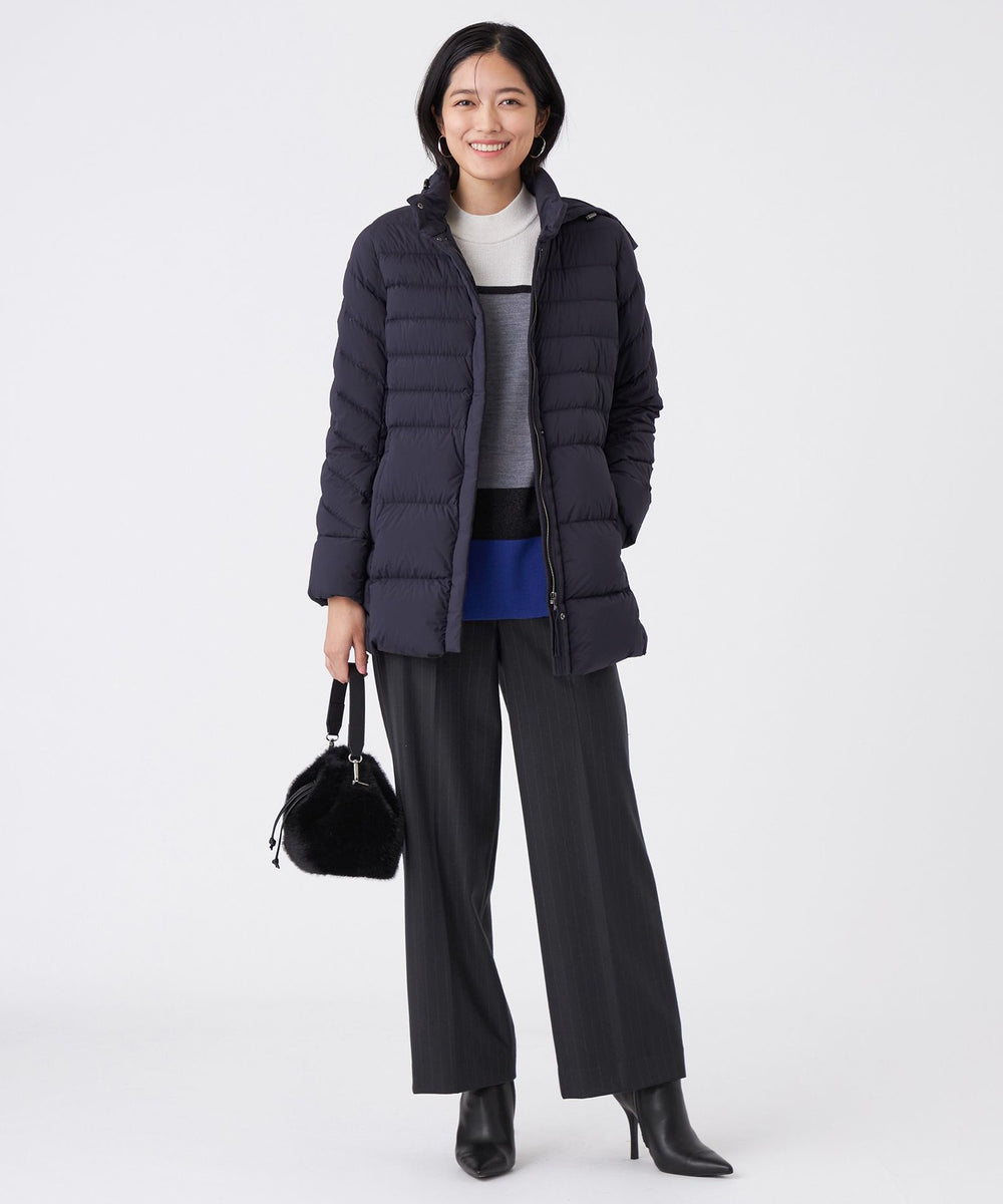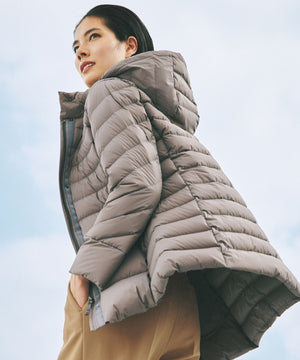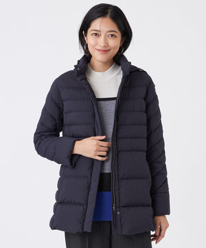 表地とダウンが軽量でストレッチ性があるので、抜群に着心地の良い防寒アウターです。袖の斜めステッチは身幅を細く見せる視覚効果があります。取り外しフード付きです。