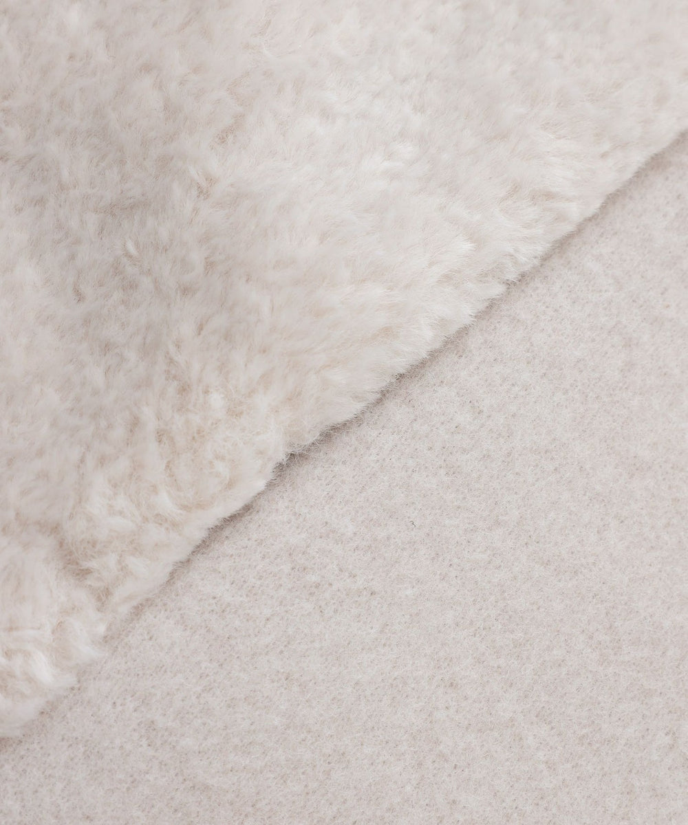 ムートンのようなフェイクファー素材で、ベースは布帛ではなくジャージ素材のため、柔らかな風合いが特長です。