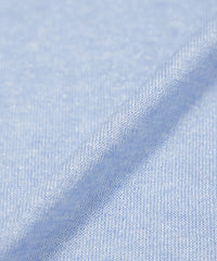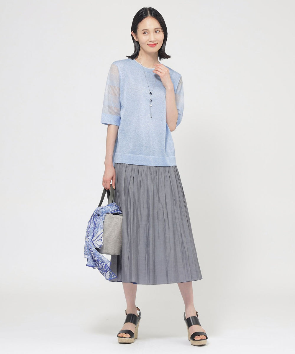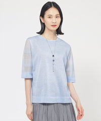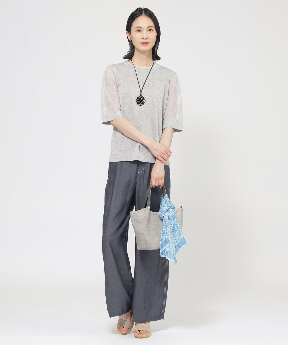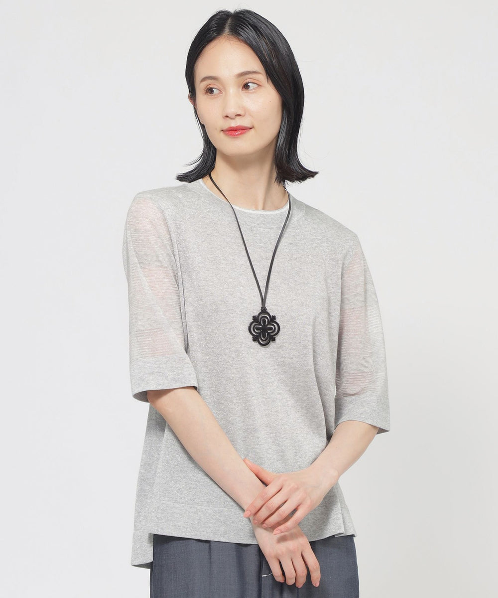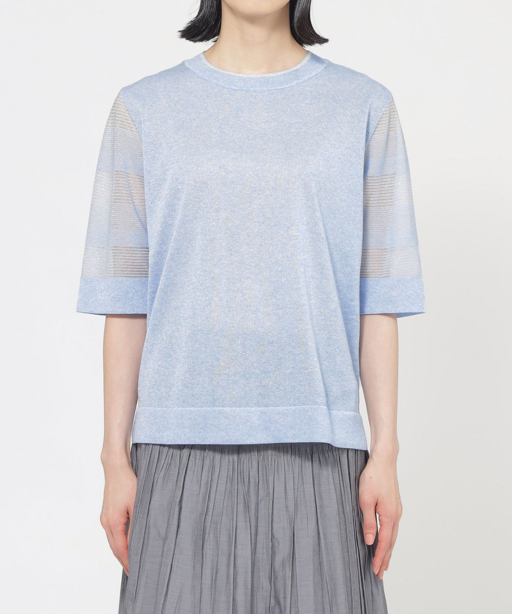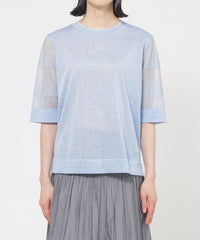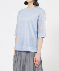 身頃はプレーンな天竺組織です。肌に触れる側はシャリ感の少ない綿ナイロンなので快適な着心地です。袖は透明糸を使用したシアーなボーダー組織で、テクニカルでニットらしい表現になっています。