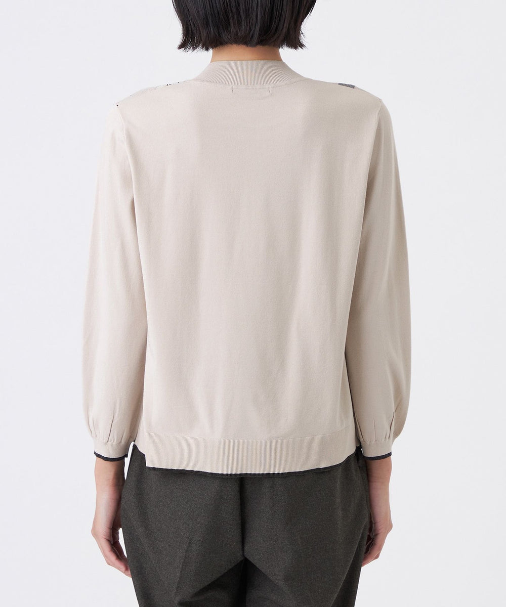 ほどよくストレッチの効いた素材で、部分的に編み組織や糸色の配色を変えることで立体感のある表情に仕上げています。