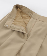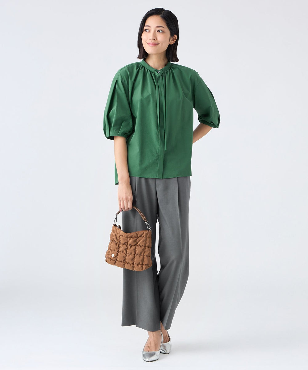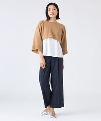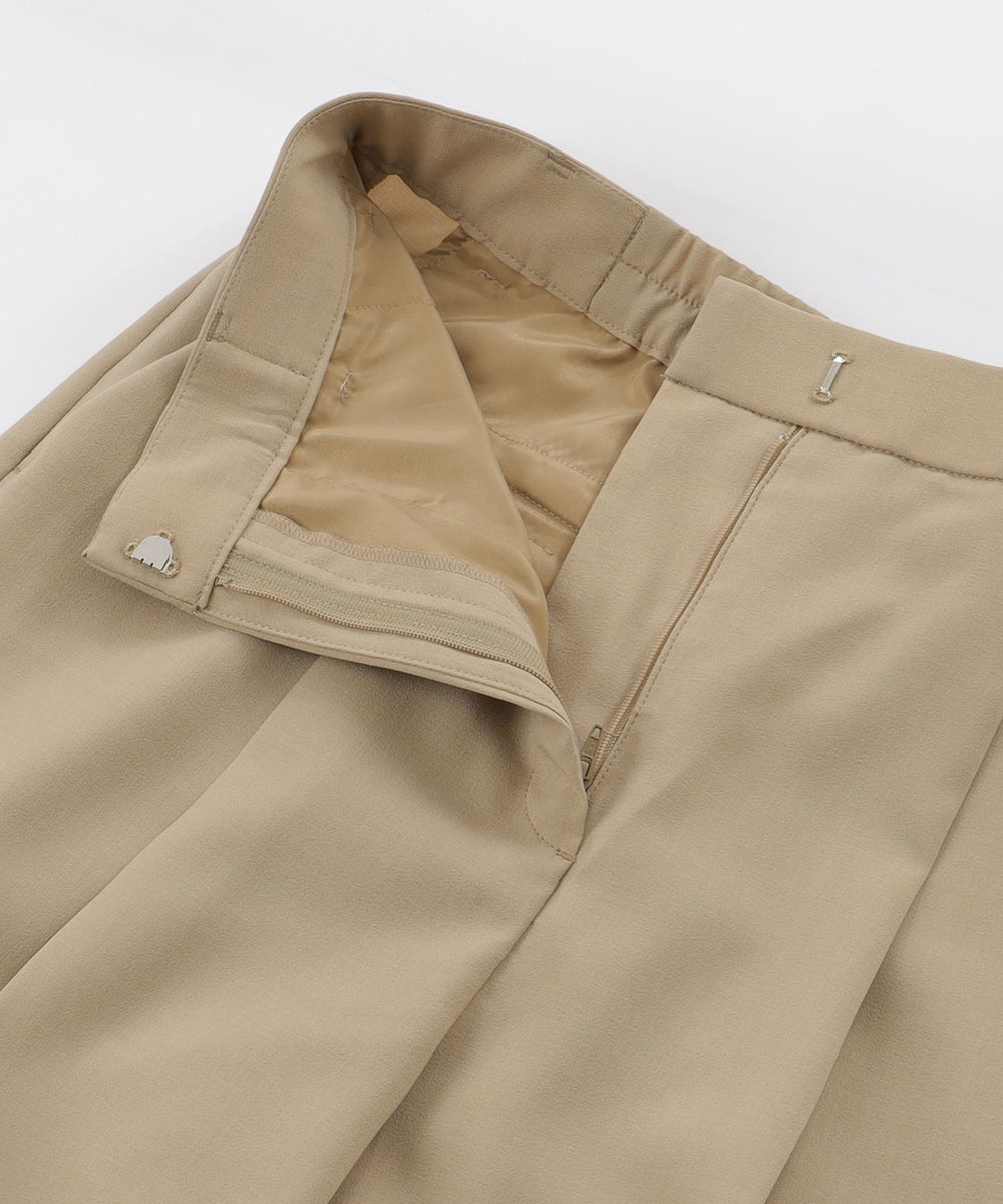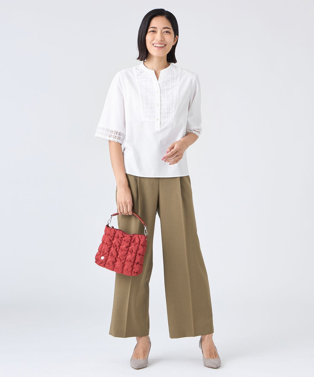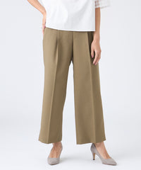膝の位置をやや高めに設定し、脚がすっきり見えるよう仕上げたセミフレアシルエットのパンツです。スタイルアップ効果のあるこだわりのパターンに、きちんと感のあるセンタープレスを入れています。ウエストはゴム仕様で、見た目と快適さを両立しています。