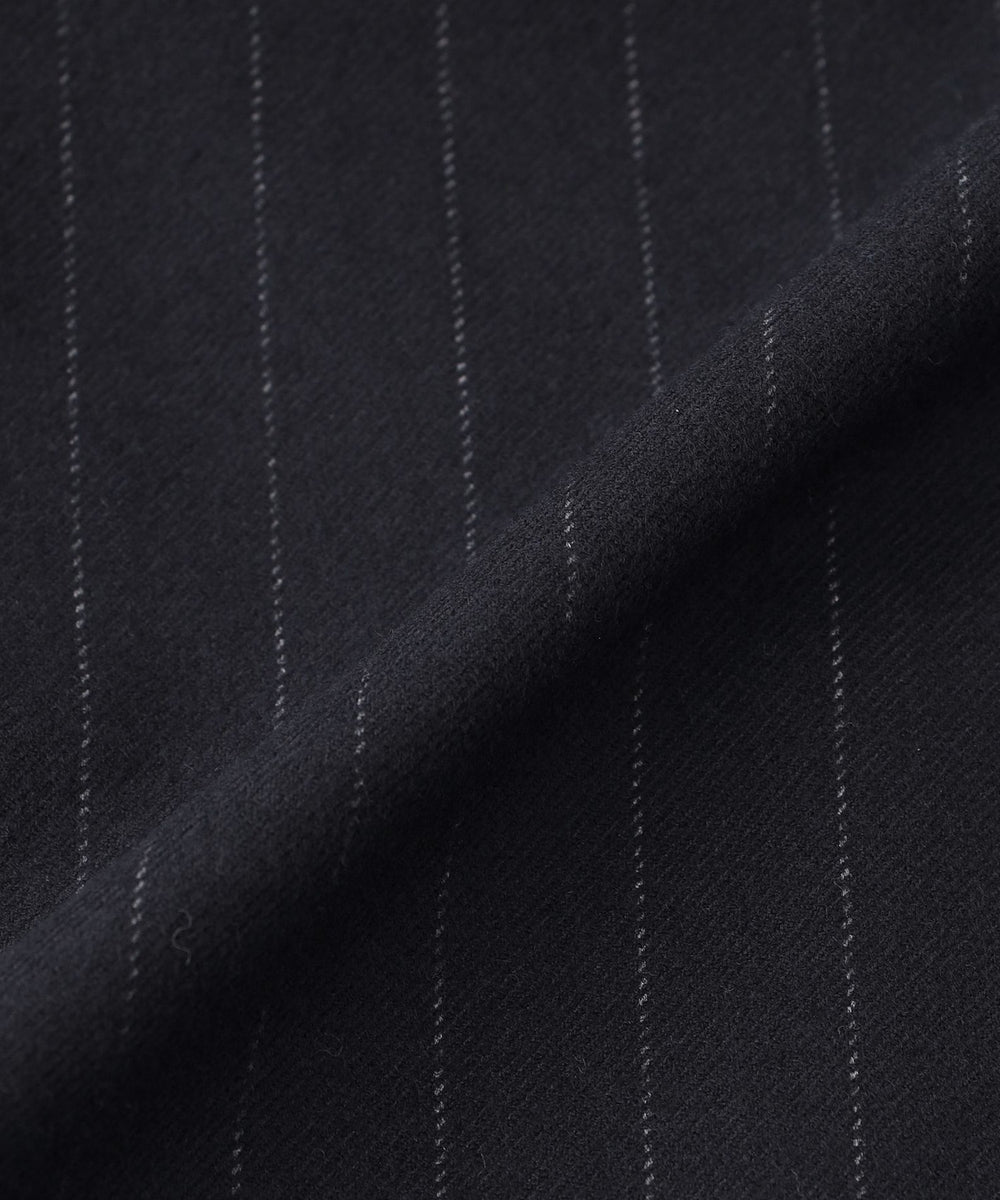 綾織りで織ったストライプの2WAYストレッチ素材です。表と裏の両面を細かく起毛する事によって生まれる、肌触りの良いタッチ・ソフトさ・ウォーム感がポイントです。2WAYストレッチのため、仕立て映えも良く非常に履き心地の良い素材です。