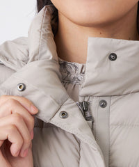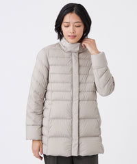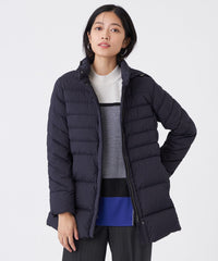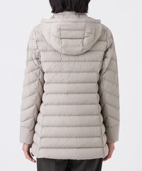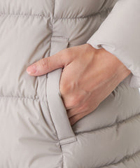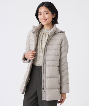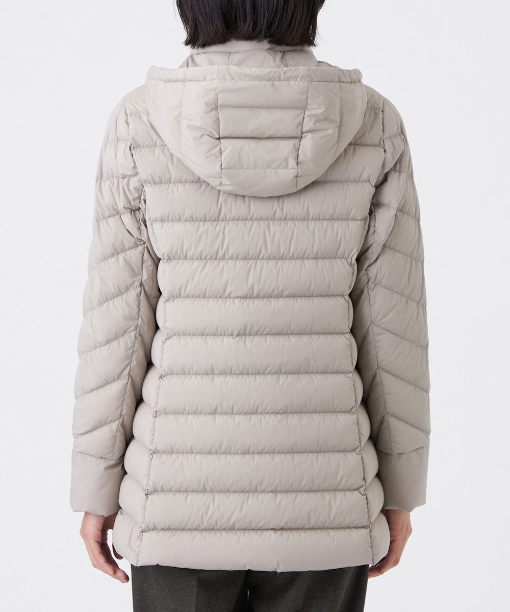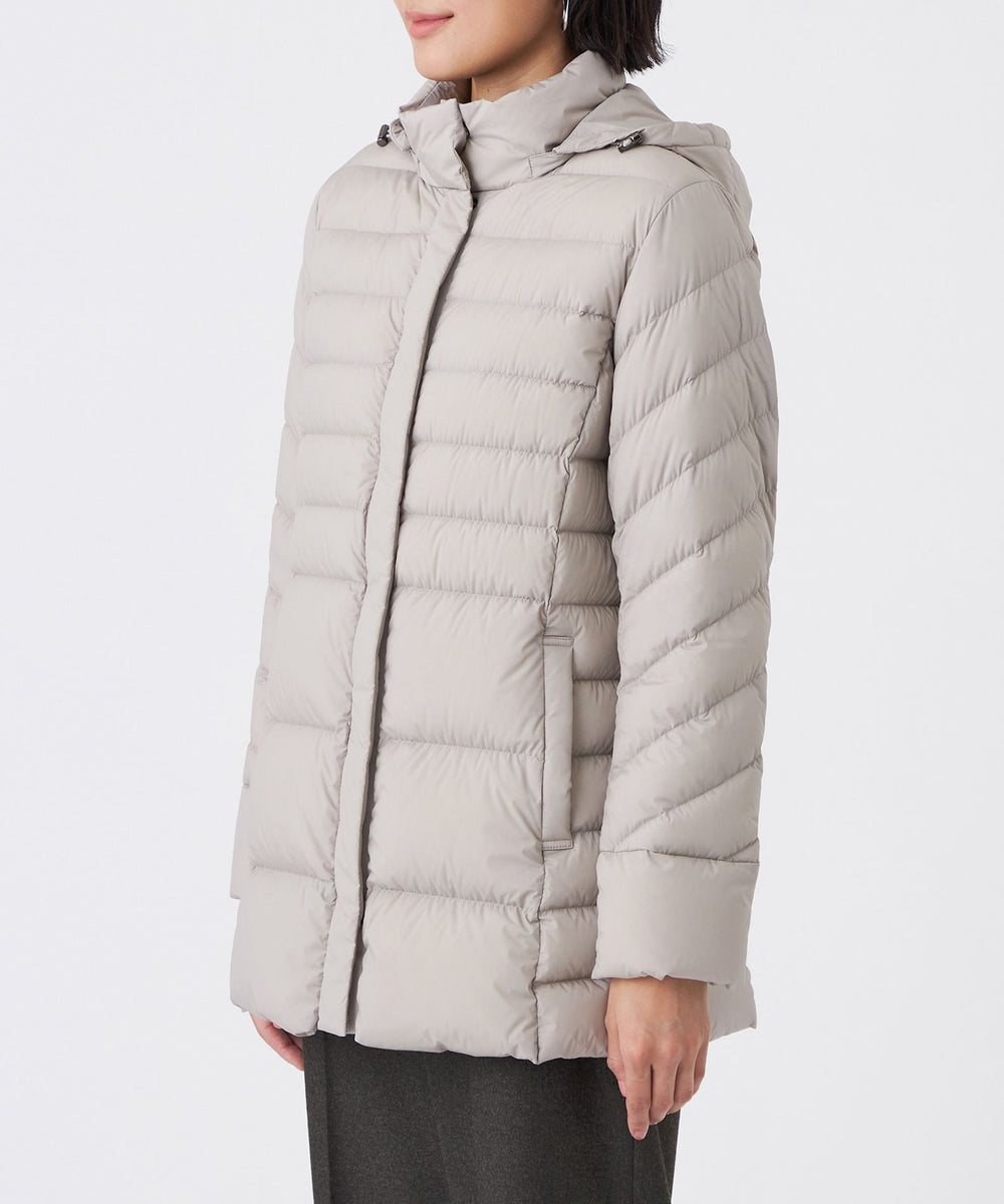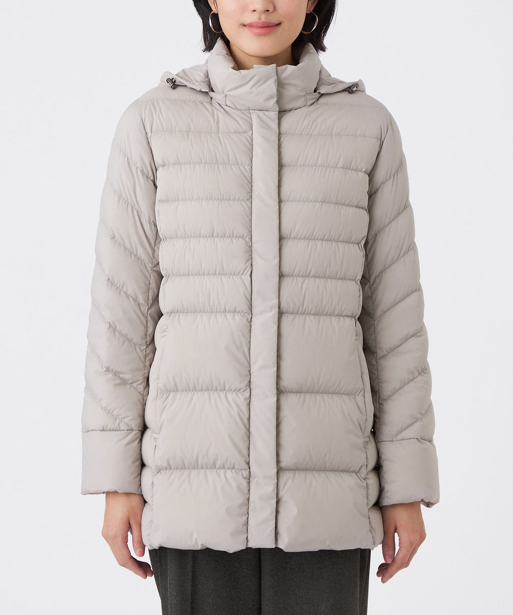 表地とダウンが軽量でストレッチ性があるので、抜群に着心地の良い防寒アウターです。袖の斜めステッチは身幅を細く見せる視覚効果があります。取り外しフード付きです。