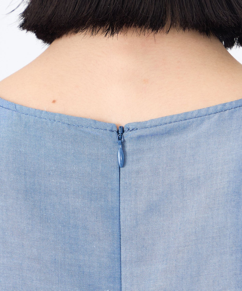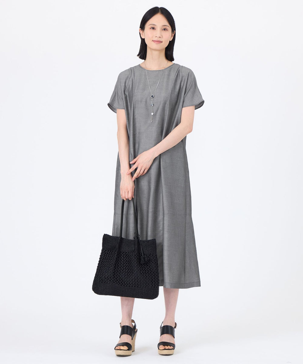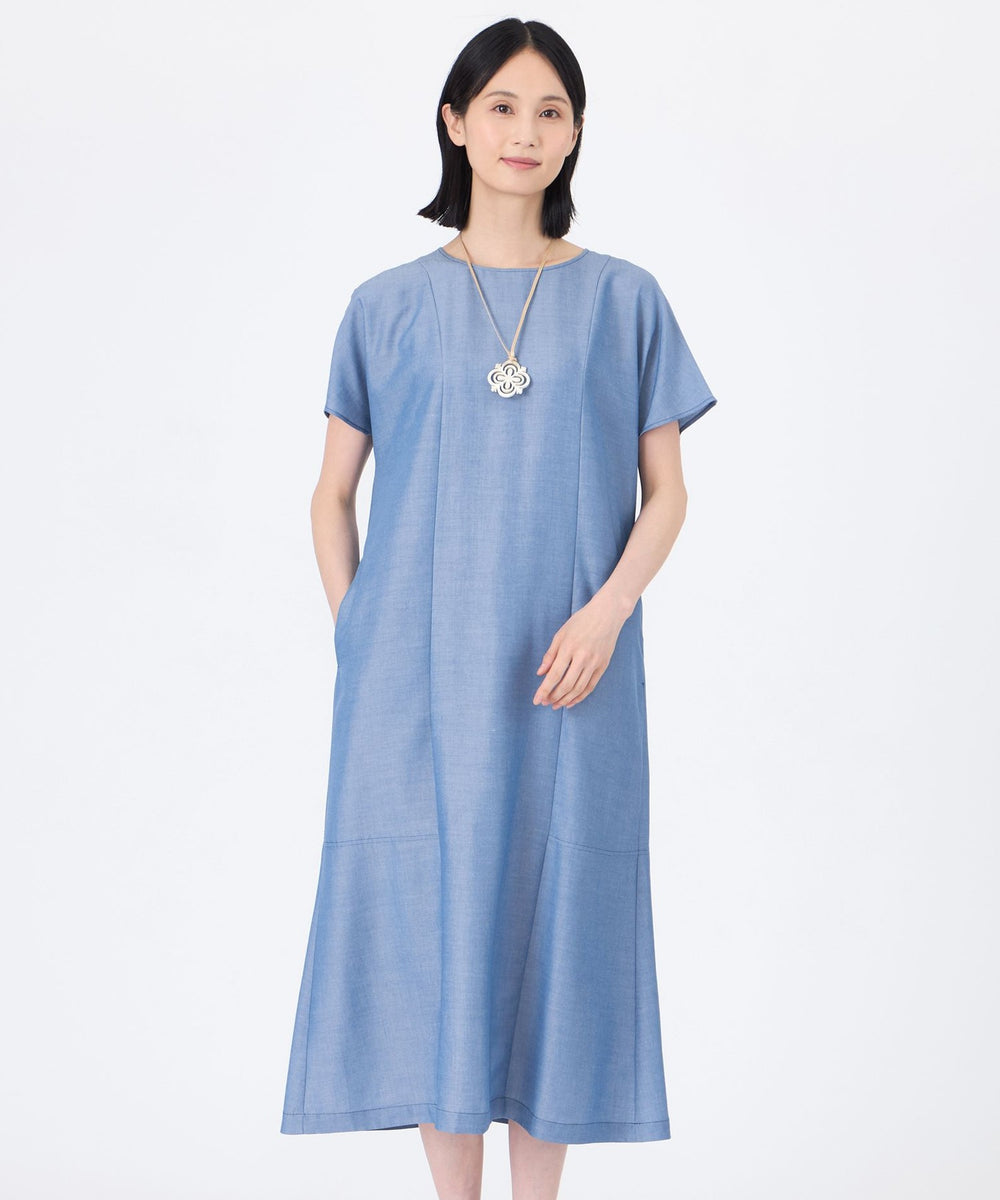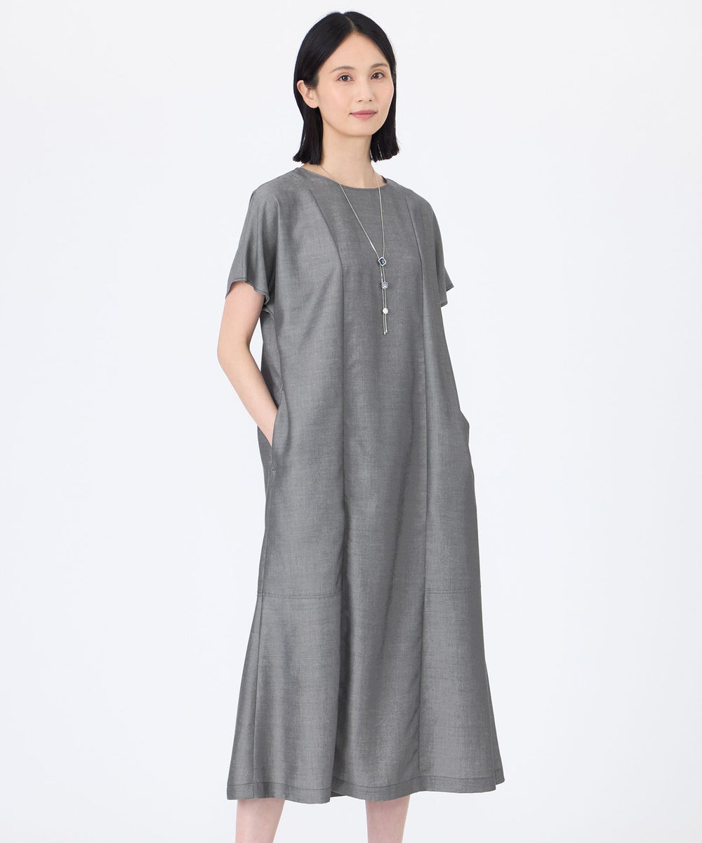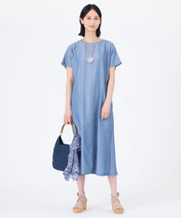 上品な光沢のあるダンガリー素材を使用した、涼しげなフレンチスリーブのワンピースです。身体から離れるゆったりとしたシルエットで、快適にお召しいただけます。
