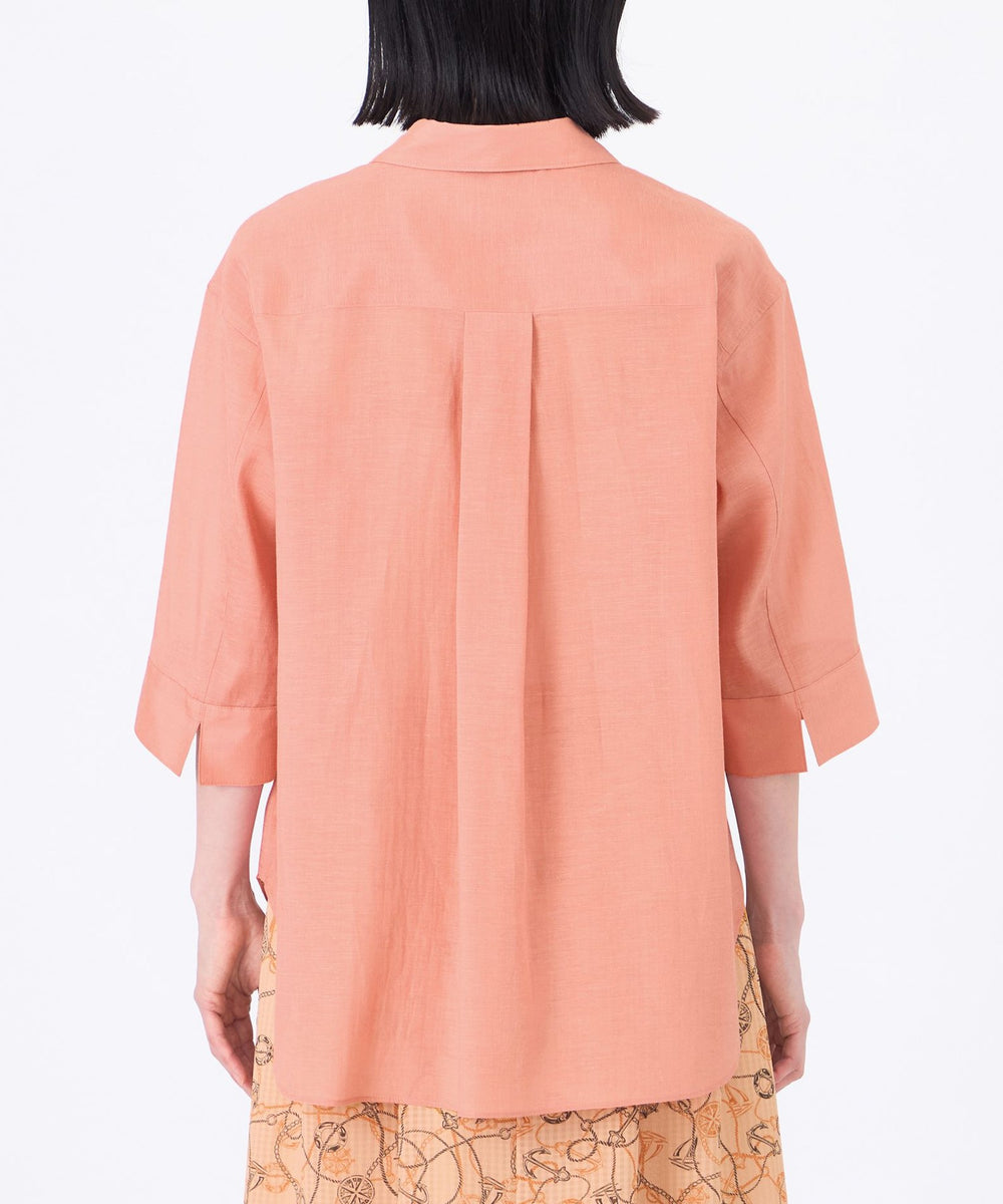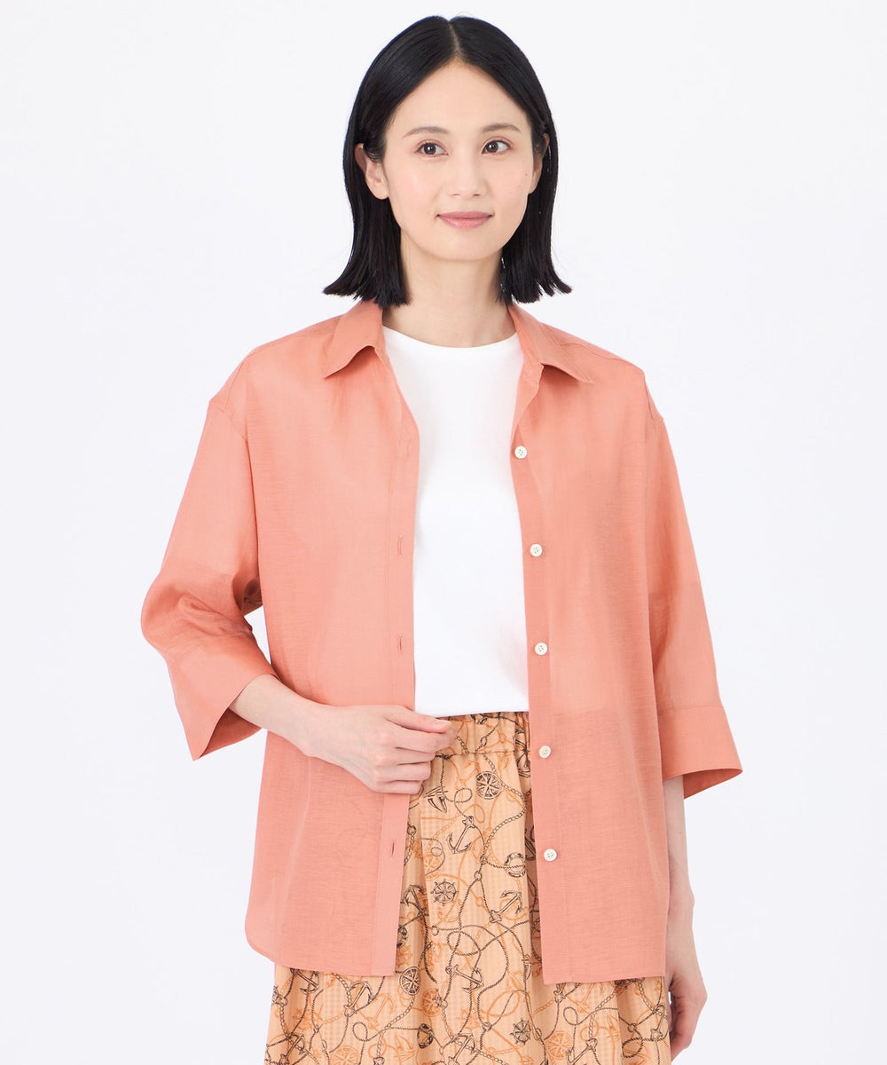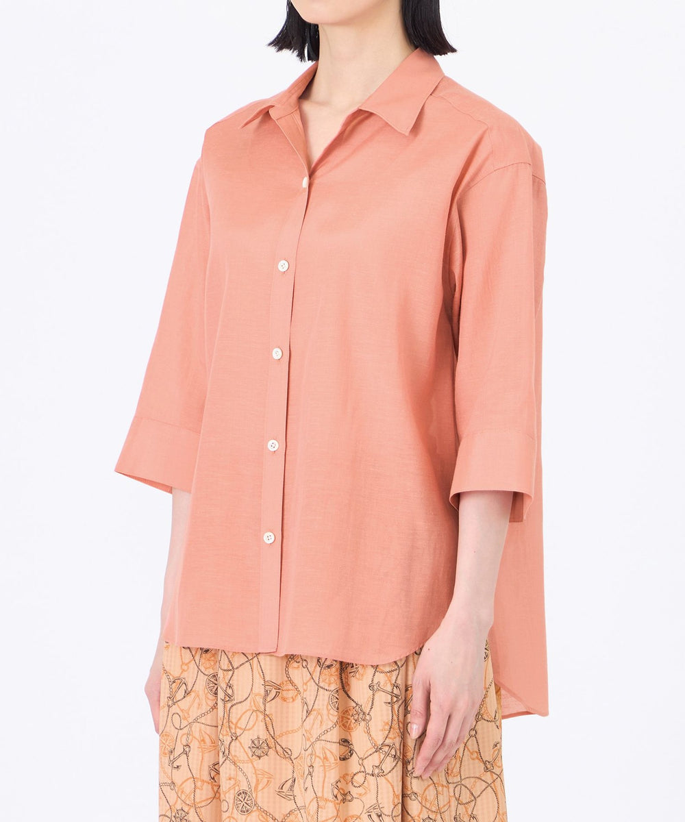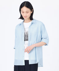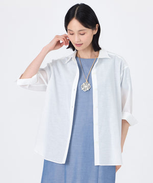 襟にワイヤーが入った7分袖シャツです。首元に立体感を出せるデザインで、袖口のスリットにより袖丈の調整も可能です。一枚で着るのはもちろん、羽織りとしてもお使いいただける便利な一着です。